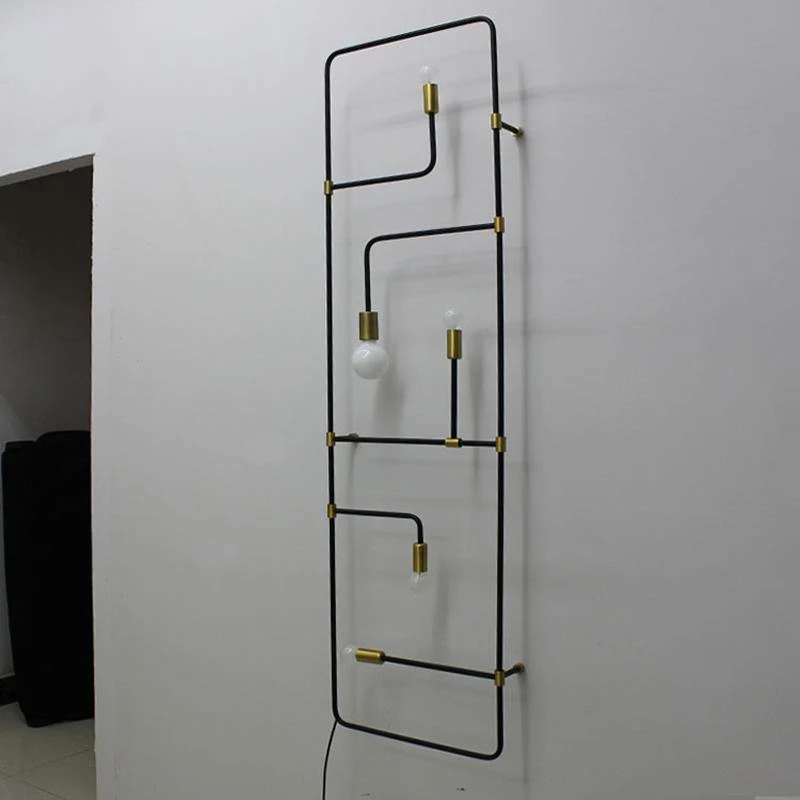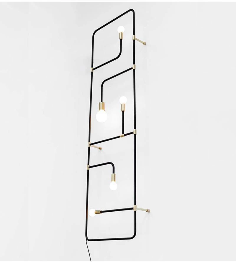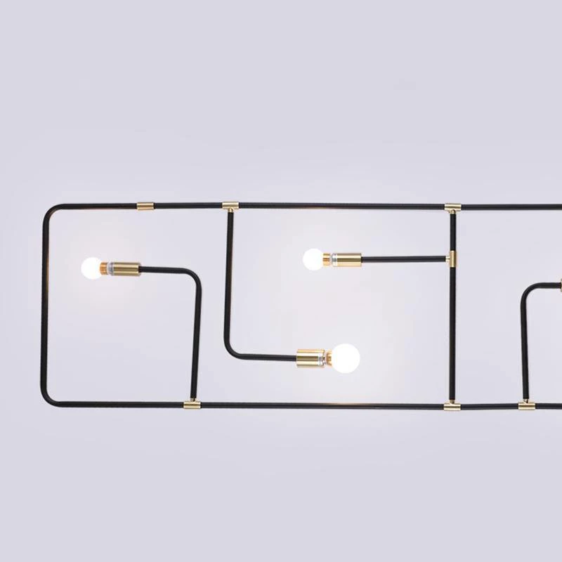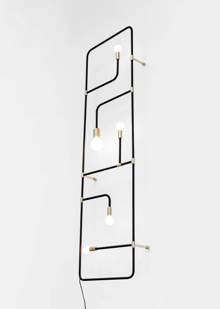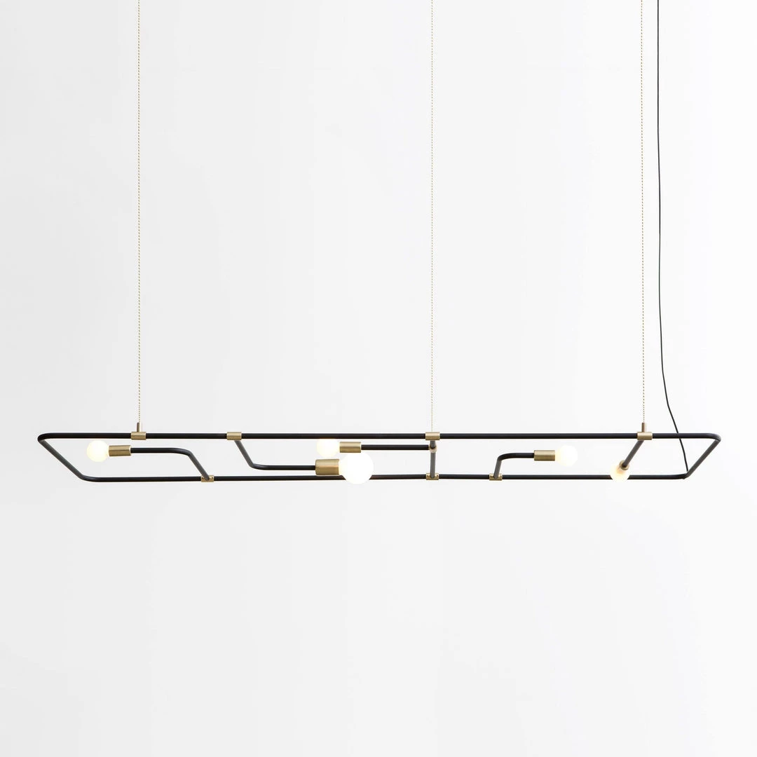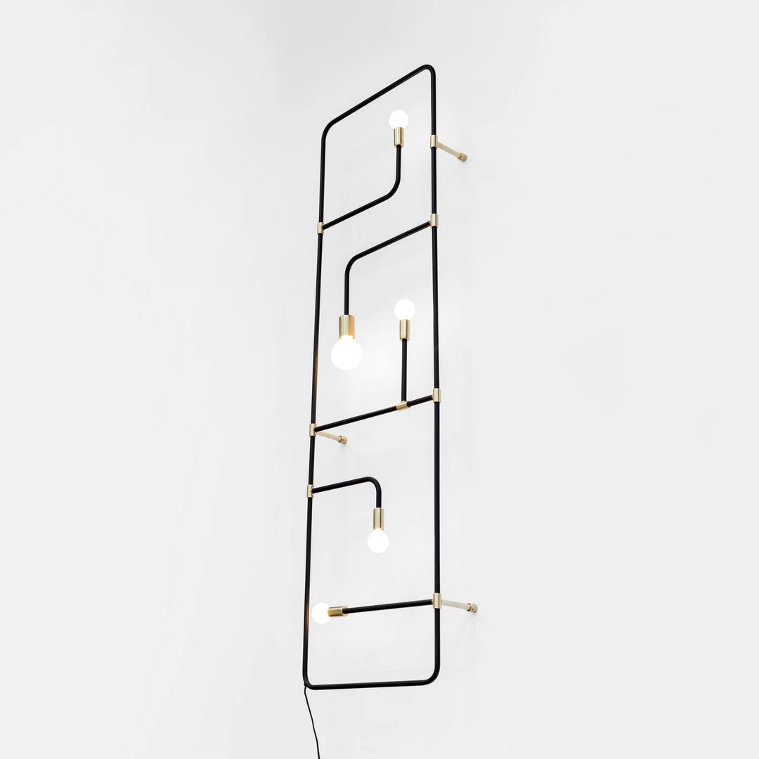 The Beaubien Collection’s strong black lines bend in and out of space, moving effortlessly between simplicity and ornamentation. Round and cubic brass connectors complete the lamps’ structures and add a rich material contrast to the powder-coated rods.