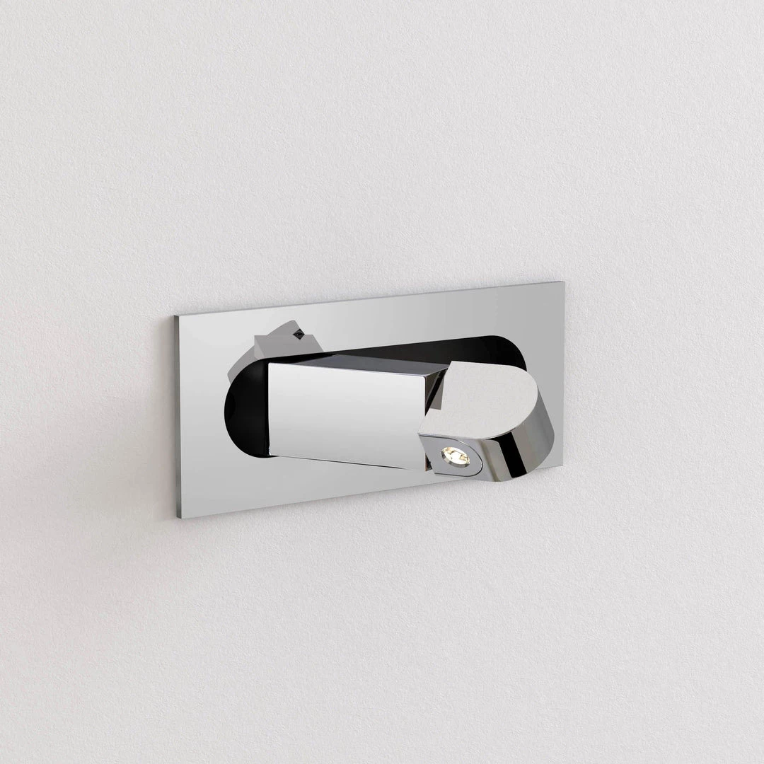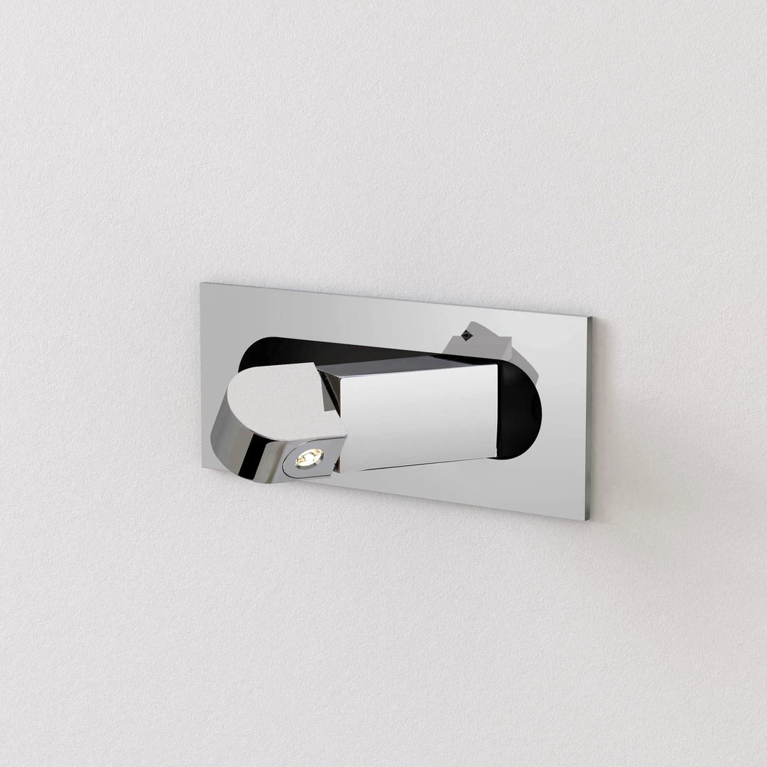 This fitting has the unusual functionality of fitting flush inside its backing plate, and with a push at one end of the fitting, the body comes out and the lamp switches on.