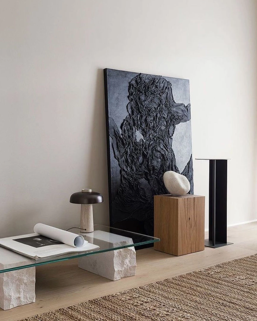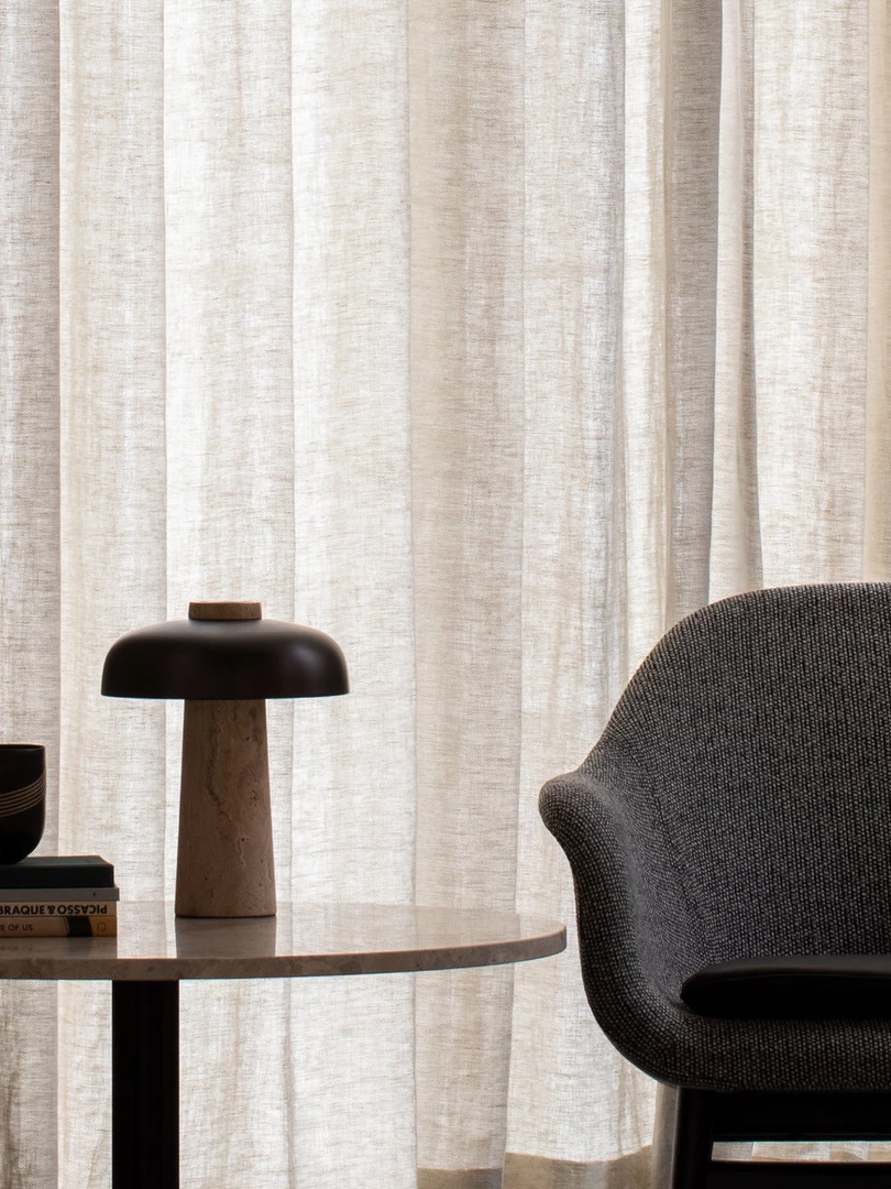 The light diffuses evenly across the unworked stone, left raw to allow the light to highlight its natural imperfections, revealing shadows and an intriguing color play that seems to stem from the base itself. The Reverse Lamp casts a warm light on a bedside table or subdued light on a cabinet surface, making it an elegant and characterful solution to a multitude of lighting needs.