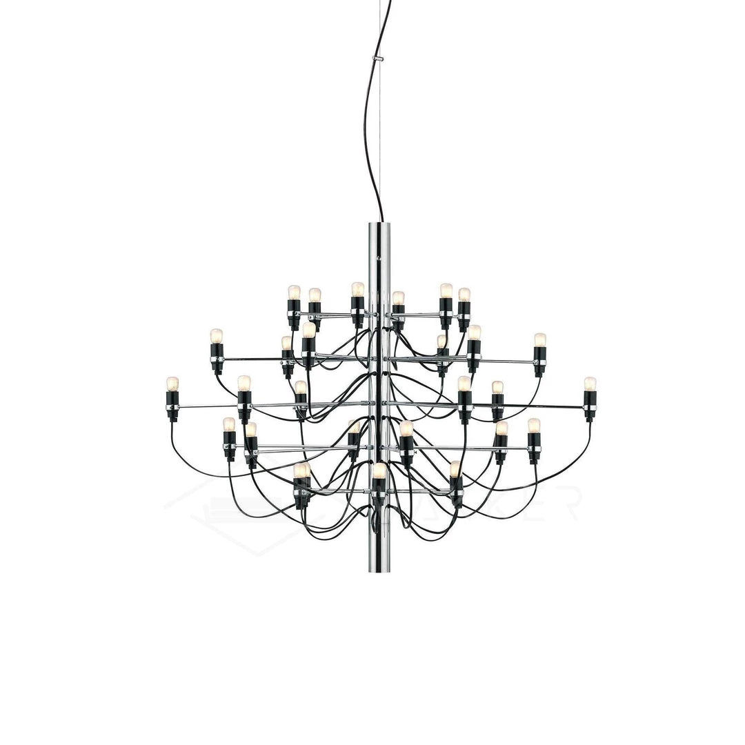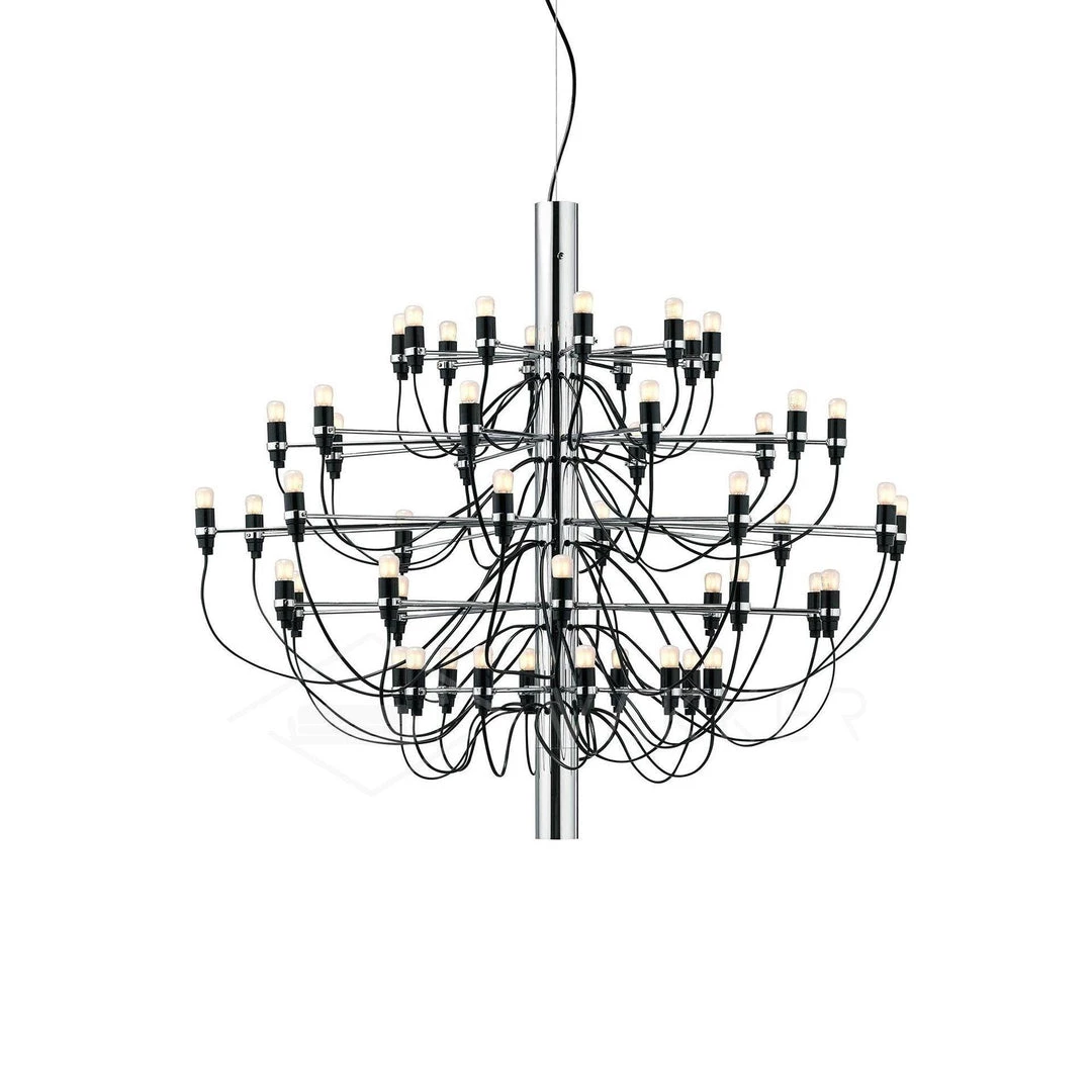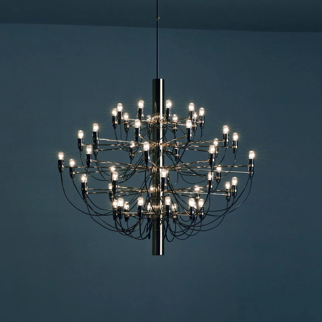 Mod 2097 by Gino Sarfatti holds 18, 30, or 50 incandescent bulbs, Suspension lamp providing diffused light. Steel central structure with brass arms, both available either chromium-plated, black, or golded. Steel ceiling fitting.