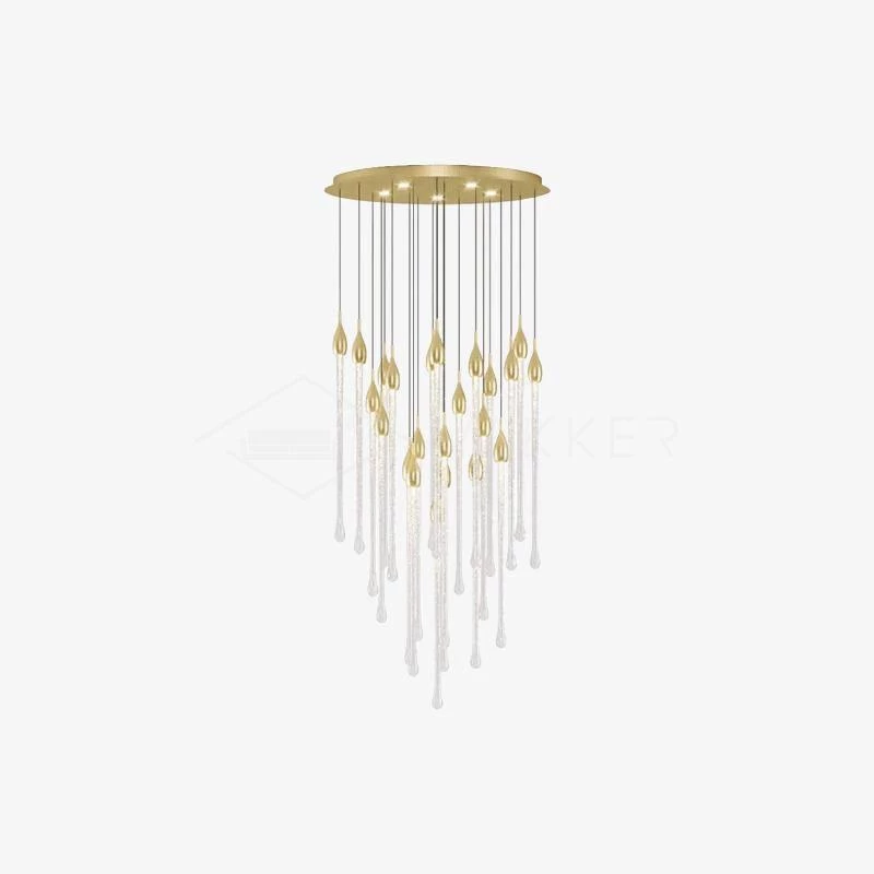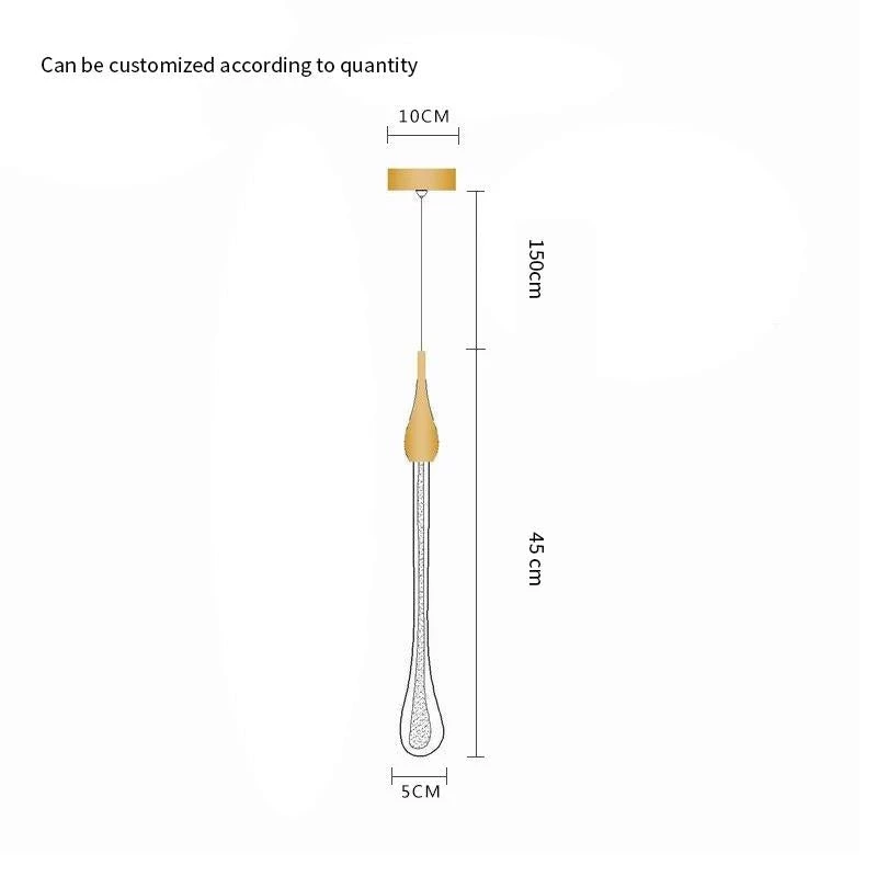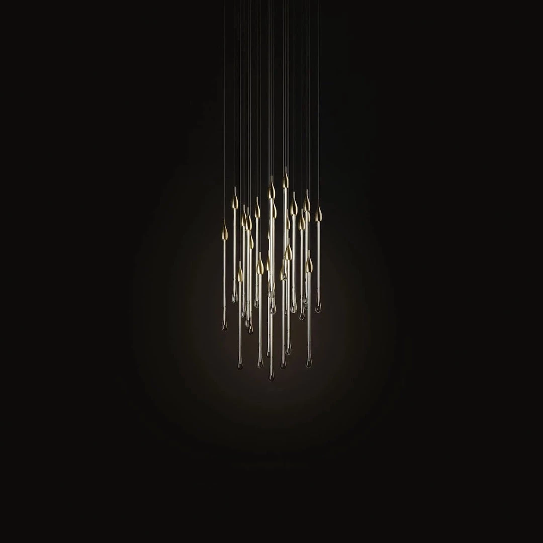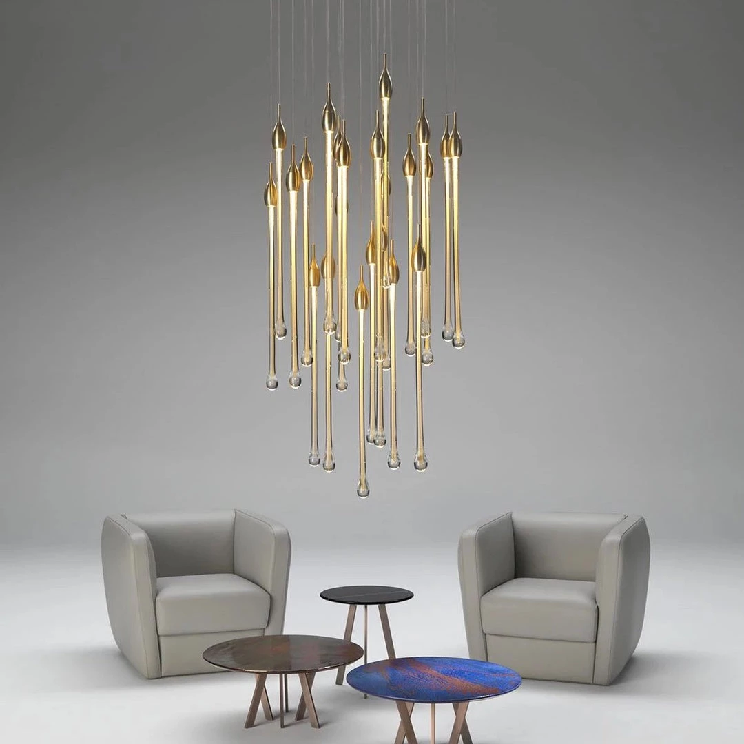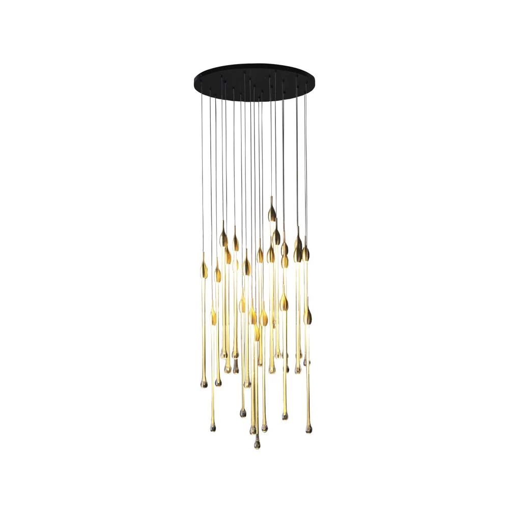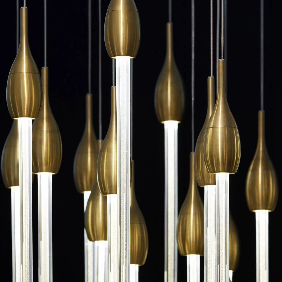 Allure hanging light shown in glass with hanging golden leaf powder. Hanging golden leaf powder reflects off the lighting encased in the crystal components. LED lighting device is included. Suspended cable in transparent Teflon. Available the candle-shaped version –tapered down- and the curved version. Lamps can be combined in multiple configurations in which each element is positioned at different height.