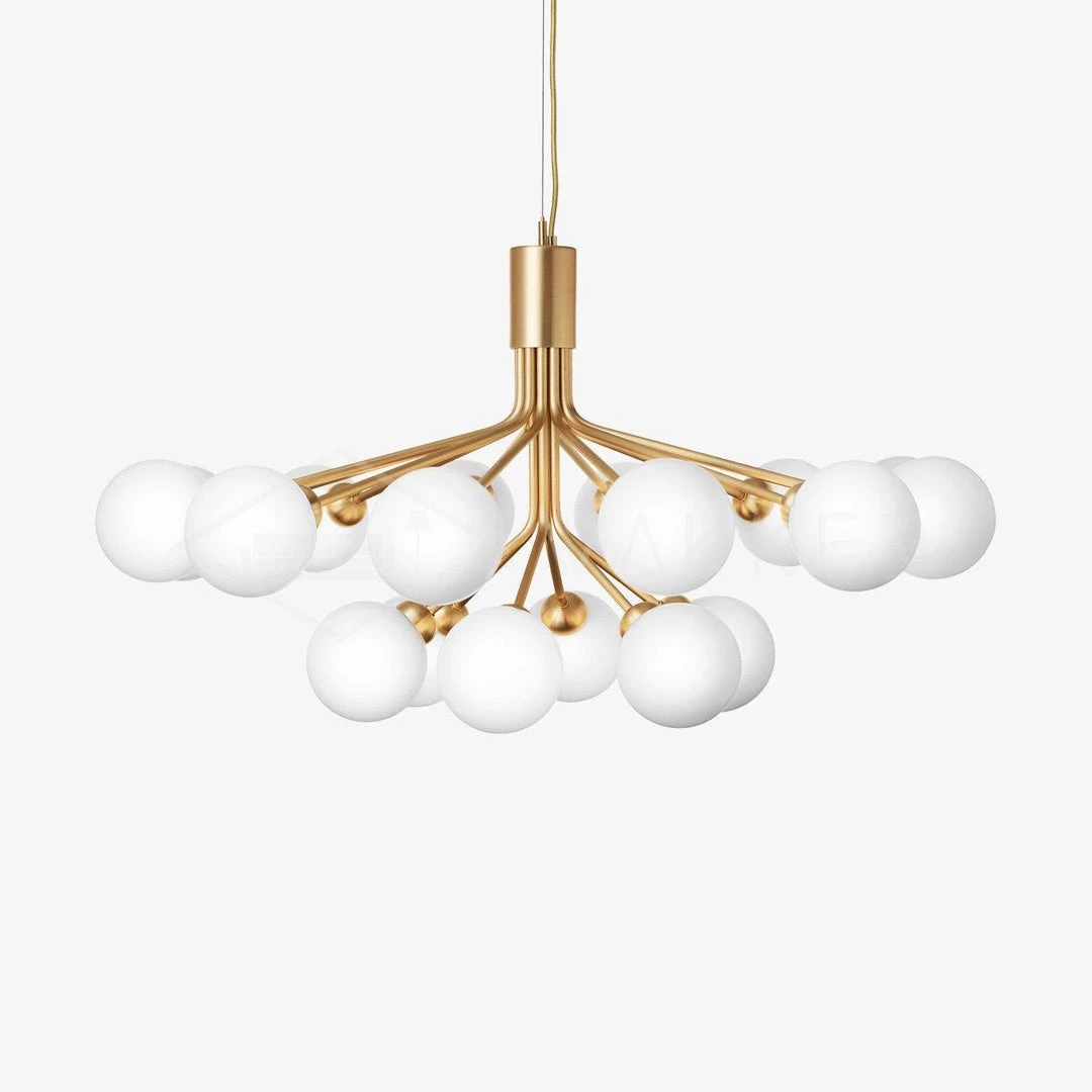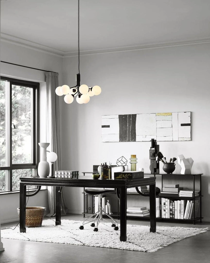 With inspiration from flowers, Sofie Refer has designed the new chandelier collection, Apiales. The collection consists of two chandeliers with 9 or 18 mouth-blown glass globes and are available in golden Brush Brass finish or the smooth Satin Black. From a specially-produced canopy, the arms unfold like flower stalks from which light is spread with grace.