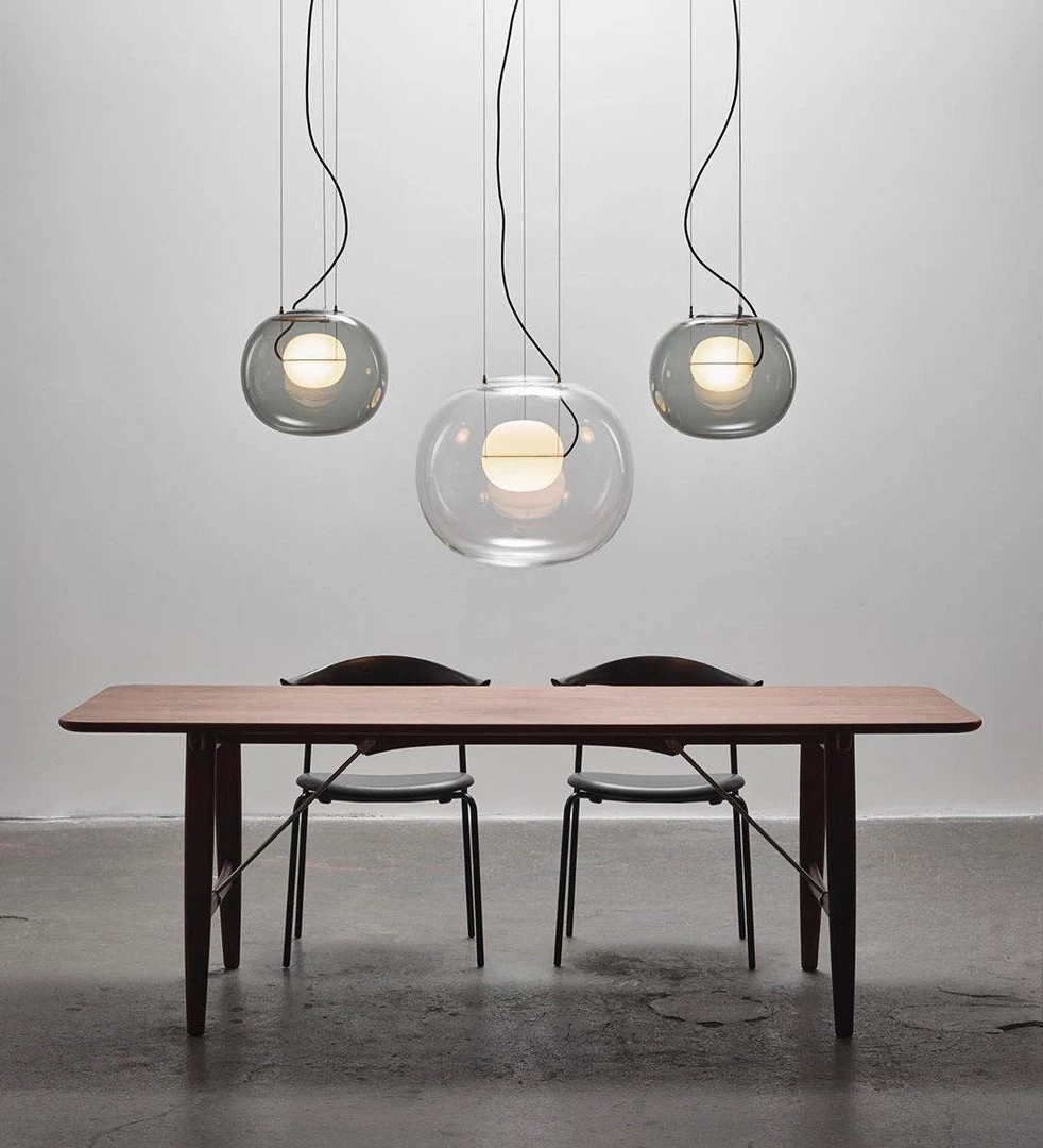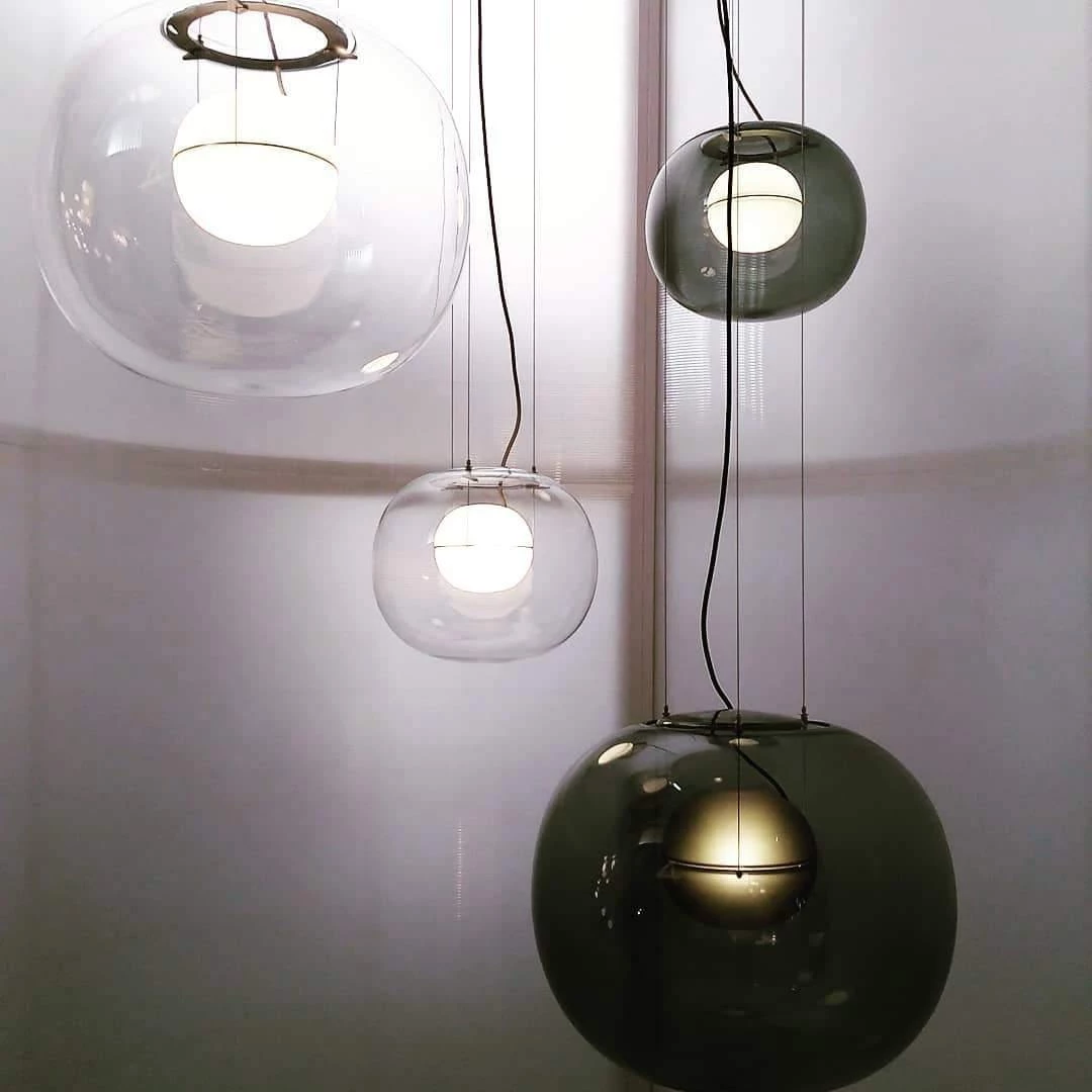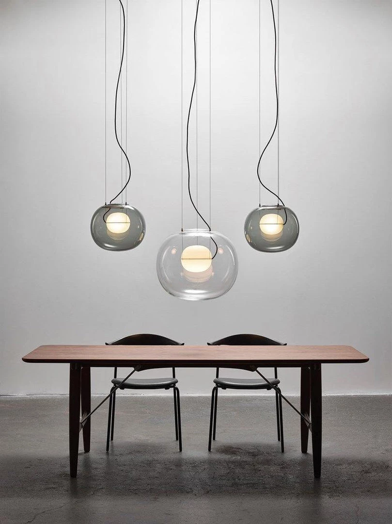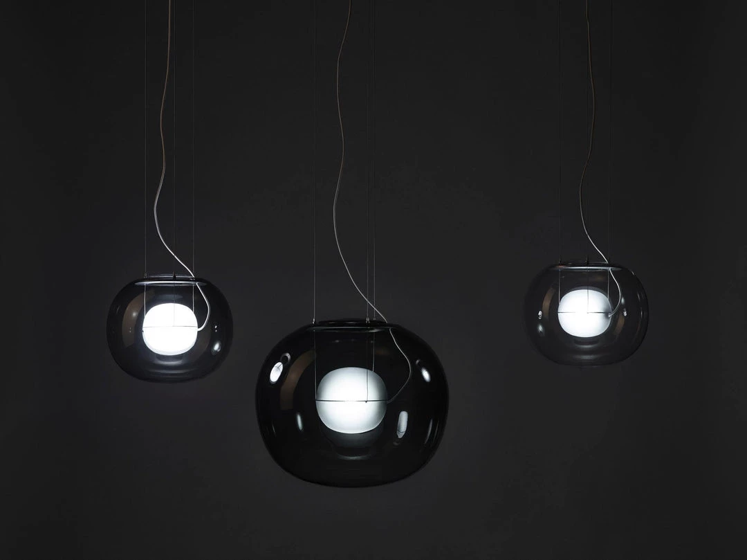The sophisticated design of a bubble suspended in the center of a large sphere evokes a sense of levitation. Outer glass available with a glossy finish in colors: transparent and smoke grey transparent. The inner glass comes in a matte finish in colors: triplex opal, smoke grey transparent, red transparent and light pink transparent. Big One collection is available in two sizes.