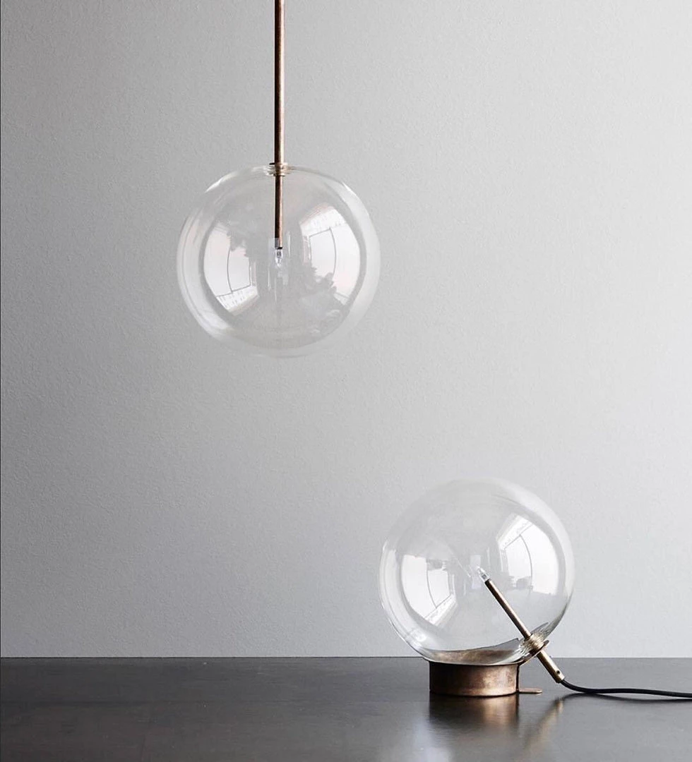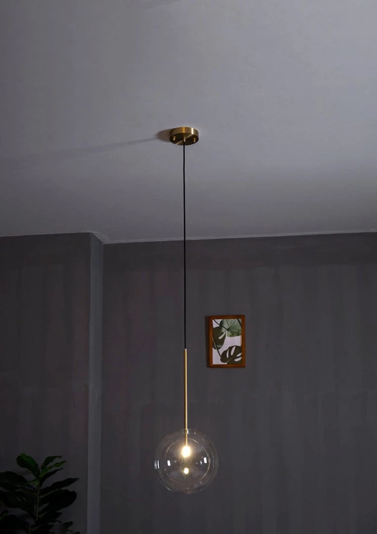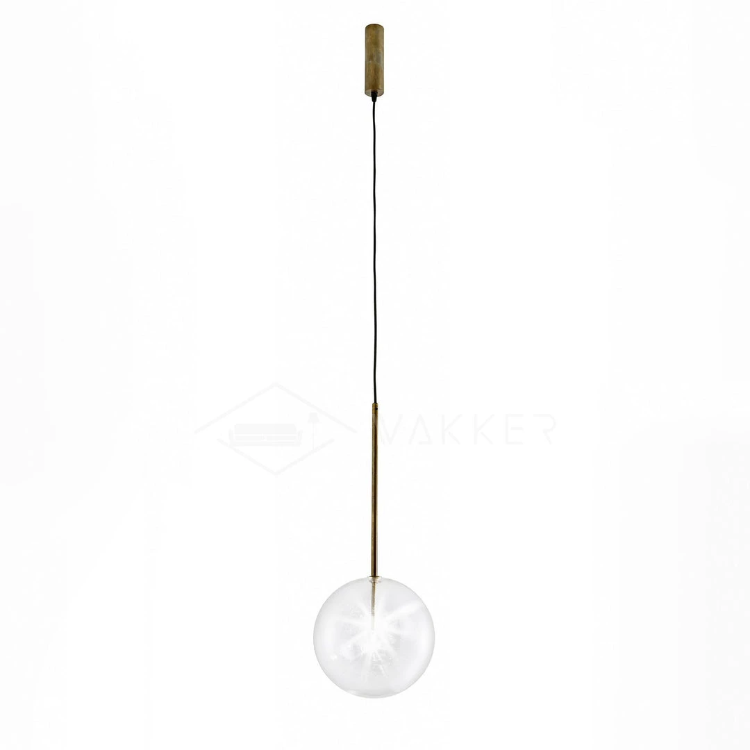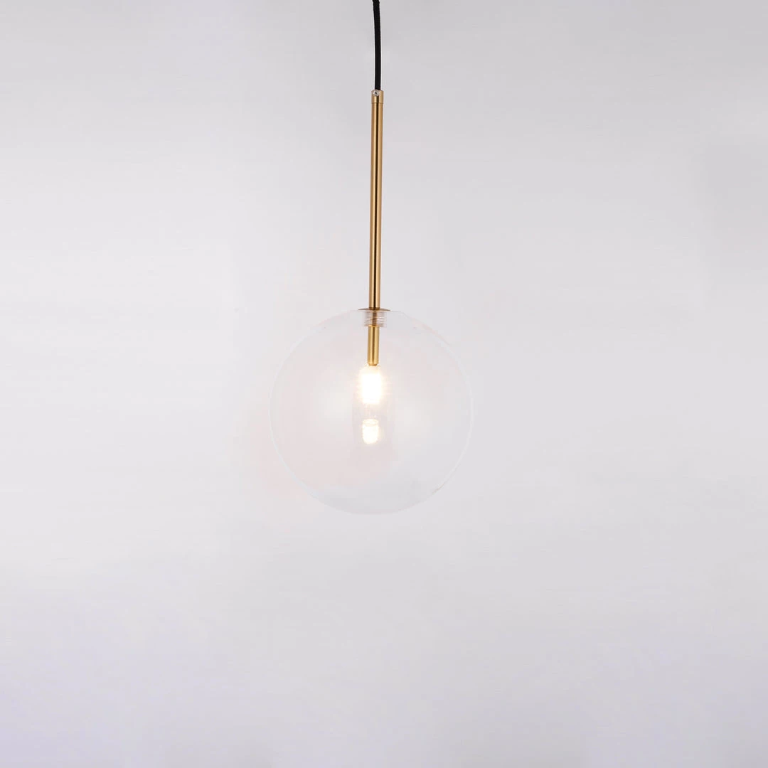 Hanging lamp with LED point light (G4 ). Transparent blown glass sphere. Metal parts in hand burnished brass. The hand-burnished brass finish looks naturally spotted and irregular. Due to this craft made processing, each product is unique and exclusive.