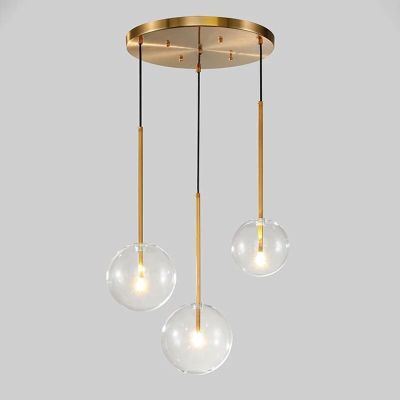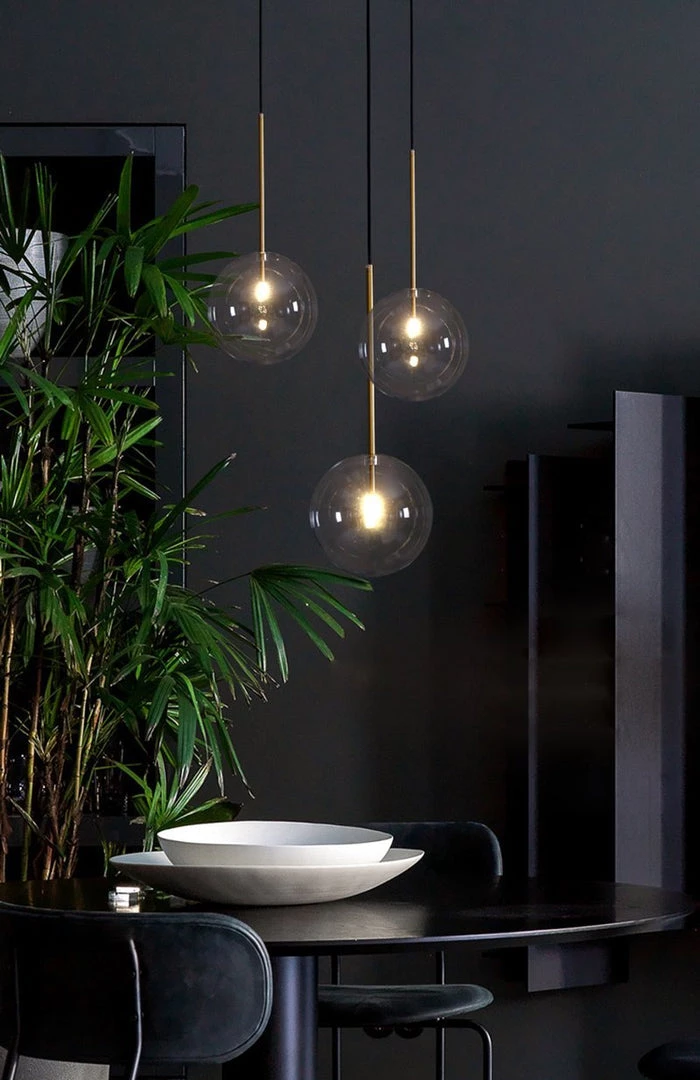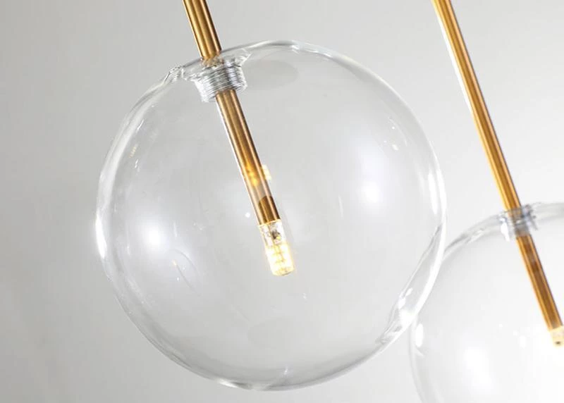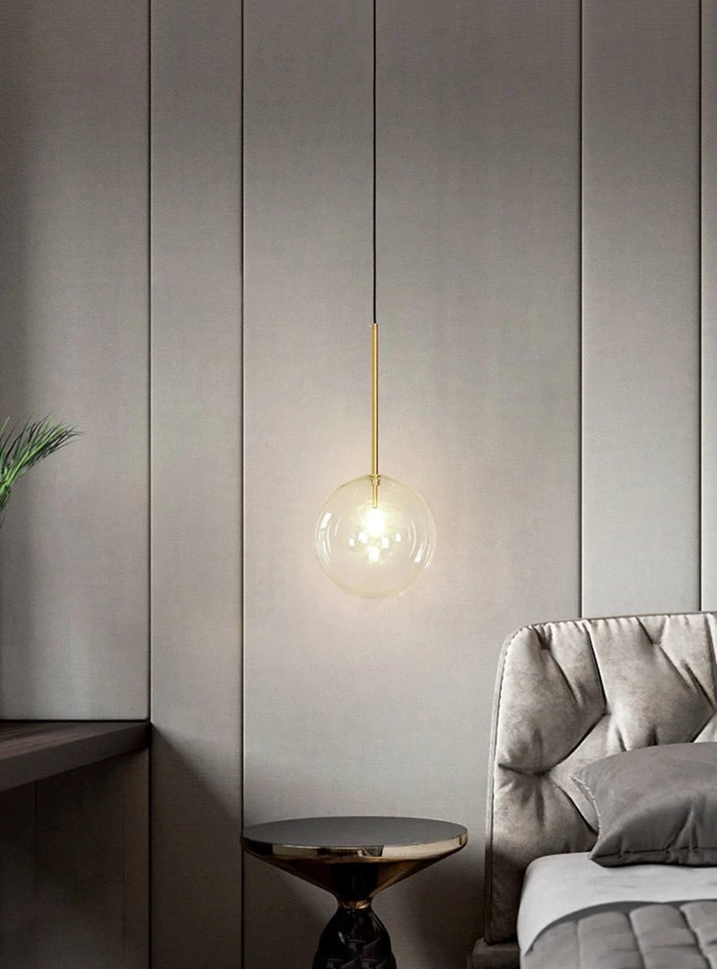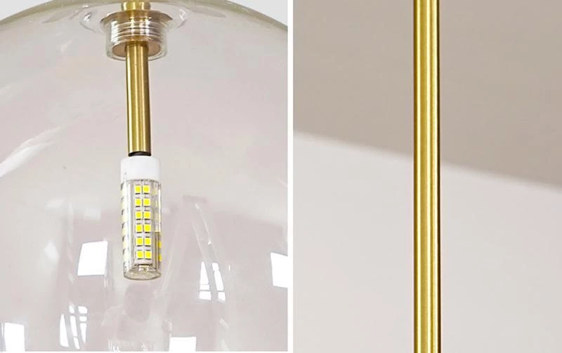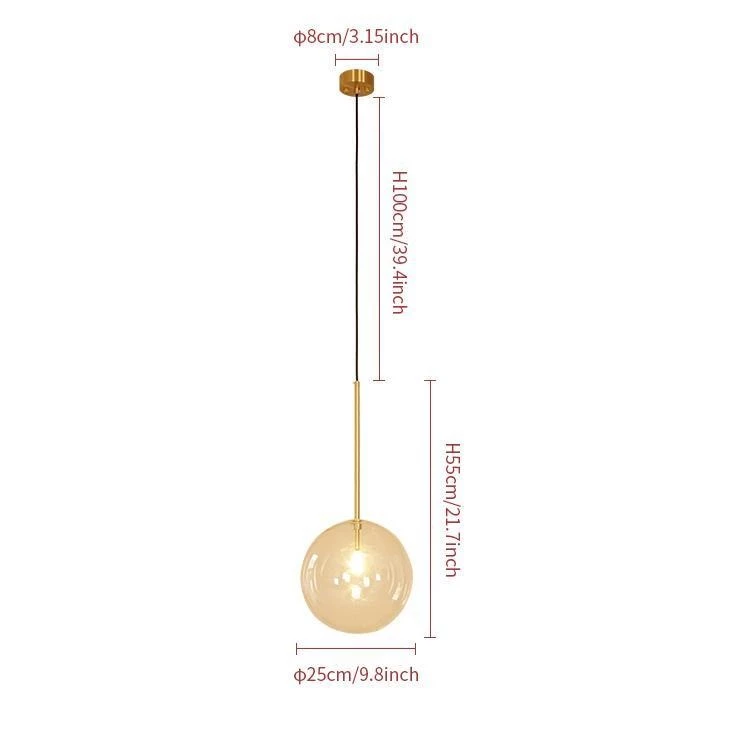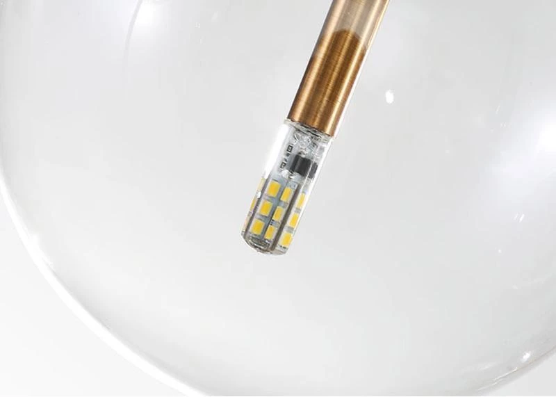 Hanging lamp with LED point light (G4 ). Transparent blown glass sphere. Metal parts in hand burnished brass. The hand-burnished brass finish looks naturally spotted and irregular. Due to this craft made processing, each product is unique and exclusive.