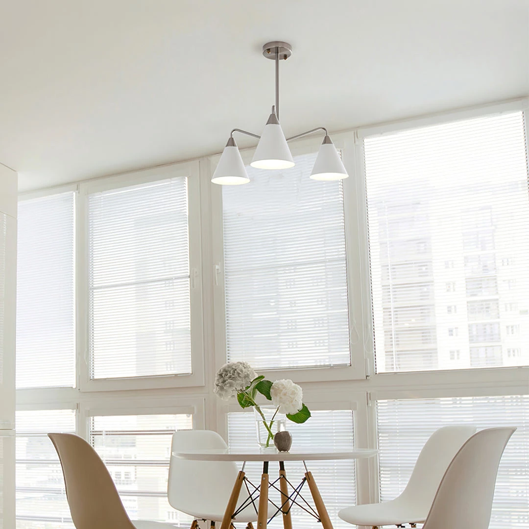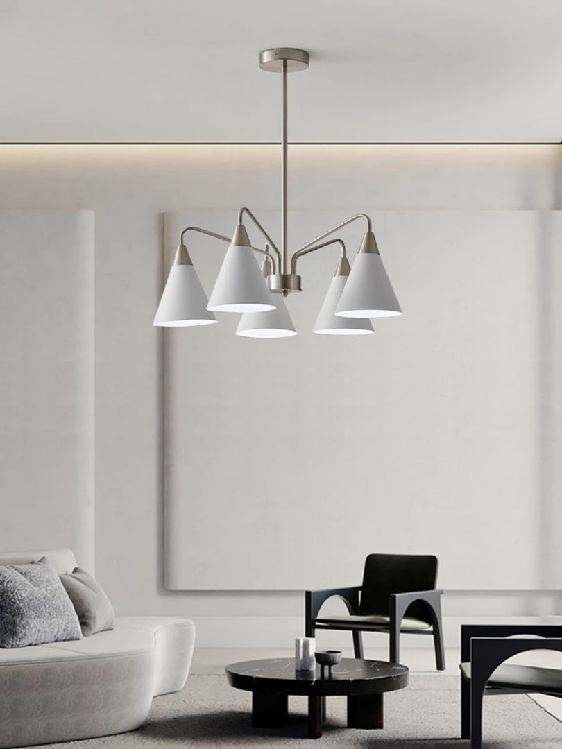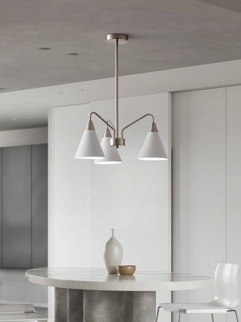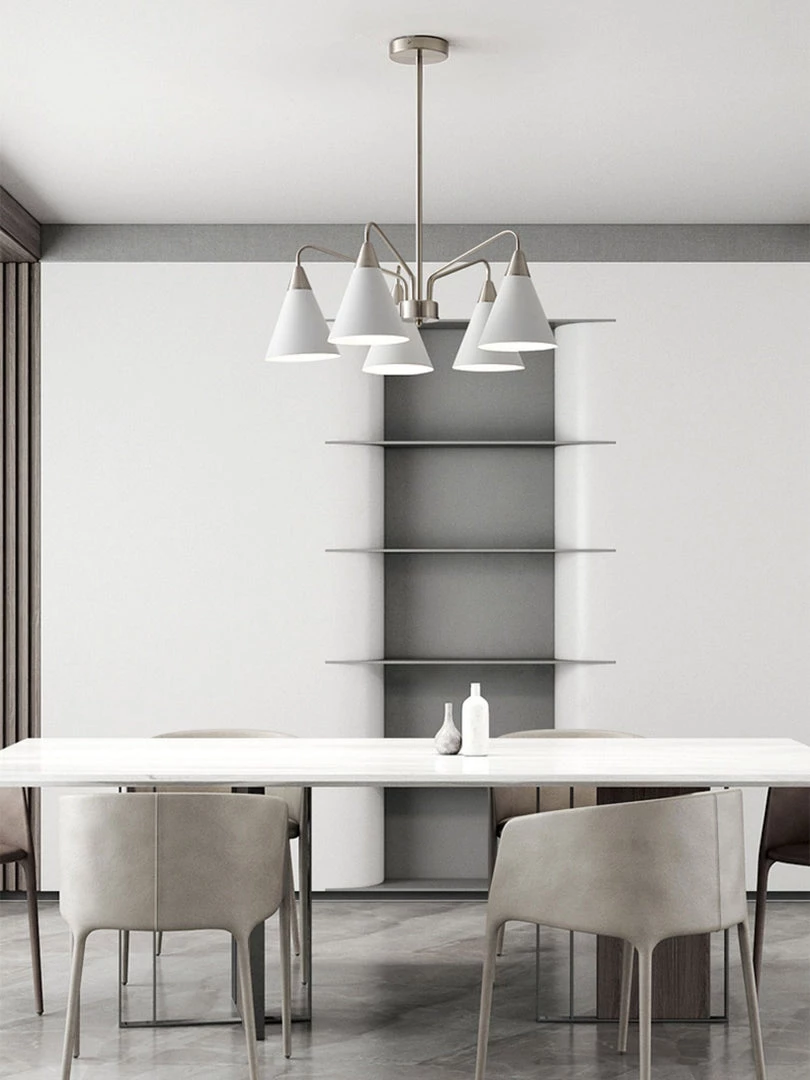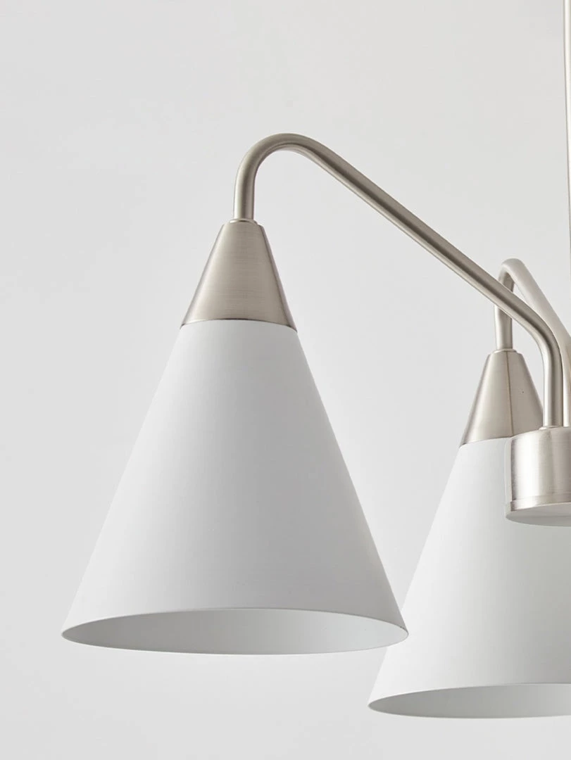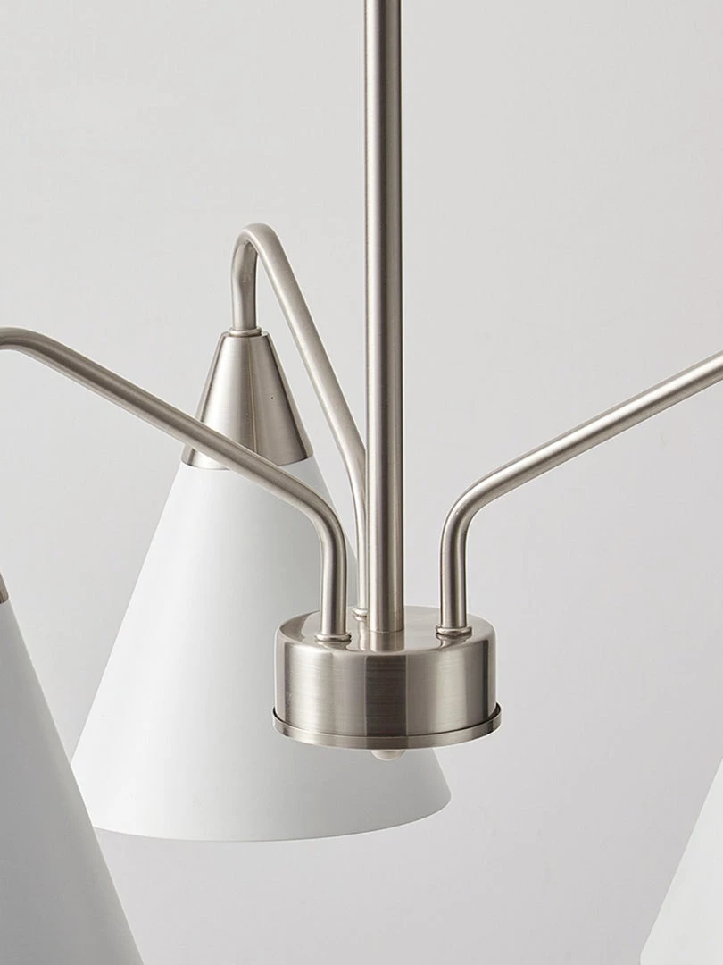 Fashion Cono Chandelier took a design classic and reinterpreted it into a fresh lighting fixture with a strong attention to detail. This exquisite pendant light features asymmetric structure with white lampshade and chrome plated details.this chandelier’s cone shades get a glowing review in any space.