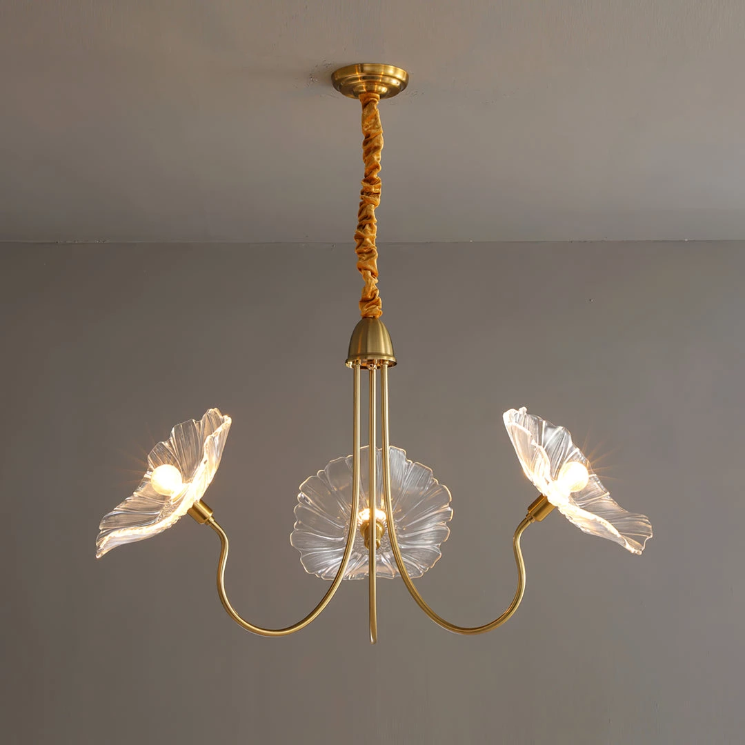 This chandelier is made of leaf-shaped frosted glass. The diffused light is soft and harmonious, perfect for illuminating your interior. Repair not visible on one of the crystals, marks of time consistent with the age of the object. Unique design object.