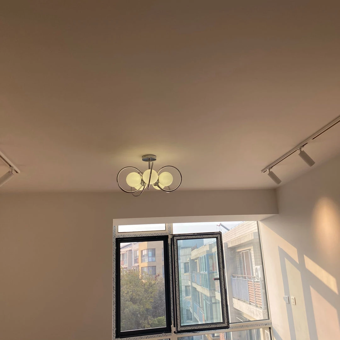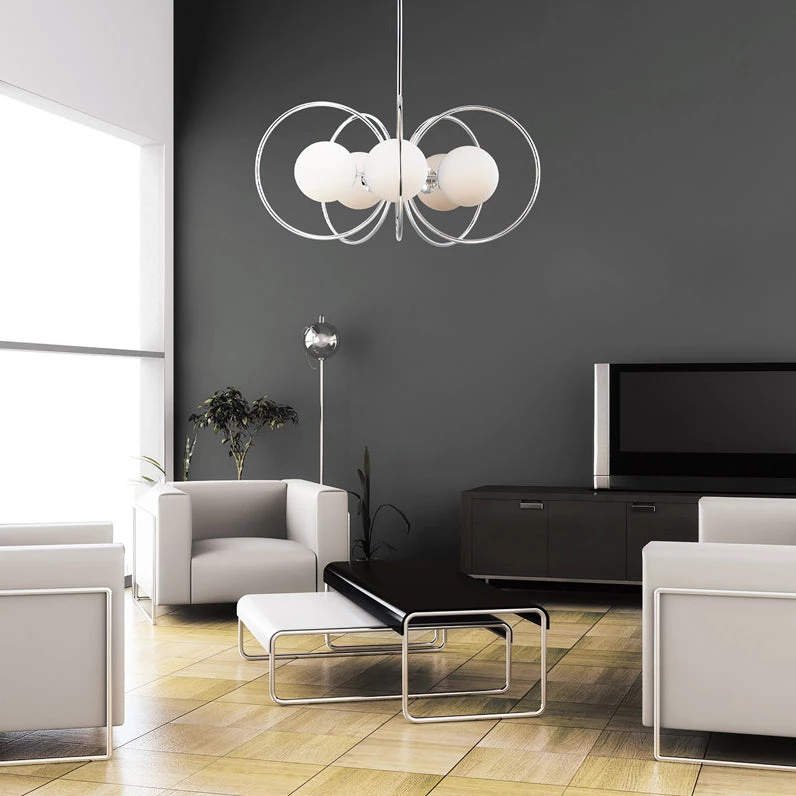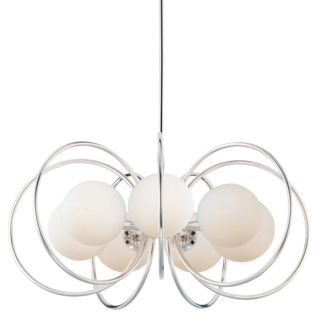 Hoops of Polished Nickel surround glass balls of Satin White to create this crisp and clean modern design. This current design trend compliments both modern and transitional aesthetics.