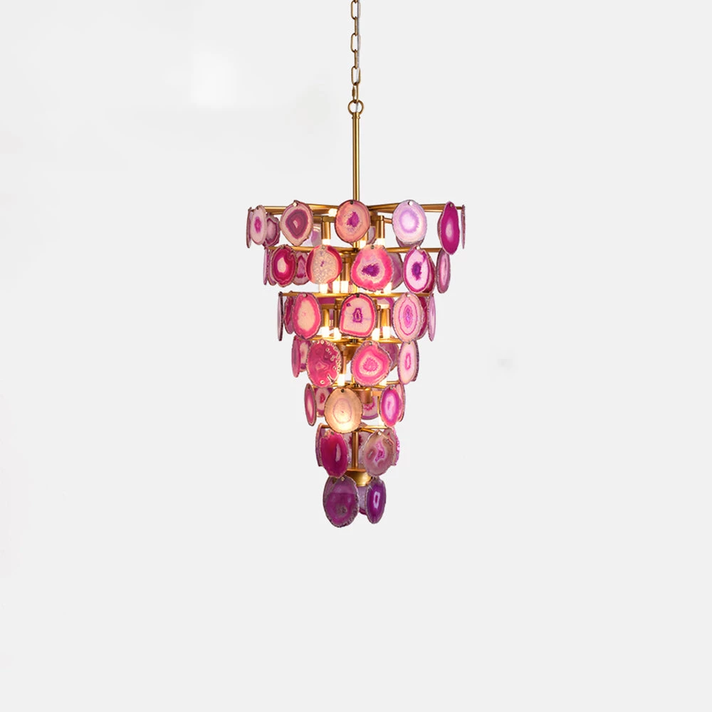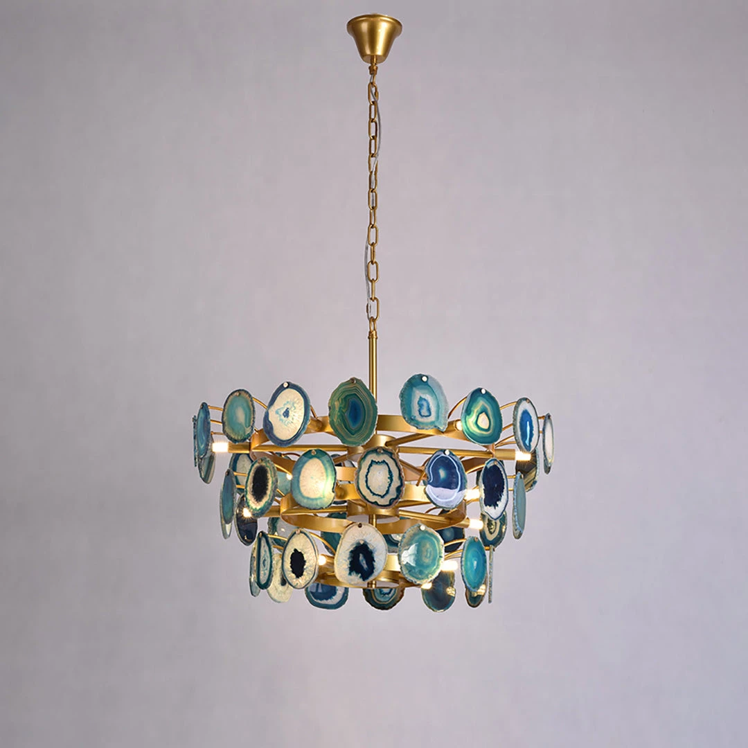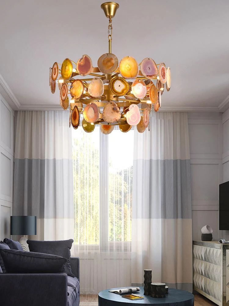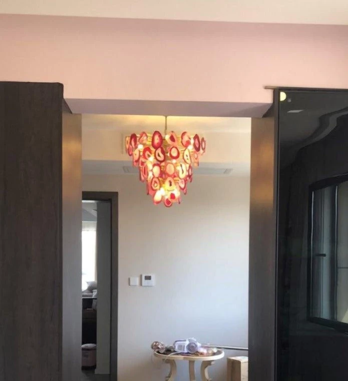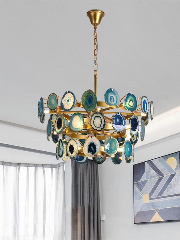 This is a luxurious agate chandelier. The natural agate rough is sliced, polished, perforated, and made. The agate is brightly colored and has a smooth surface. It has a strong light transmission and no glare.