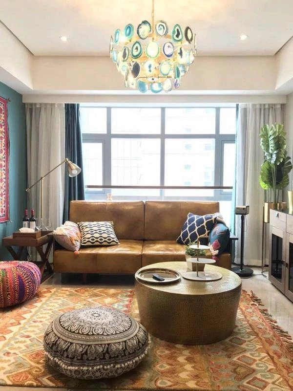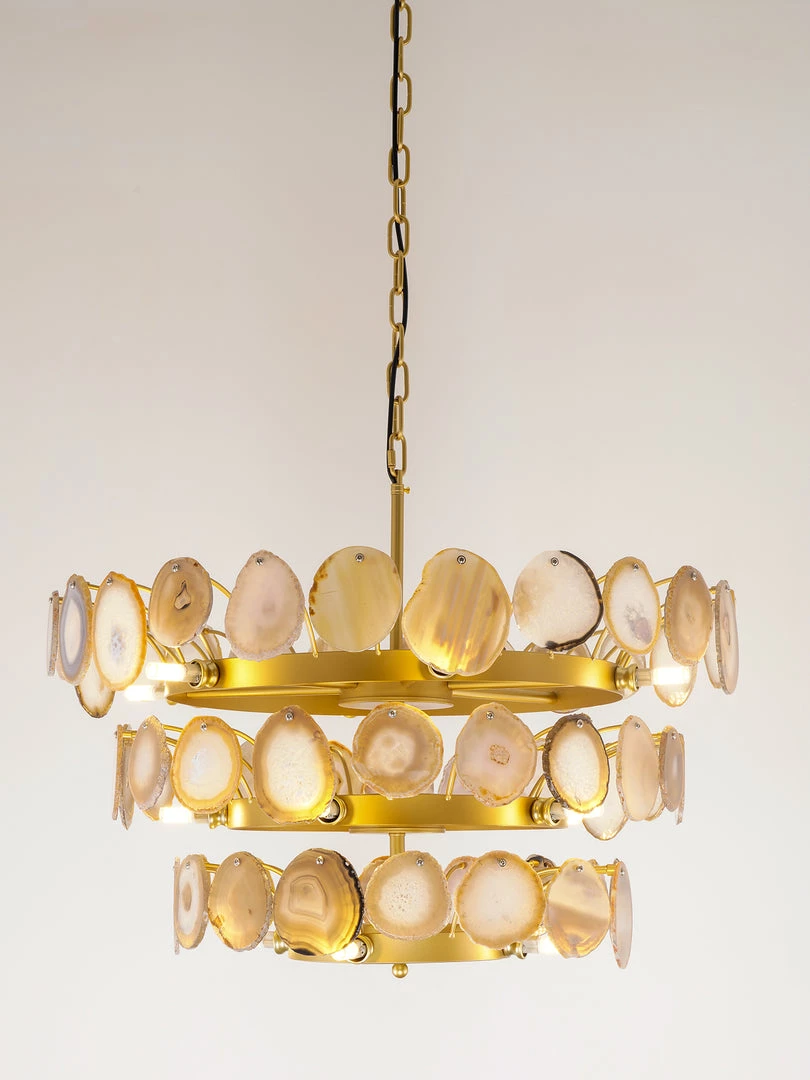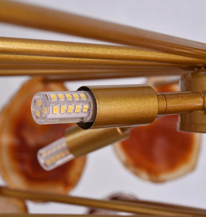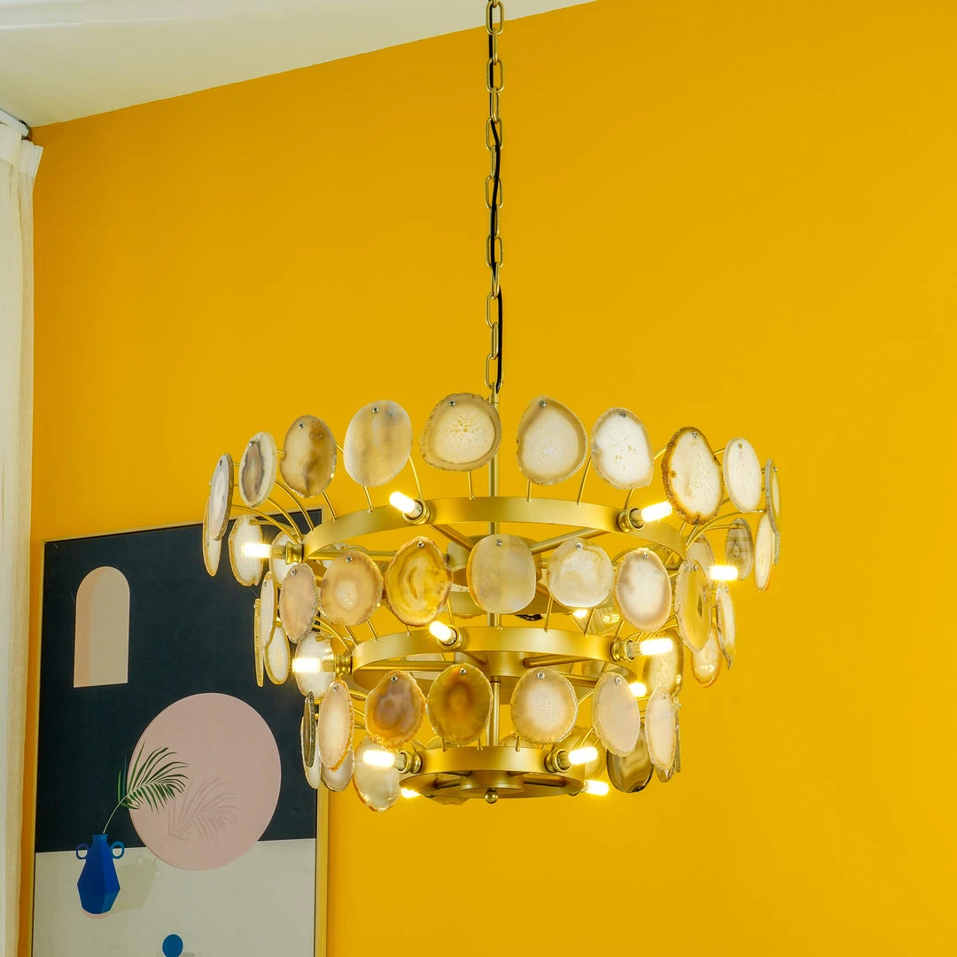 This is a luxurious agate chandelier. The natural agate rough is sliced, polished, perforated, and made. The agate is brightly colored and has a smooth surface. It has a strong light transmission and no glare.