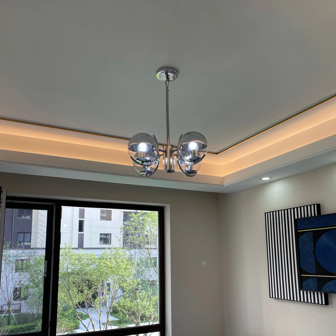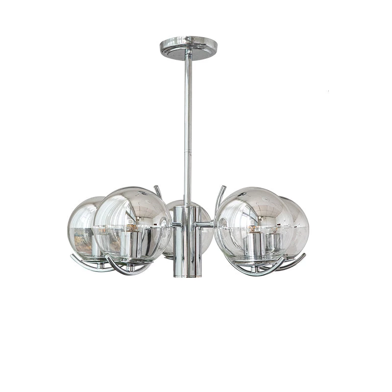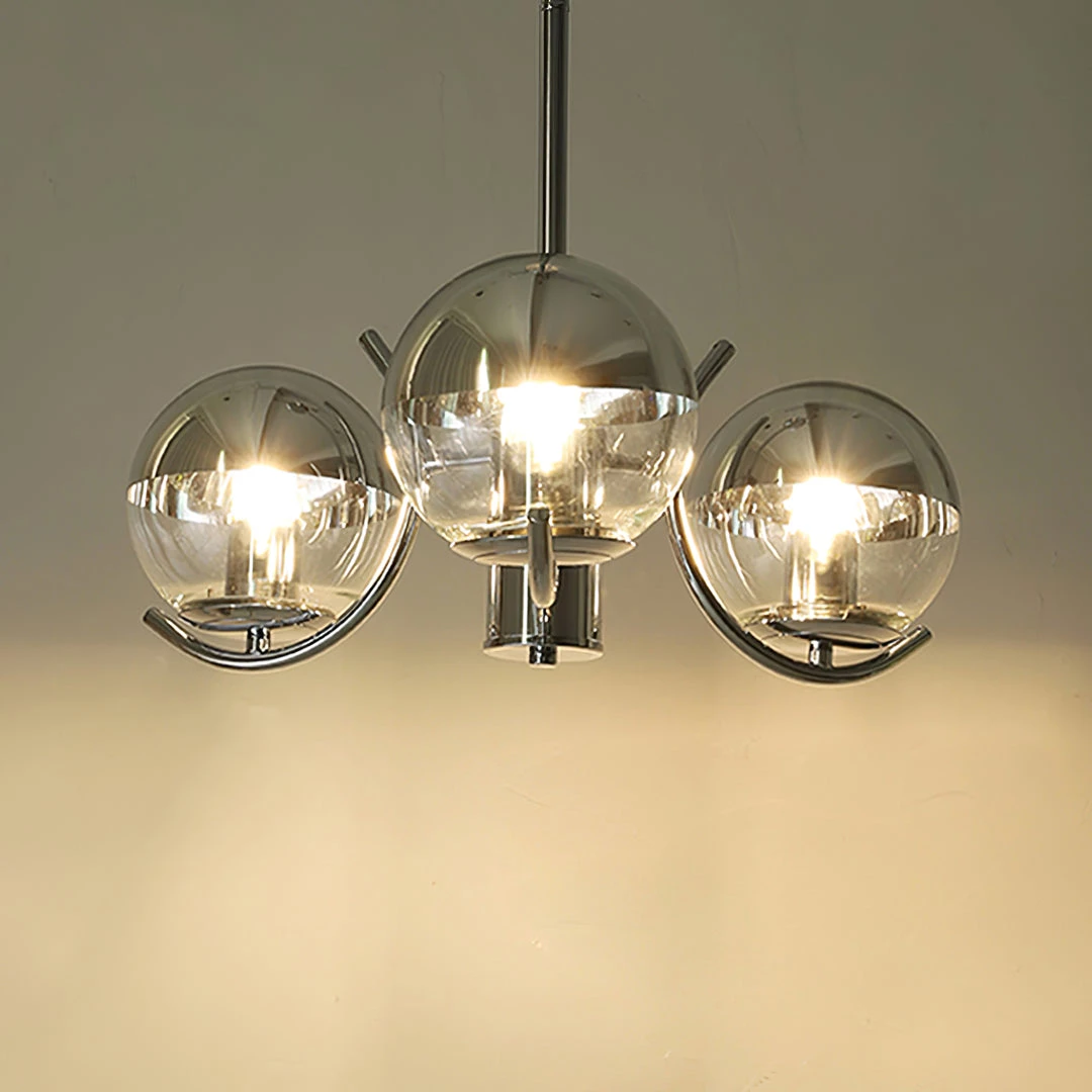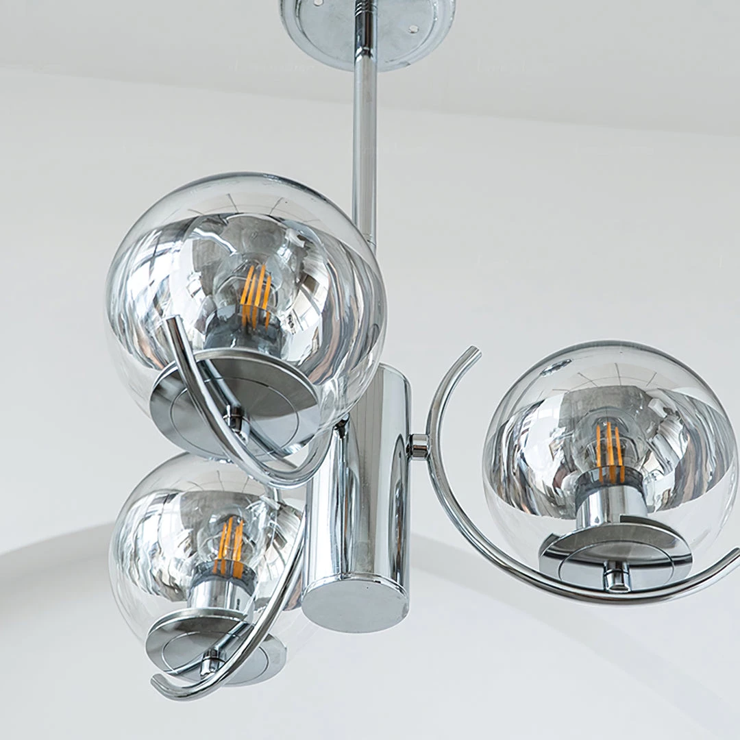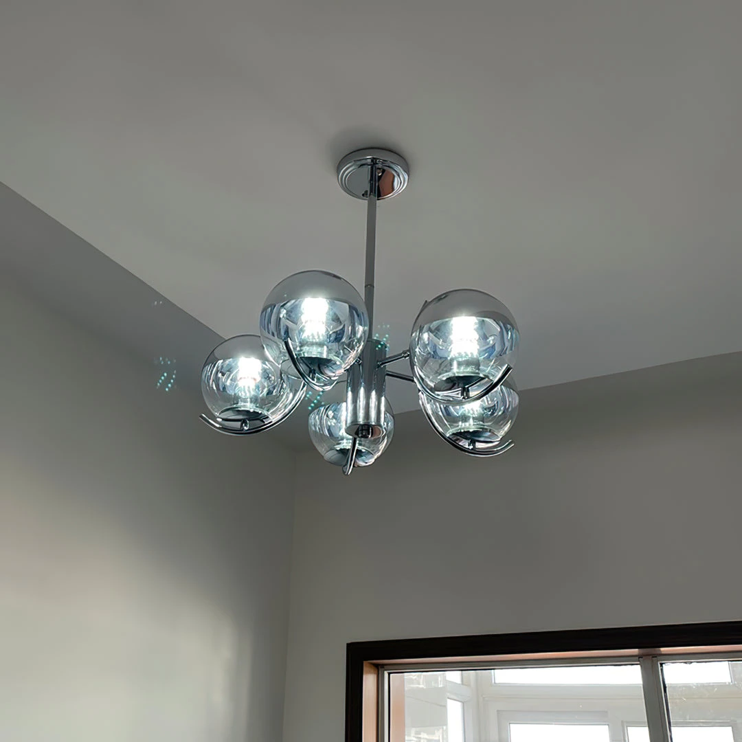 Globe forms and linear arms combine to create a fresh take on this modern chandelier. The semi-transparent mirror glass shades add glamour as well as practicality, in a range that offers style across modern and more classic interiors.