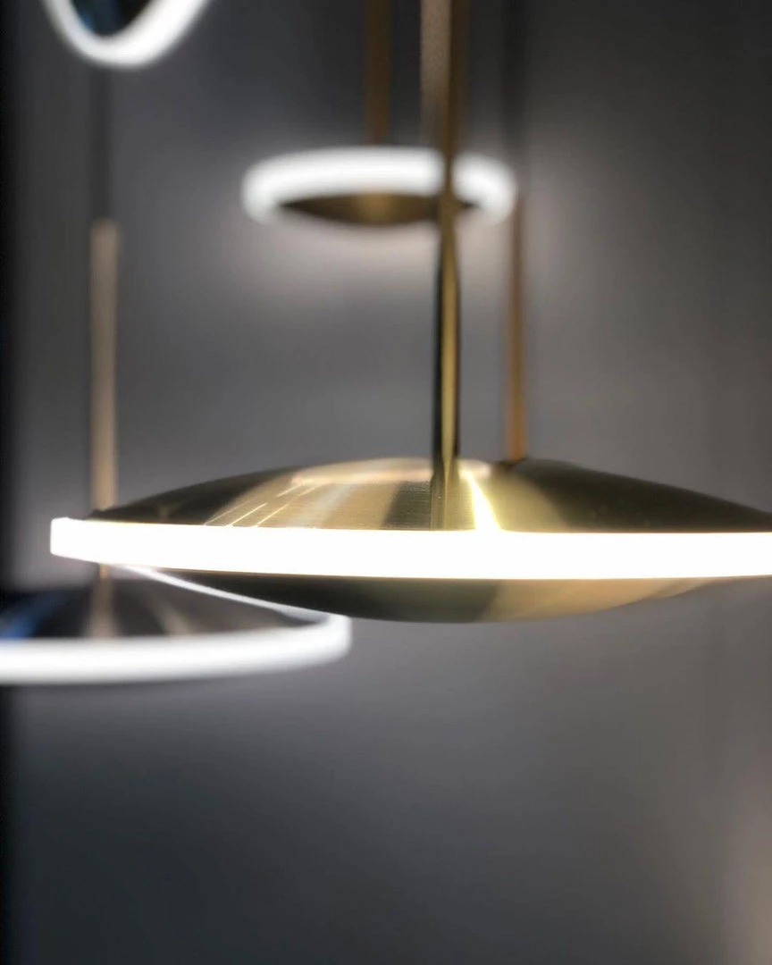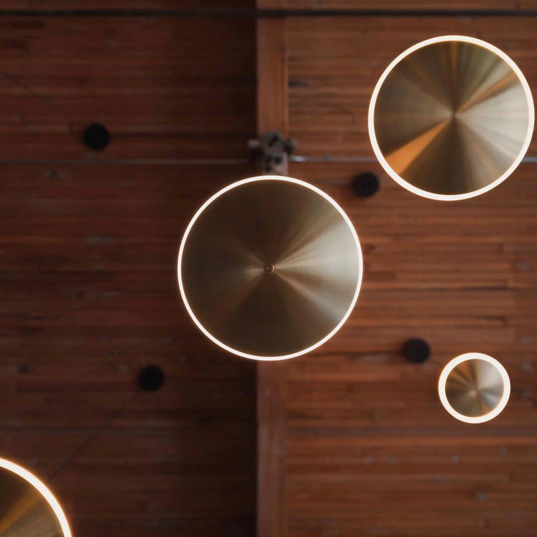 Mimicking the phosphorescent envelope found around stars, Chrona lights create a luminous glow by combining spun brass and diffused acrylic. With a variety of configurations in both horizontal and vertical orientations, Dish pendants can be clustered together to make stunning constellations or individually hung to accentuate any space.