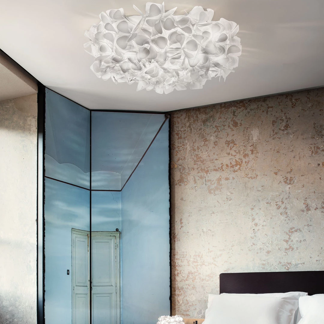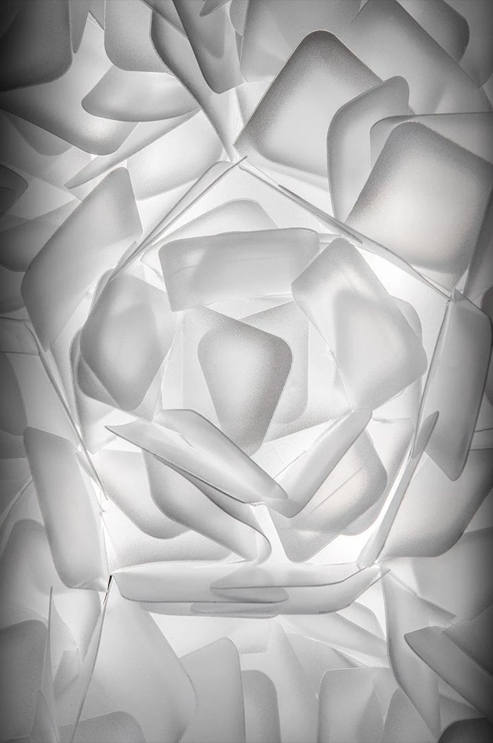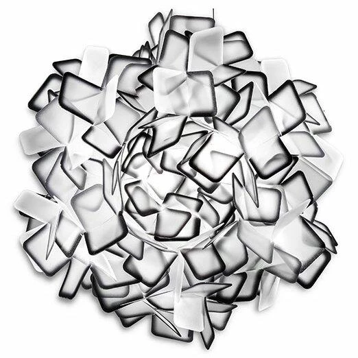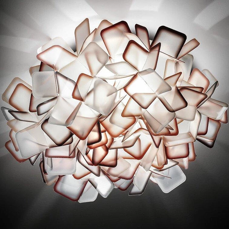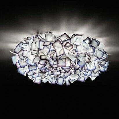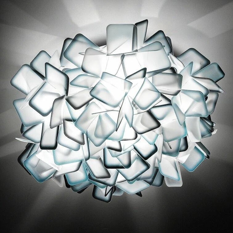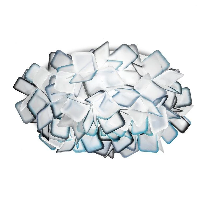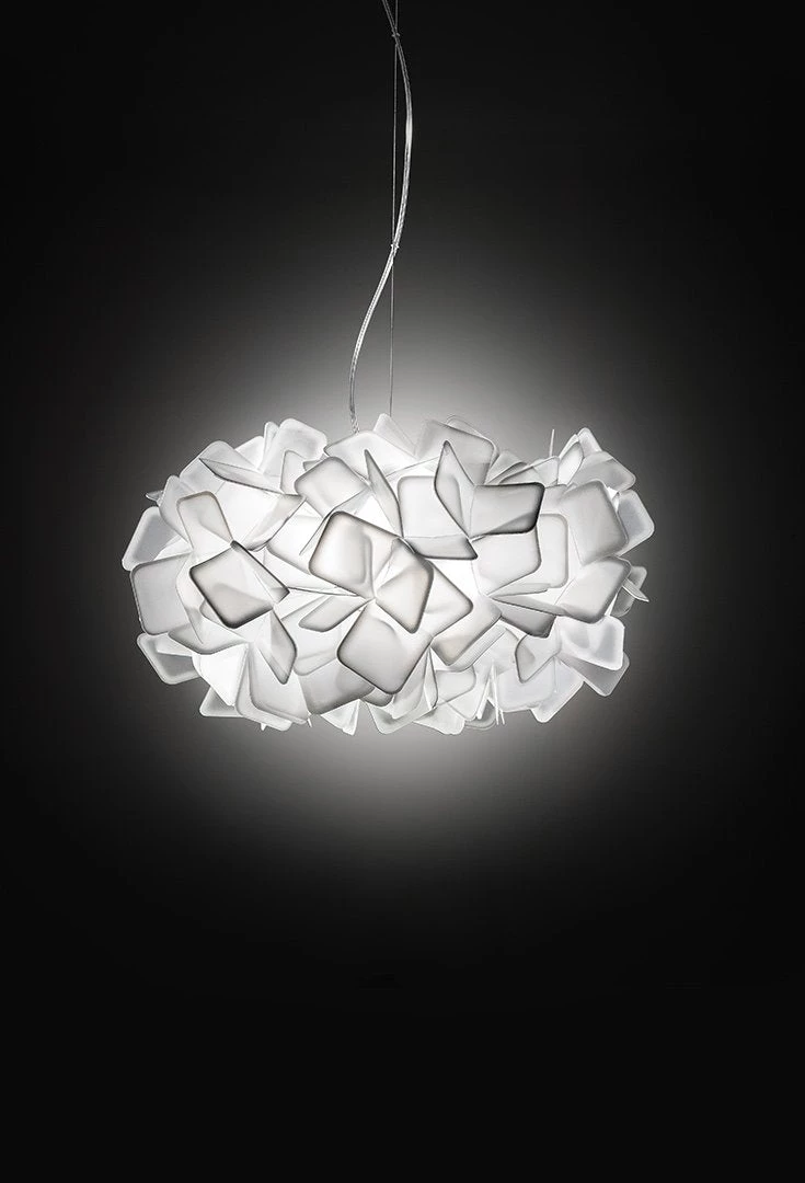 Clizia is a series of shapes fit together to create a perfect balance of reflections and transparencies. The lamp has taken note of natural forms, resembling a cloud that captures the first changing rays of morning sun, or a treetop filtering a play of light and shadows. All of the available versions marry aesthetics with functionality, featuring a magnetic anchoring system, connecting them to the ceiling (for the suspensions and applique) . Clizia transforms a space into a landscape without overwhelming it.
