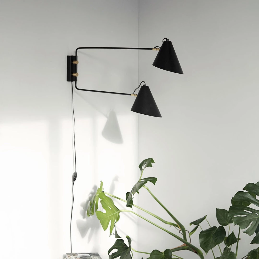 Lamps add character and style to any décor. With the decorative wall lamp, Club, you get an atmospheric light for your room and a nice decoration for your walls. The lamp has an industrial and sculptural look, which makes it a stunning design statement in any home. The combination of black iron and golden brass gives the design a warm twist. The lamp has multiple functions. The lamp head can be tilted up and down and from side to side. And the arm can be moved from side to side. These functions give you the opportunity to adjust the light in the way that you want it.Â