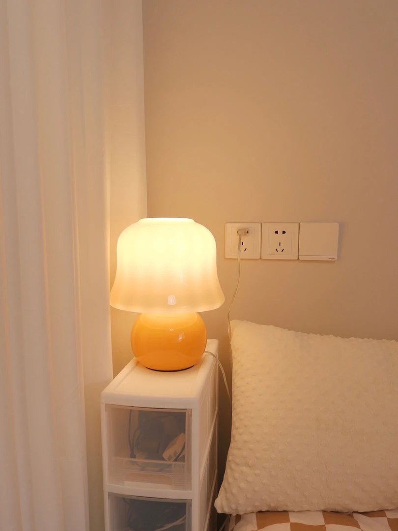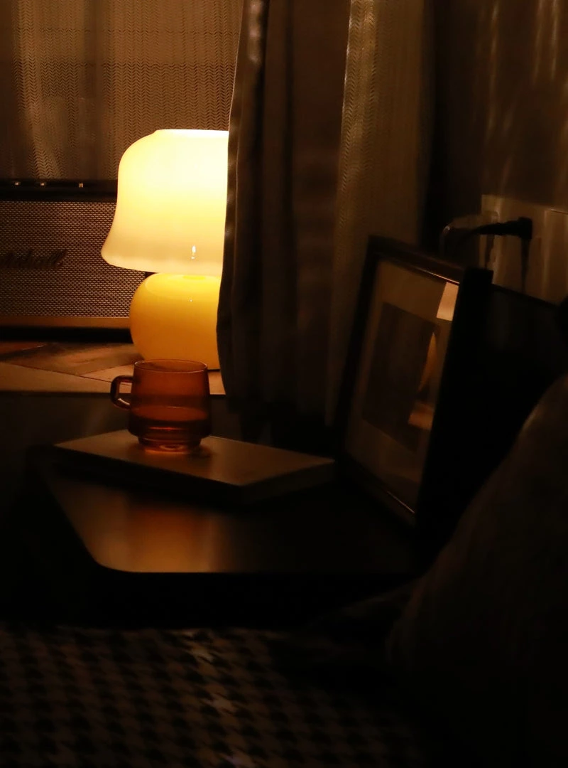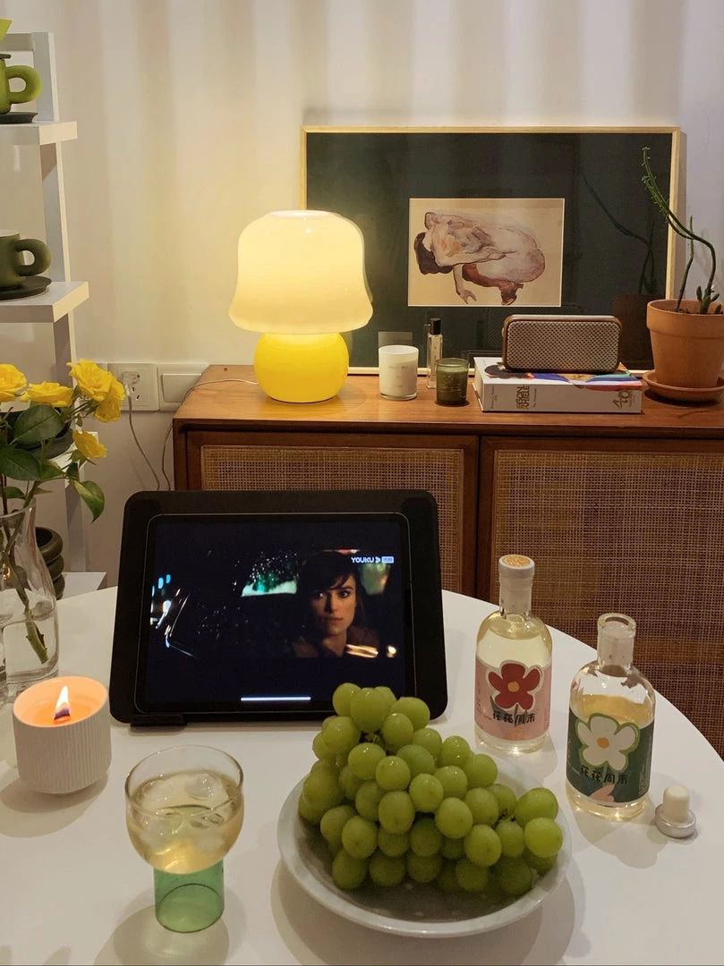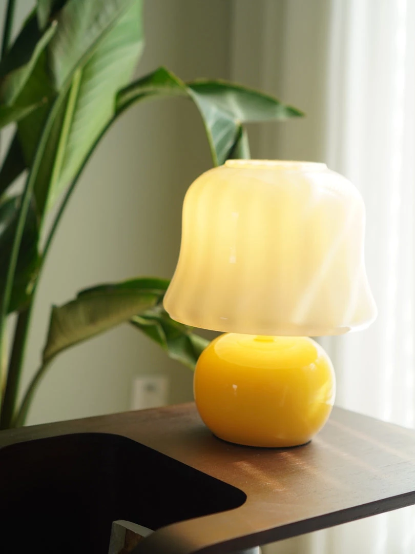 The mushroom-shaped table lamp that has been popular in Italy since the last century, the enamel glass material is very bright, and the hand-made texture flowing down the river is like a girl’s pleated skirt in a circle. This product is a very beautiful decoration during the day, and when the lights are turned on at night, it is an artistic work of art with a sense of atmosphere. This product has two color temperature adjustment methods for you to choose from.