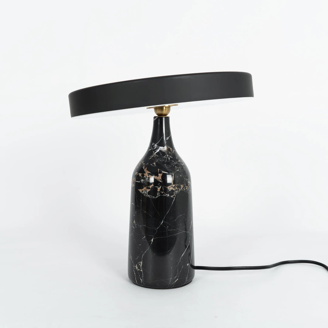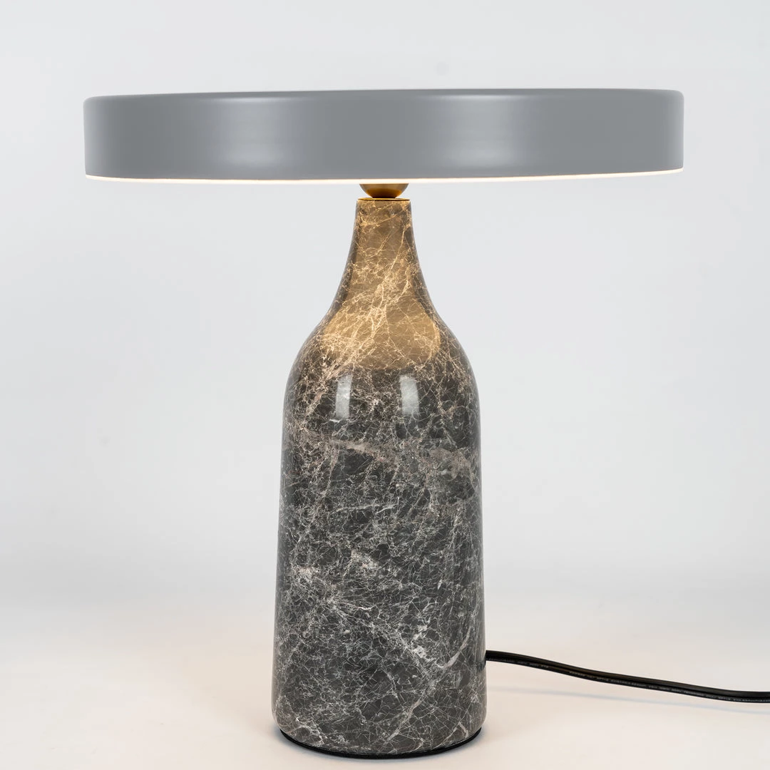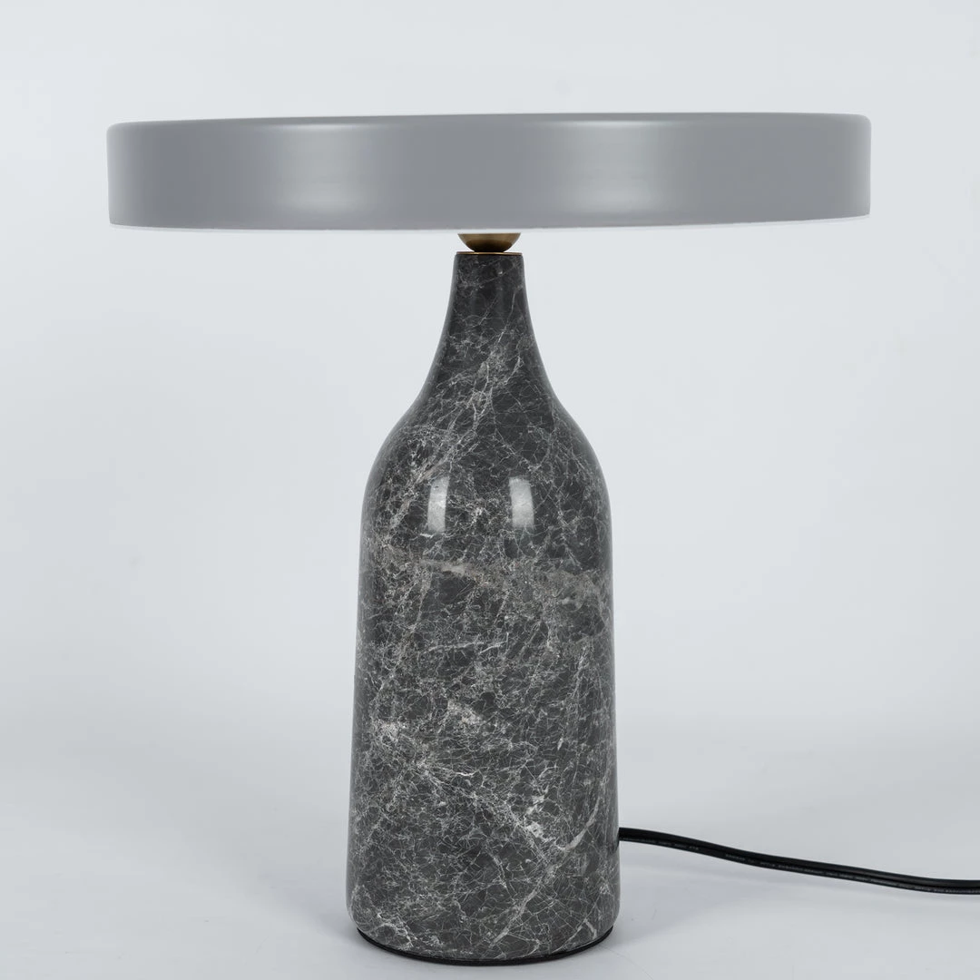 The table lamp consists of a steel screen with an integrated LED light source and a lamp base made of hand-turned to marble. Lampshade and base meet in a rotation point: a metal ball, which the shade can be tipped around to control the direction of the light. Brass dimmer on top of the lampshade. Textile-covered cord.