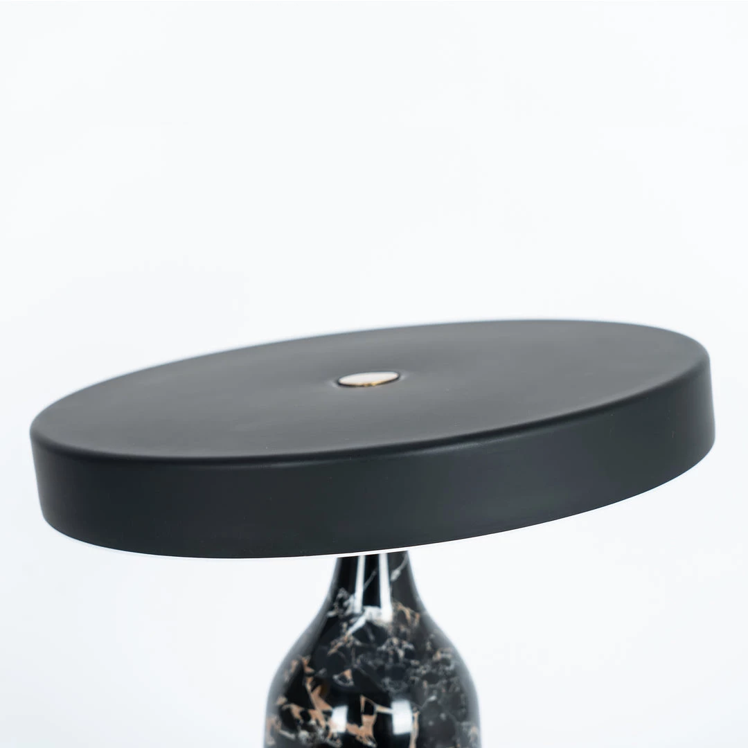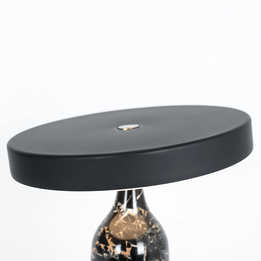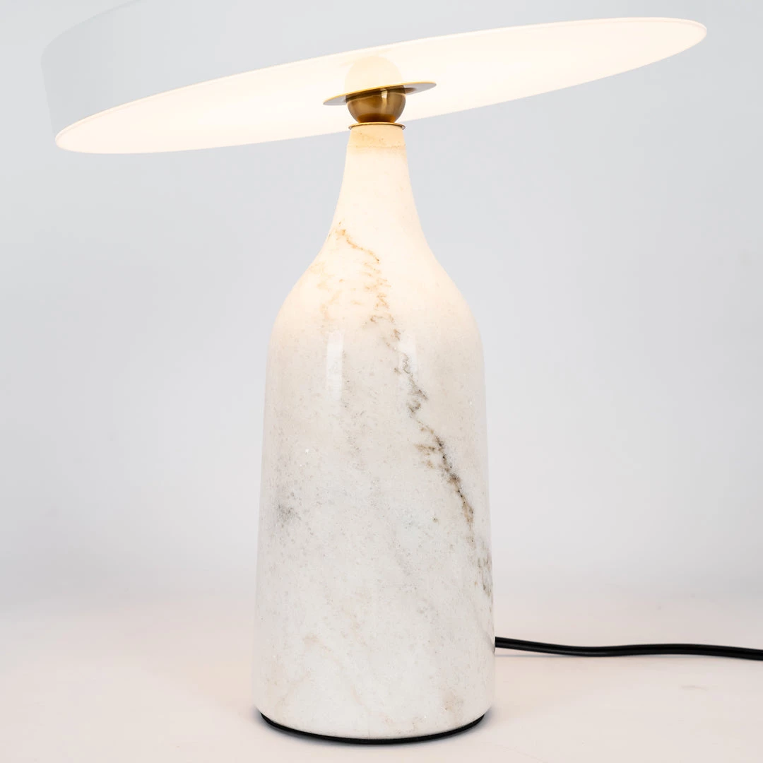 The table lamp consists of a steel screen with an integrated LED light source and a lamp base made of hand-turned to marble. Lampshade and base meet in a rotation point: a metal ball, which the shade can be tipped around to control the direction of the light. Brass dimmer on top of the lampshade. Textile-covered cord.