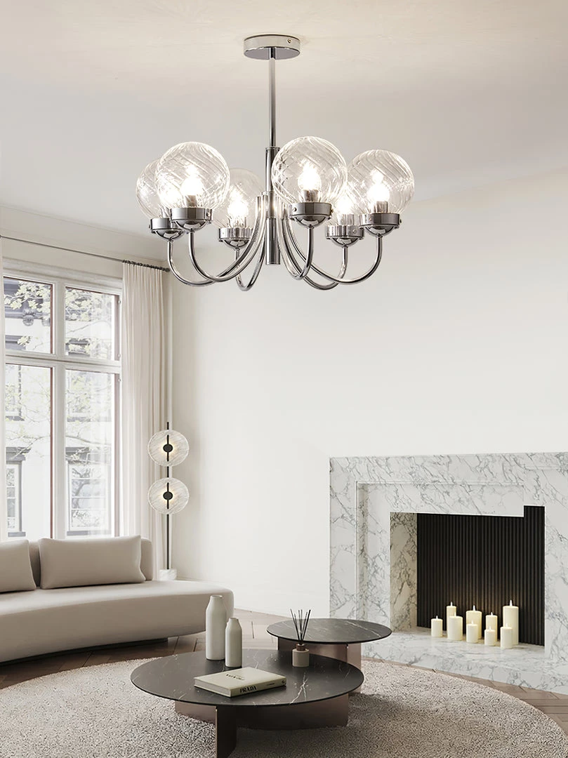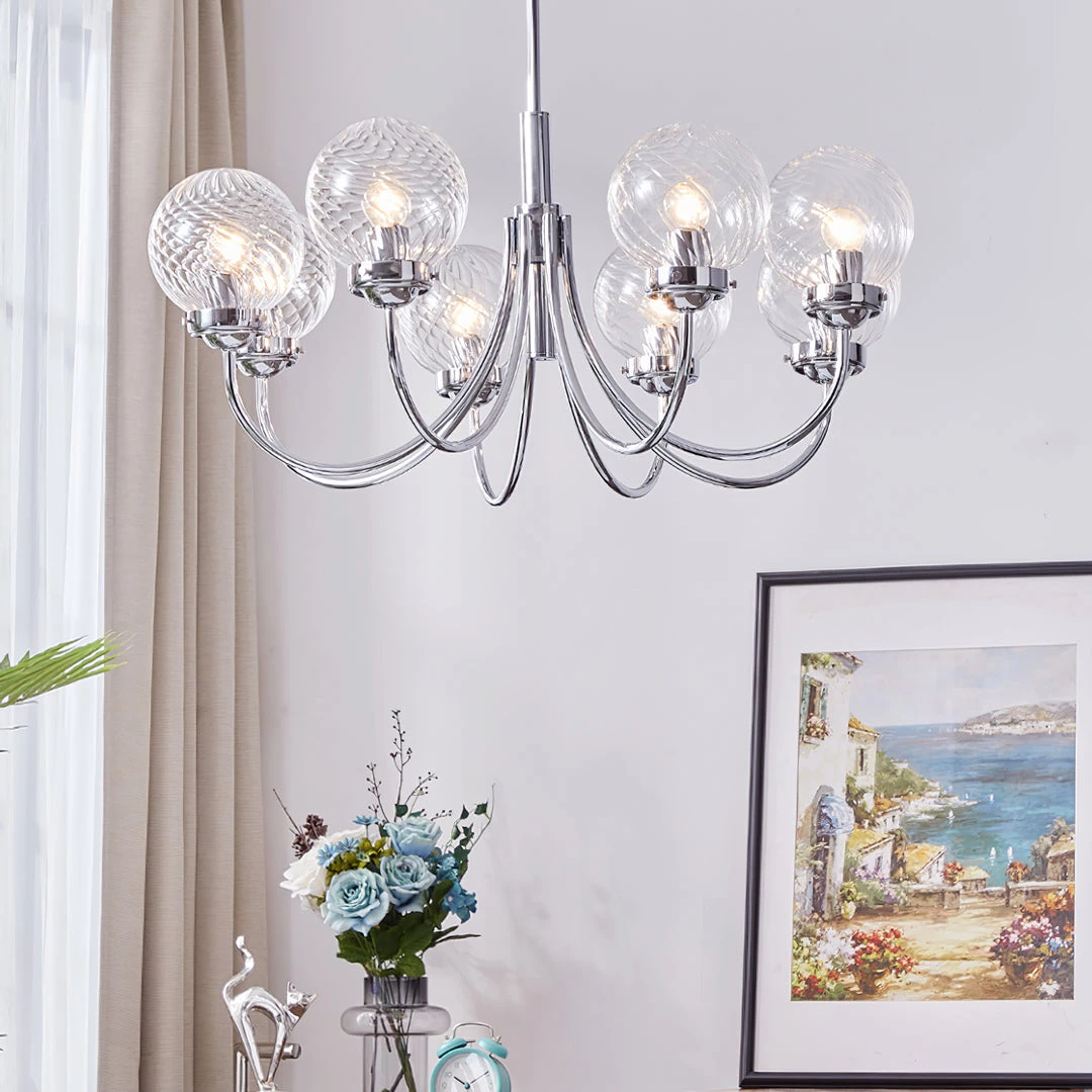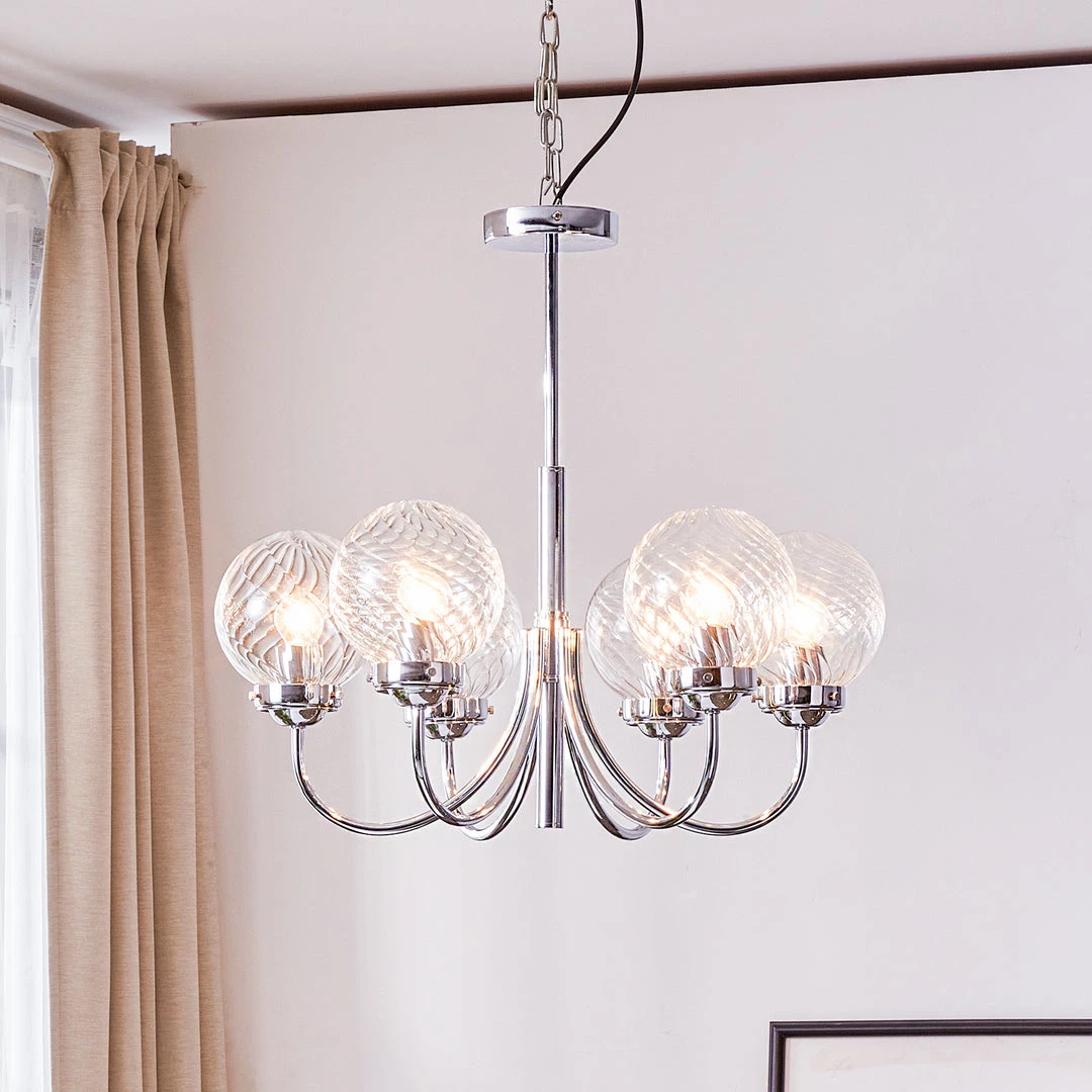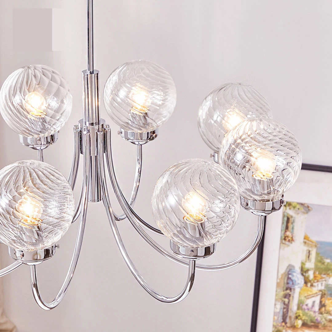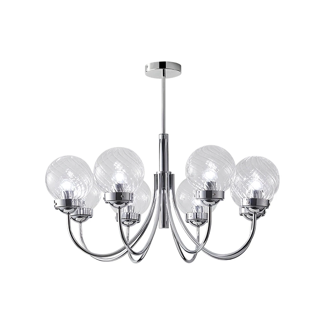 The “Hamilton“ collection is classic in design. It has tubular arms, center column and rods. It is notable for the simplicity of its well-proportioned radius arms, teamed with Clear Twisted Style Closed Glass Shades that appear to ashwicknce, breathtakingly, on the fine tubing. Shown in plated chrome version.