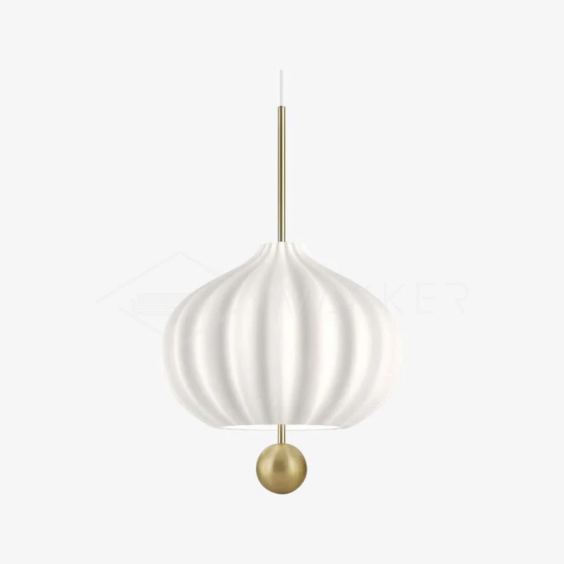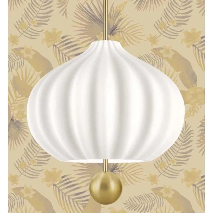 “Its perfect balance is inspired by the floral world in which colors, shapes, sizes, and smells coexist in a fully balanced harmony.” Suspension lamp. Opal diffuser made of two layers of mouth blown glass. Satin brass structure. Designed in 2019.
