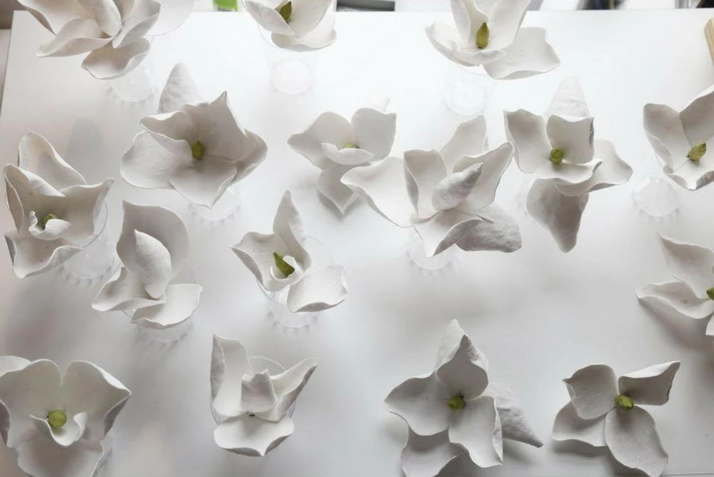 Lure uses cast cotton paper flowers sculpted by hand. Each blossom’s petals are individually shaped, and each Lure blossom is unique. Unlike wood-based paper, the cotton paper is archival in quality, extremely durable, and has been known to last for more than a hundred years.