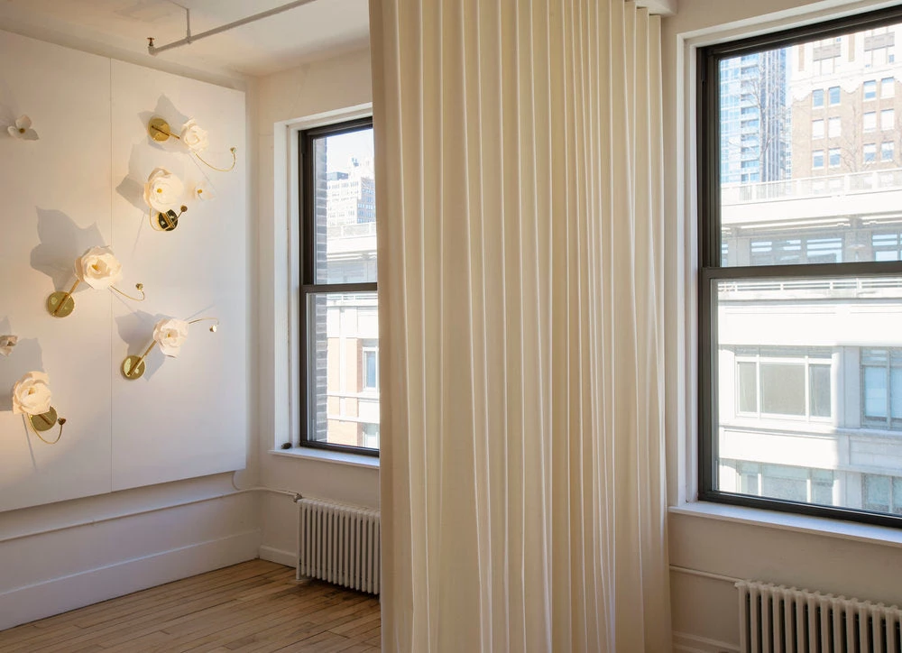 The Lure Magnolia Sconce transforms a flower’s transient beauty into a lasting light. In this fixture, a cast cotton paper flower is spotlit by a suspended LED light source. Held by a slender brass arc, the light shines brightly on a blossom built of hand-sculpted petals, displaying texture, structure, and delicacy. The white flower reflects light, providing a source of soft illumination.