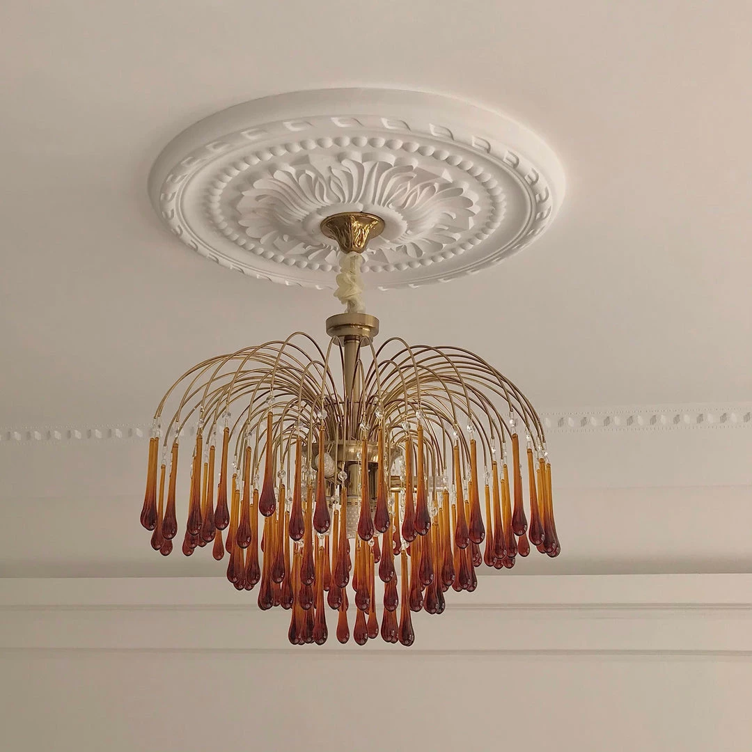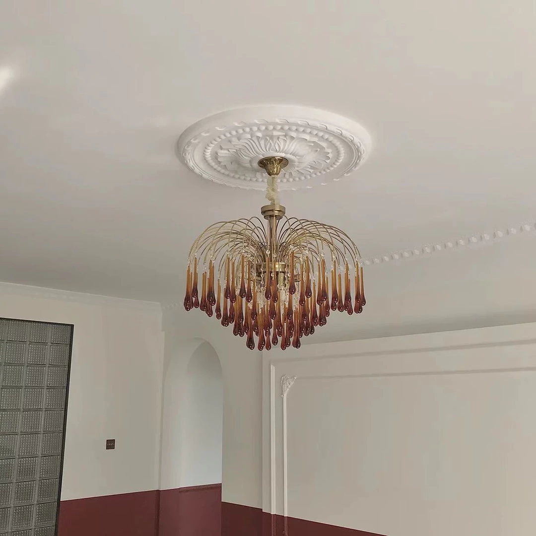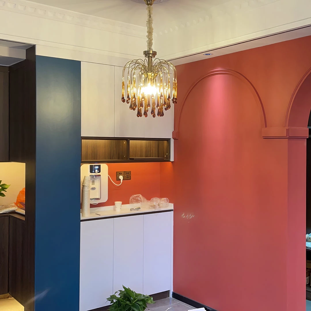 Maltose Chandelier is a stunning blend of vintage elegance and bold silhouettes. This features sleek curved gold finish arms around a decorative central frame, with overlapping tiers of shimmering crystal buttons and drops that create a picturesque cascading light effect and form a dramatic Waterfall effect when illuminated.