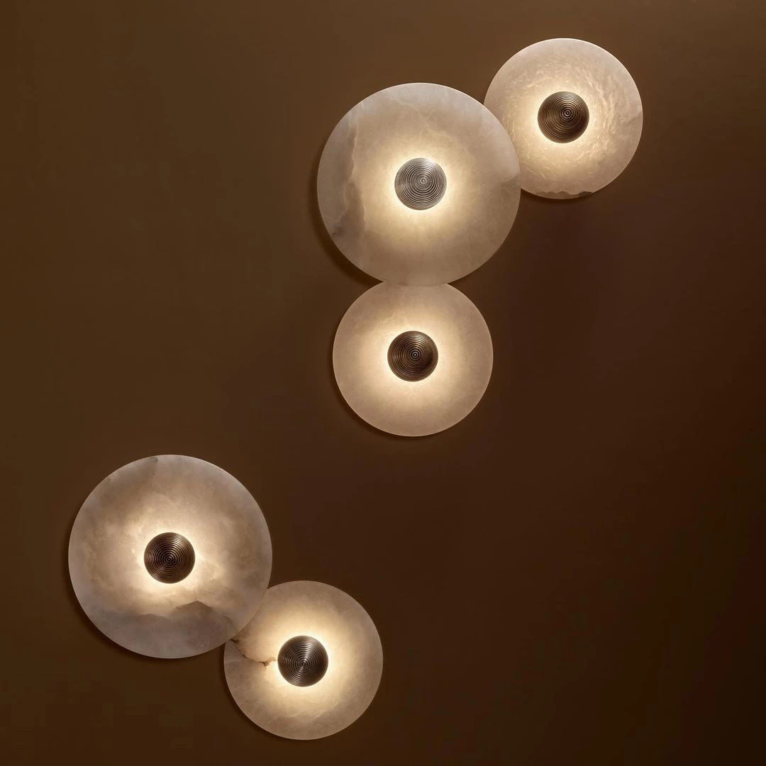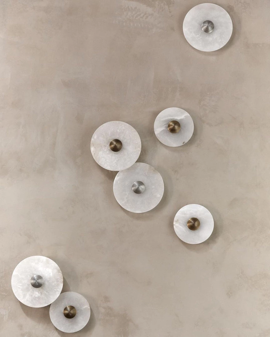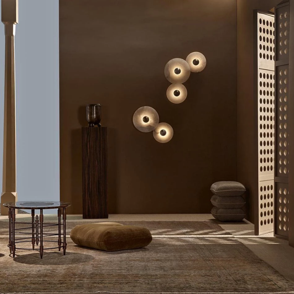 The translucent alabaster planes of the median series are intersected by a fluted brass form, referencing traditional middle eastern jewelry while pushing it through a futurist lens. the stone glows from a light source that remains hidden, illuminating the relationship between the solid and the permeable.