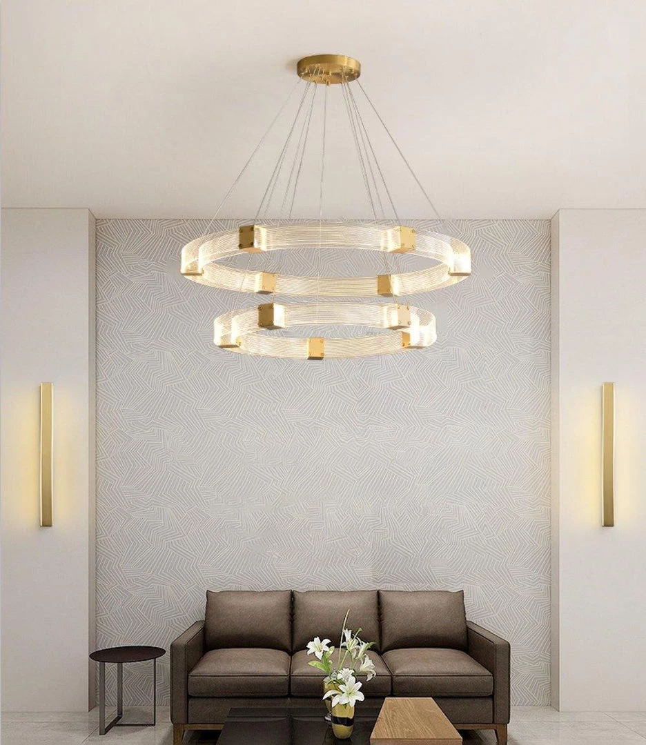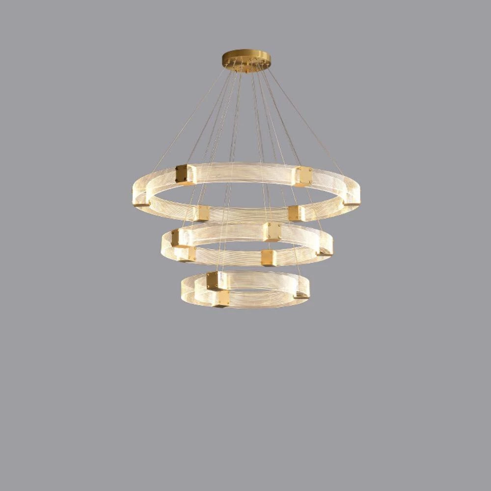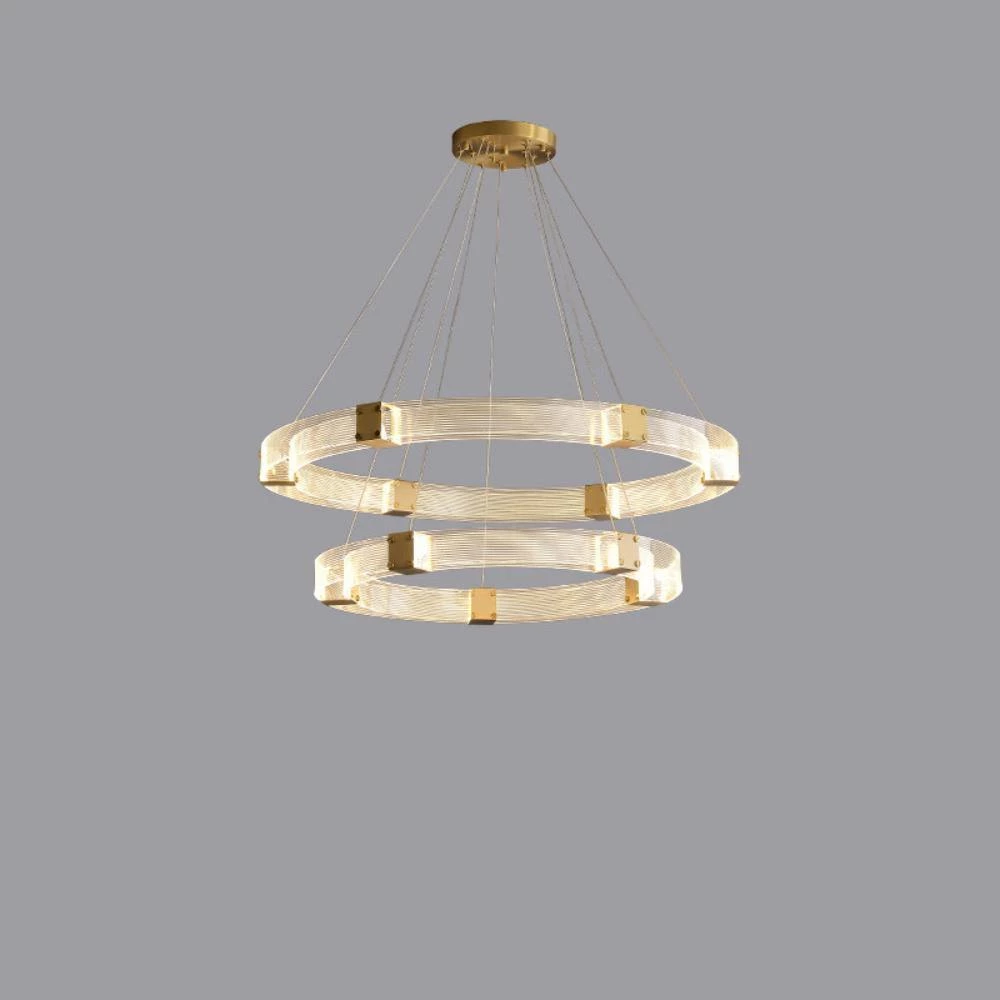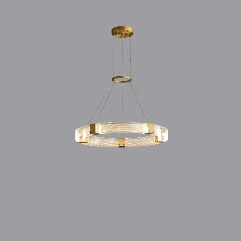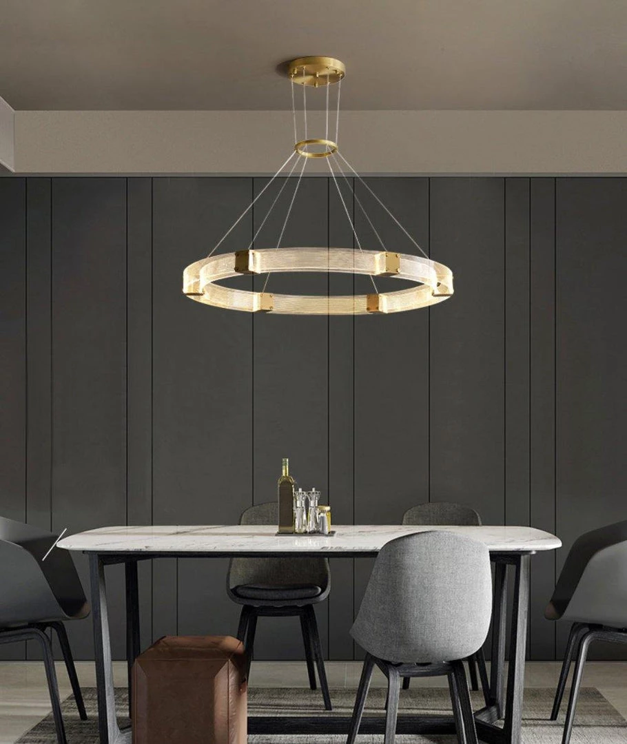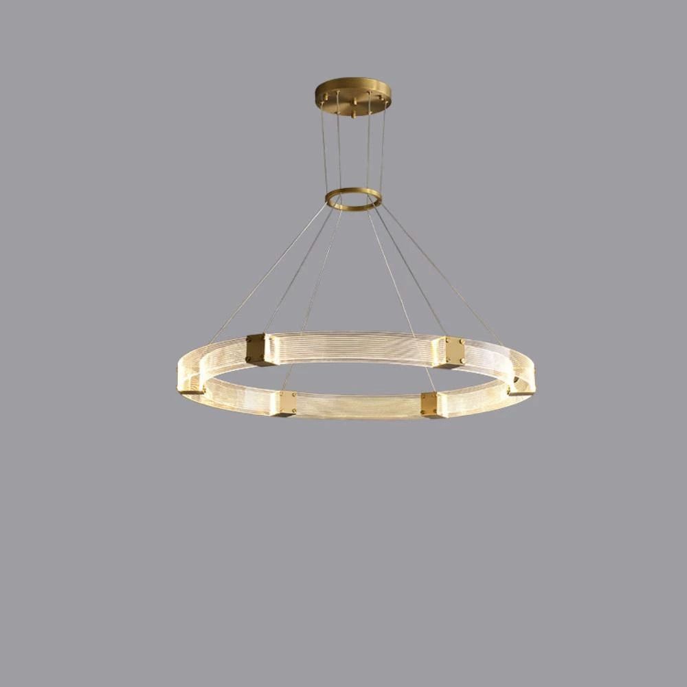 Artisanal luxury is paired with contemporary design in the Parallel Ring LED Chandelier. Its ringed silhouette consists of parallel handcrafted, textured acrylic panels that are joined by finished brass inserts.Â