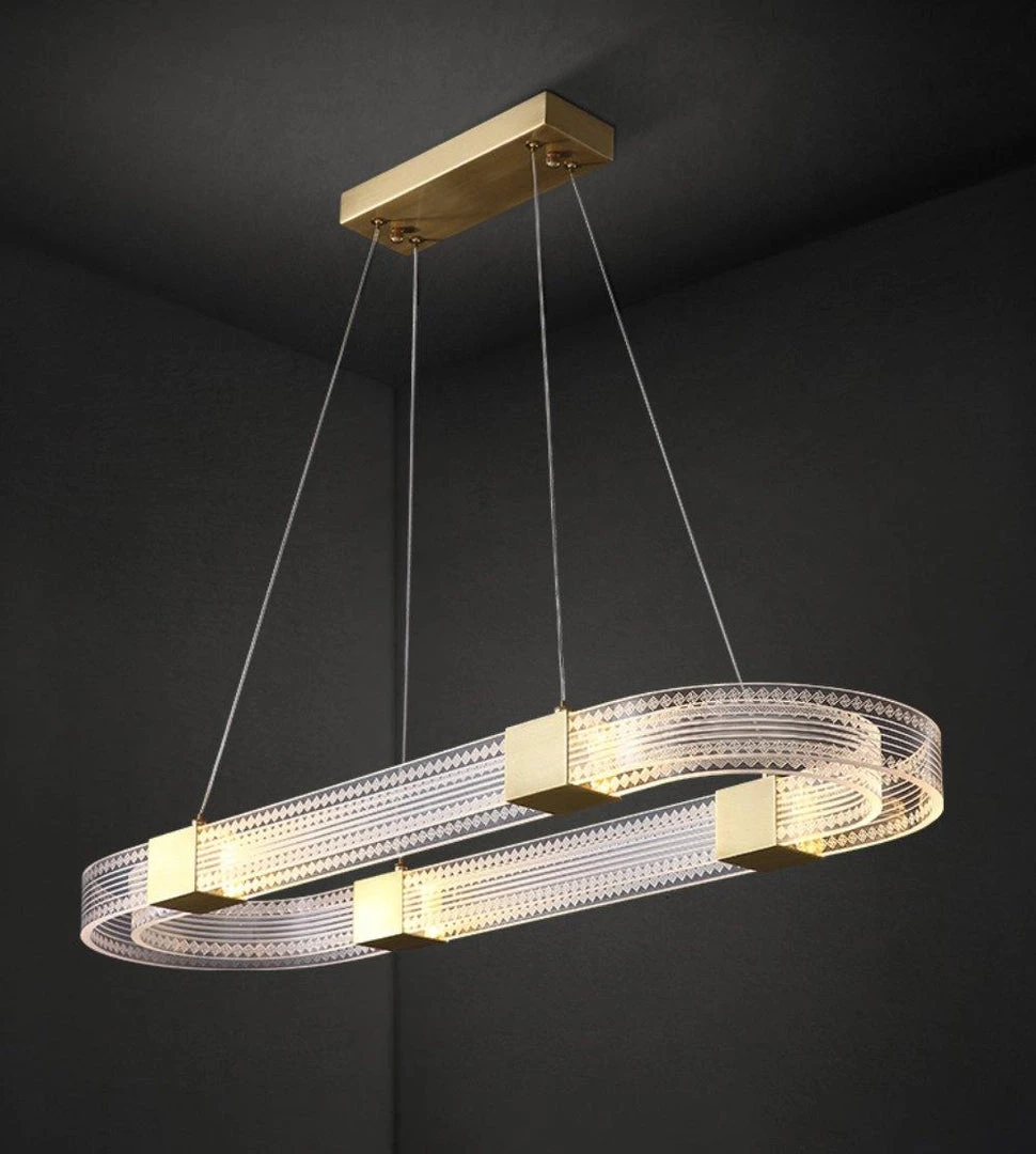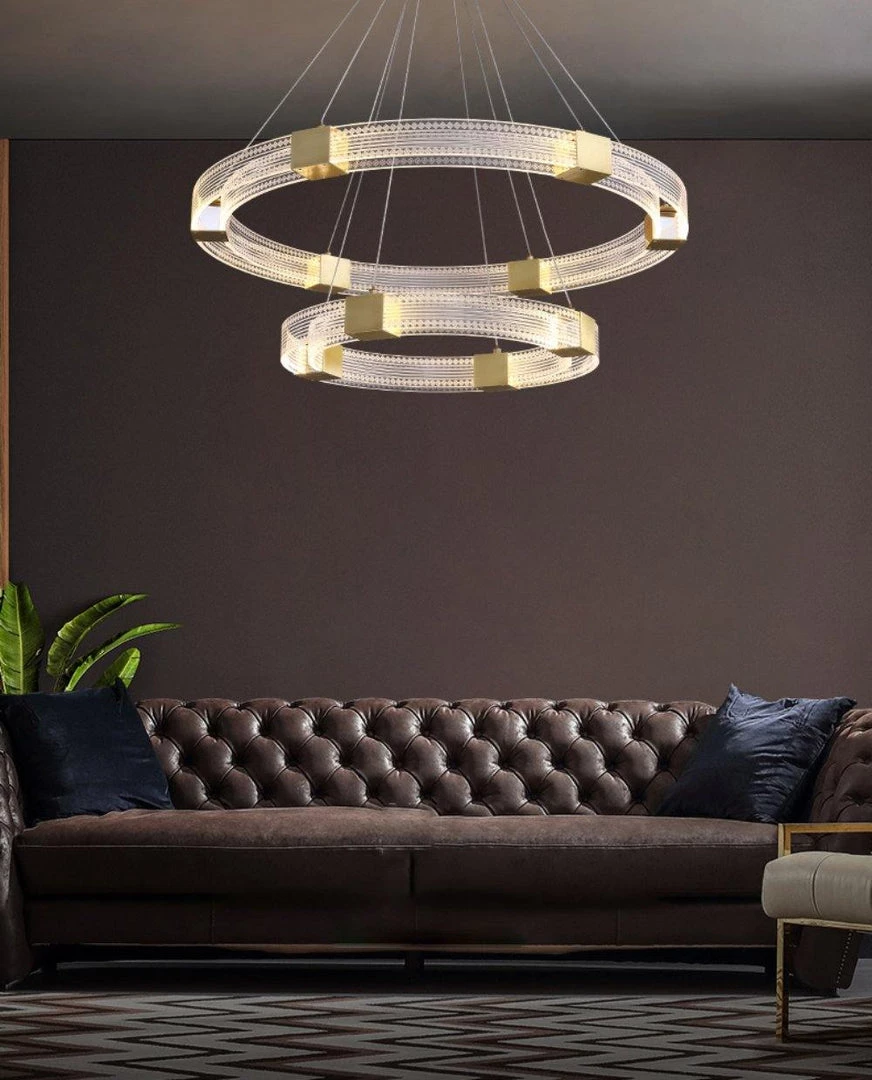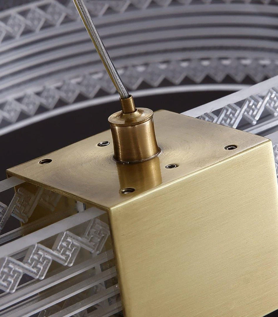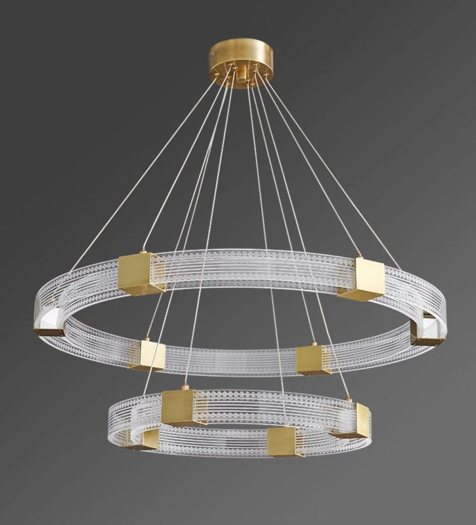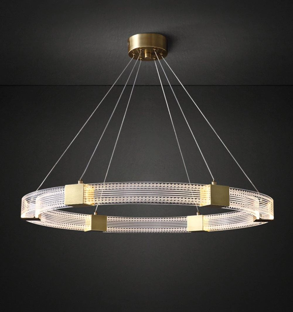 Artisanal luxury is paired with contemporary design in the Parallel Ring LED Chandelier. Its ringed silhouette consists of parallel handcrafted, textured acrylic panels that are joined by finished brass inserts. These brass inserts contain integrated LEDs that sit flush behind Frosted acrylic diffusers, pointed both down and sideways for a dazzling display once lit.