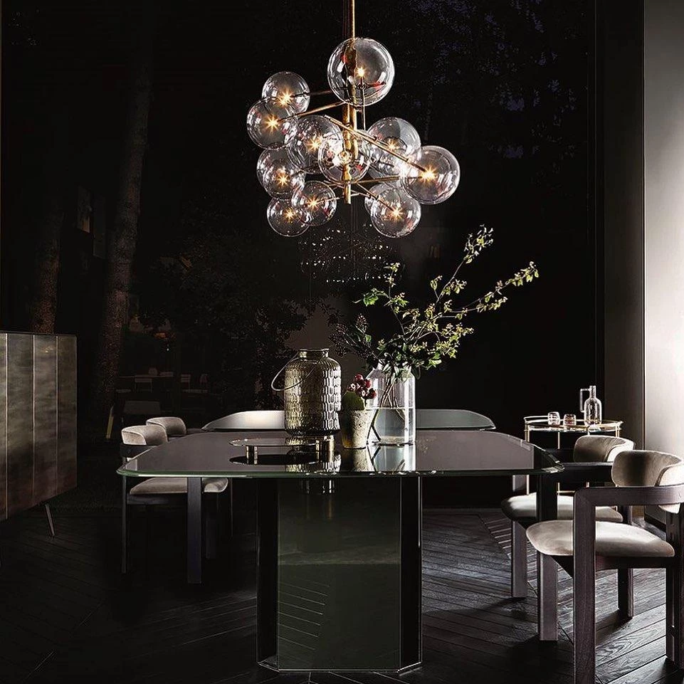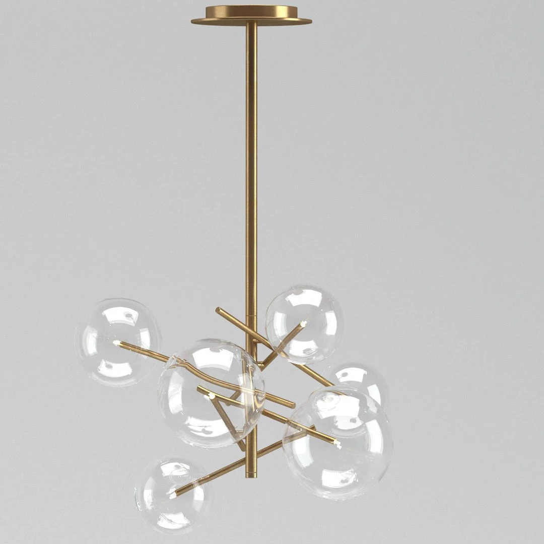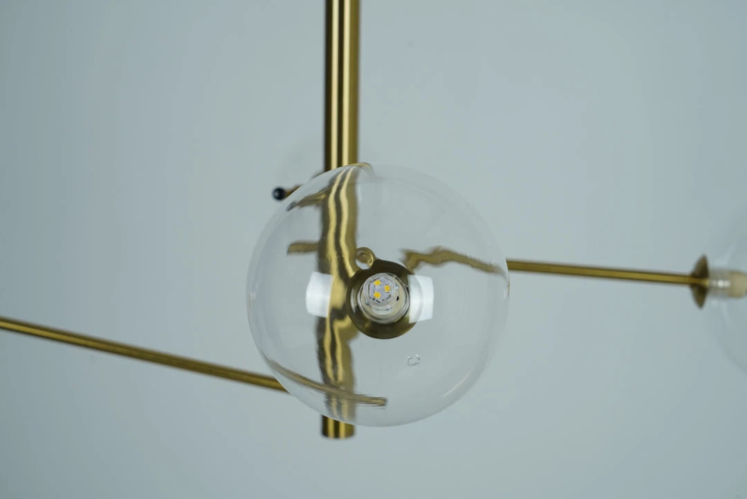 Suspension lamp with LED light. 6 clear mouth blown crystal spheres. Also available in the version with 4 balls. Metal parts in hand burnished brass. The brass is naturally stained and uneven. This craftsmanship gives each piece a particular uniqueness, making it exclusive.