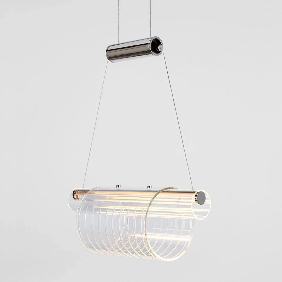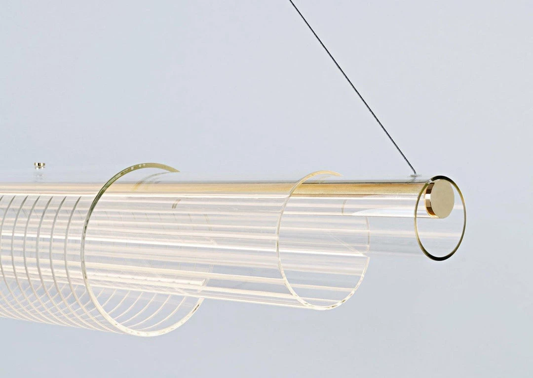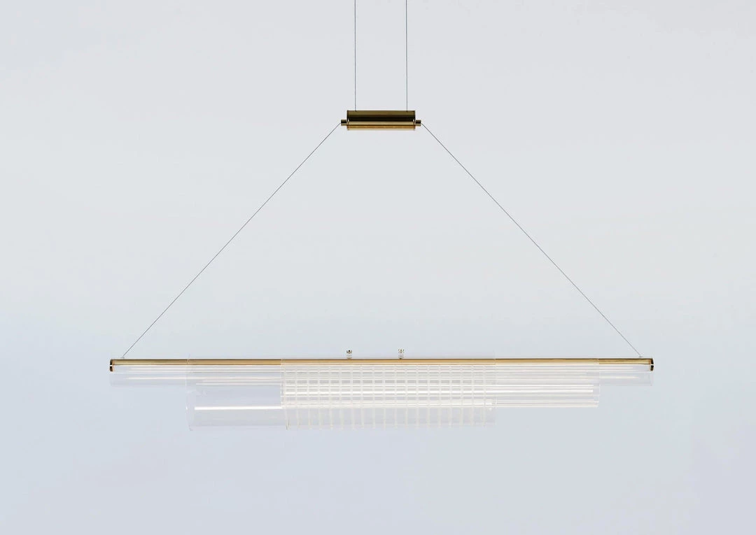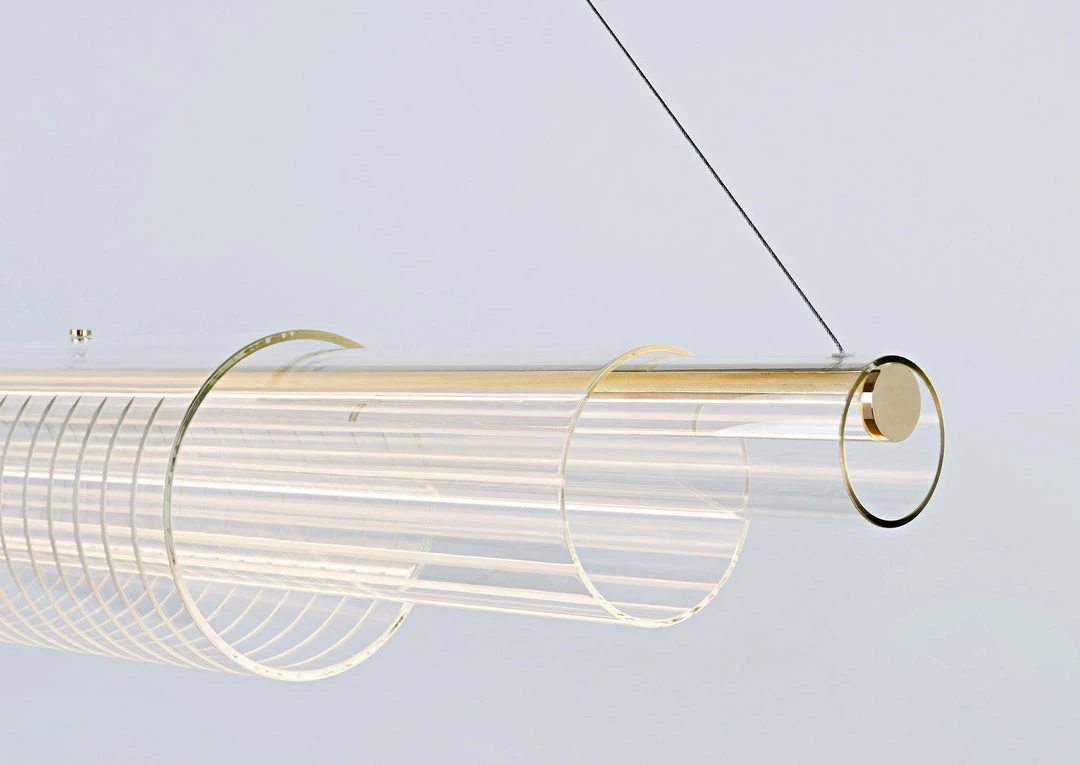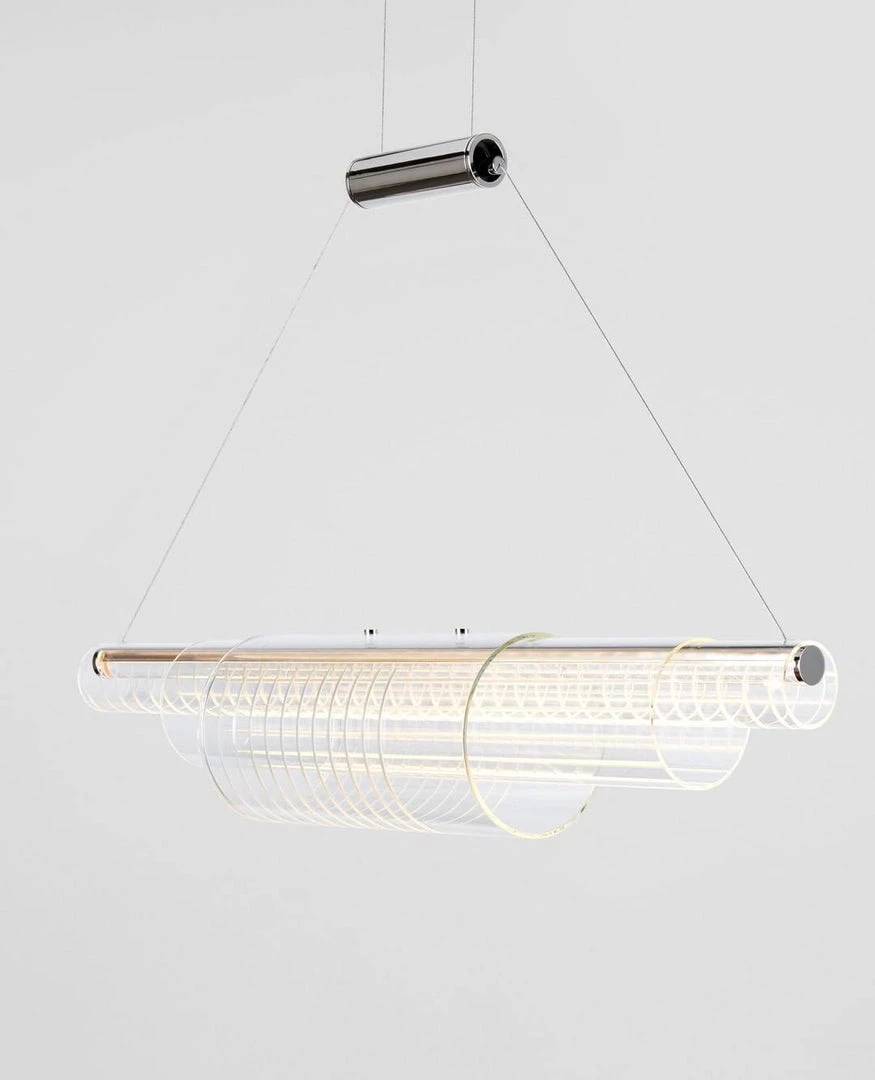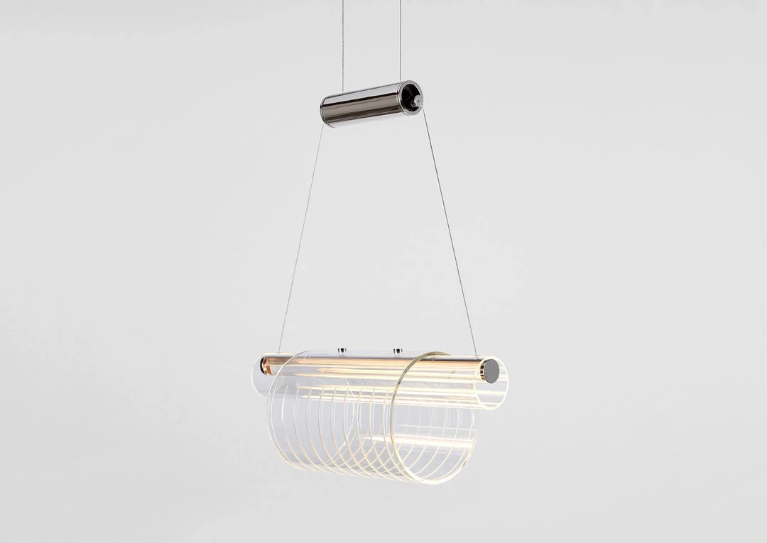 Coax is a coalescence of metal, glass, and light. The materials hang serenely, appearing weightless against each other. Cylindrical echoes of transparent glass surround a tube of light suspended in air.