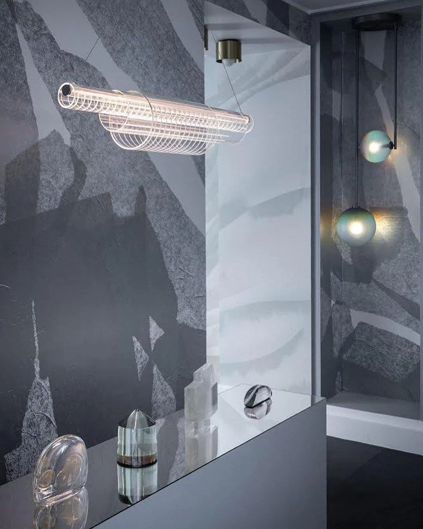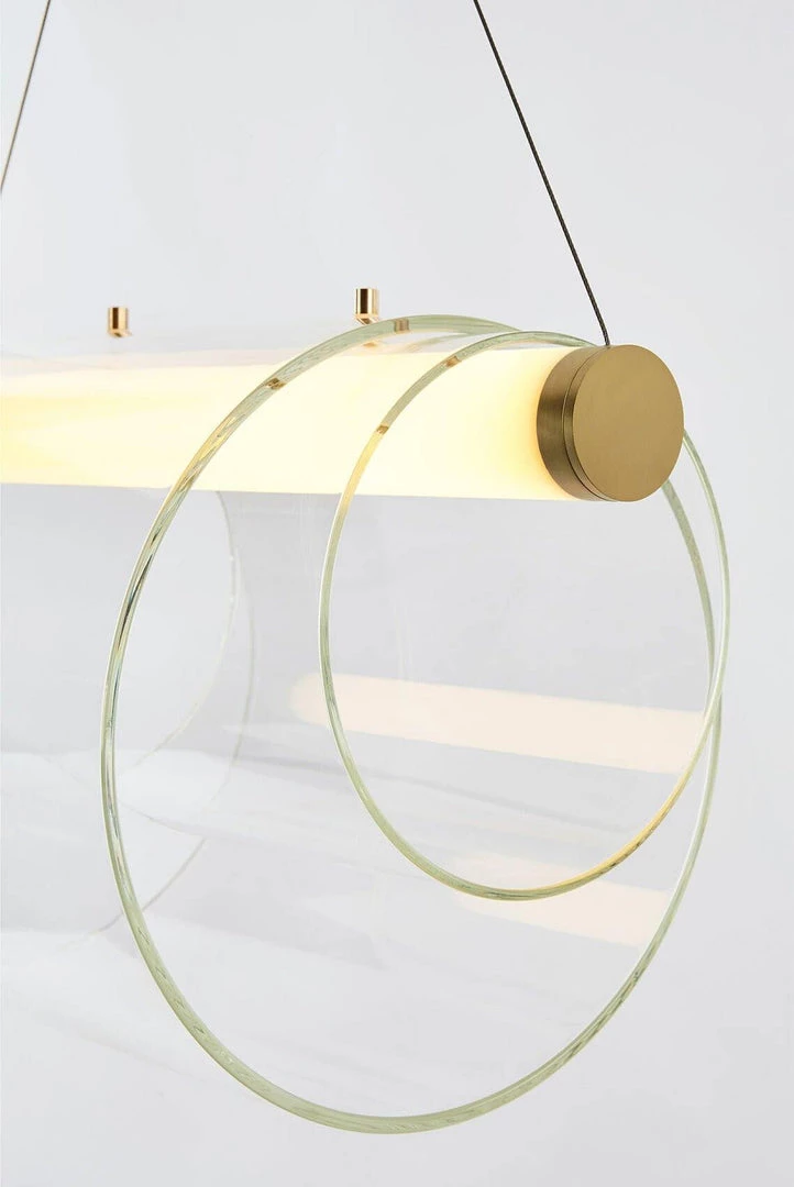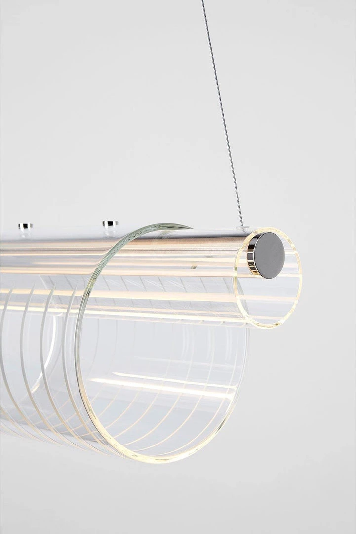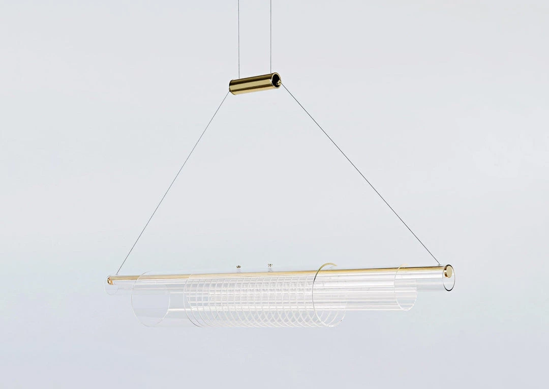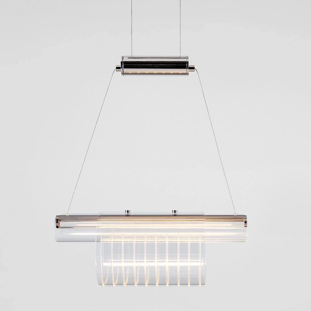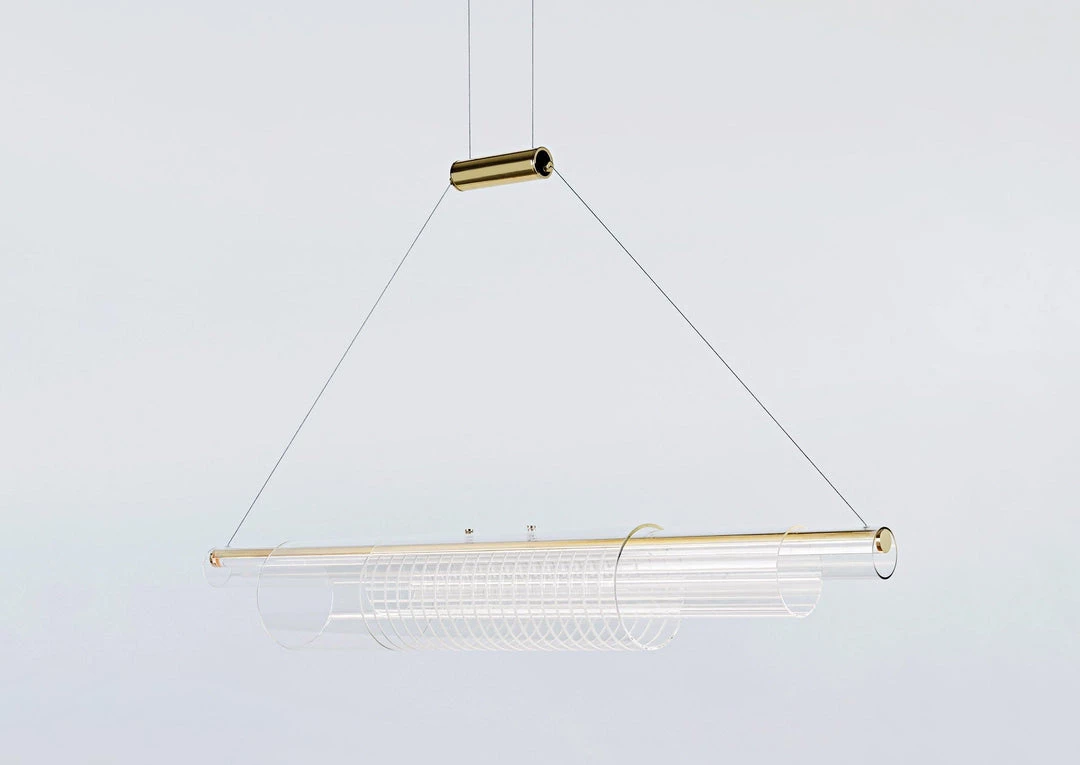 Coax is a coalescence of metal, glass, and light. The materials hang serenely, appearing weightless against each other. Cylindrical echoes of transparent glass surround a tube of light suspended in air.