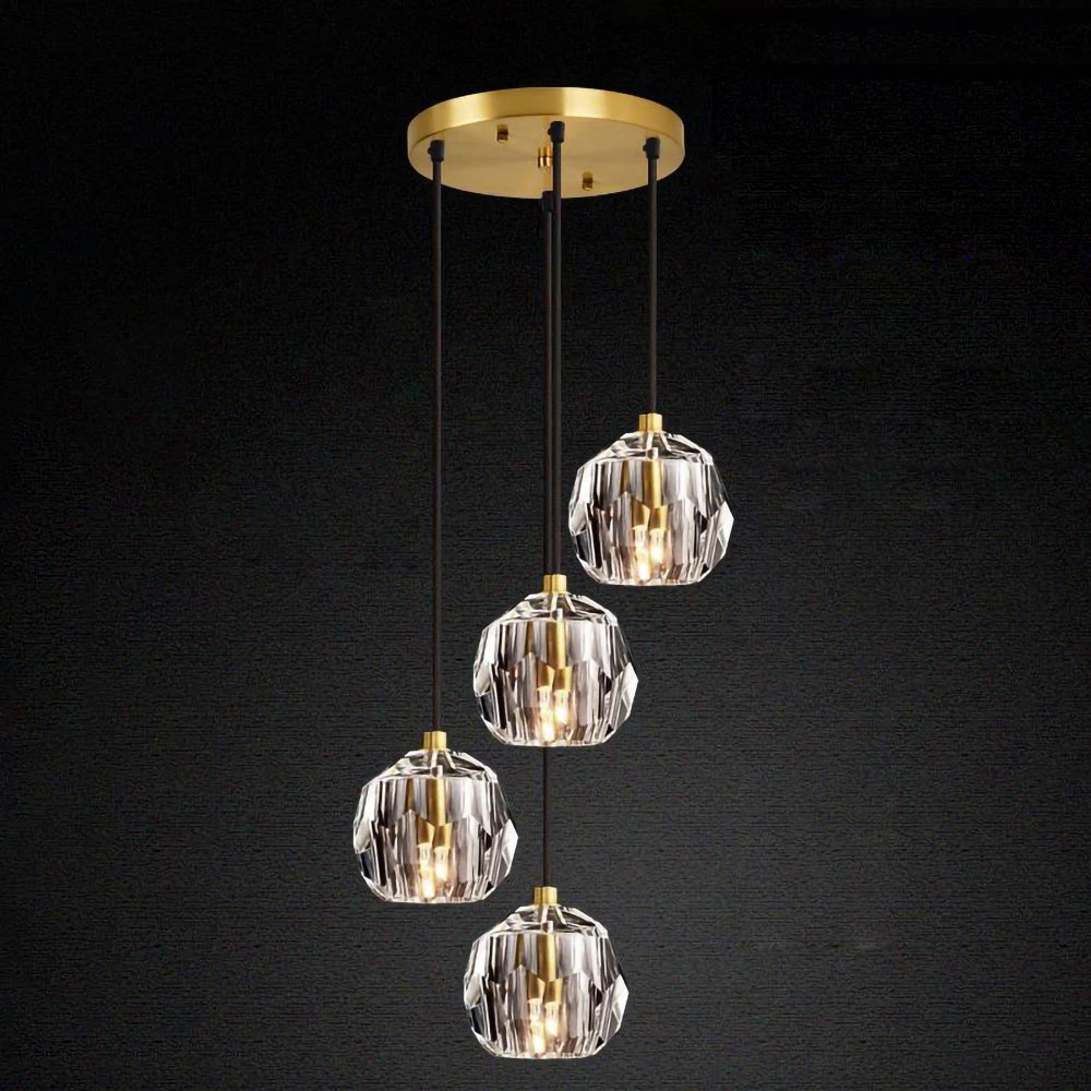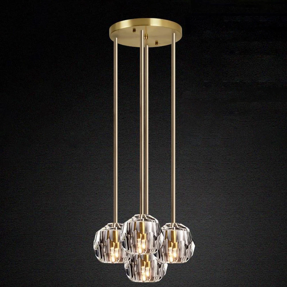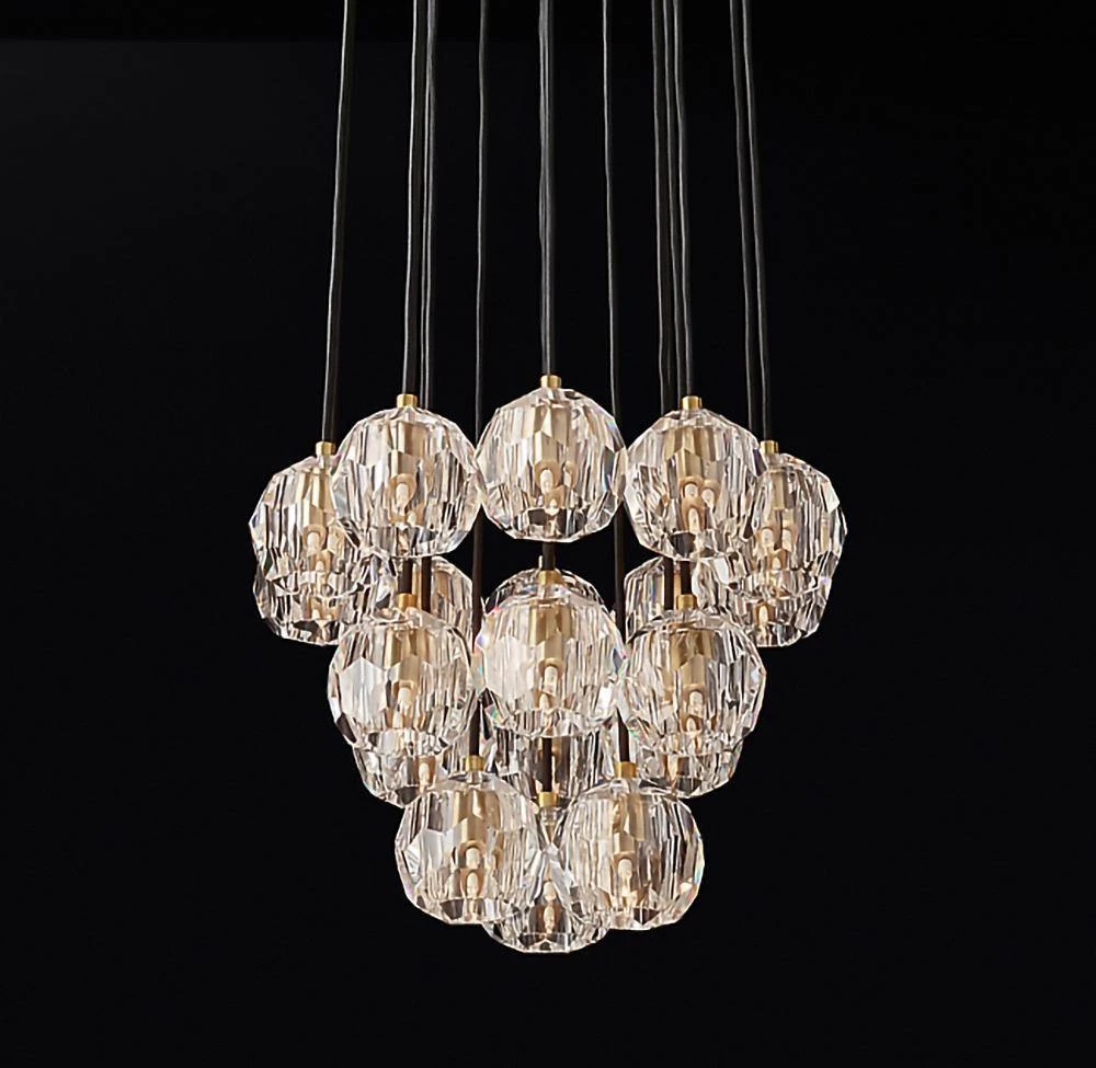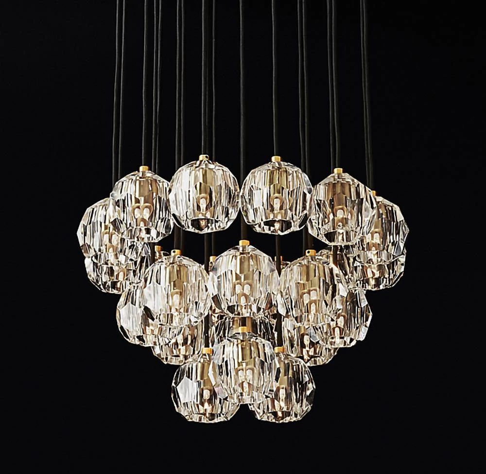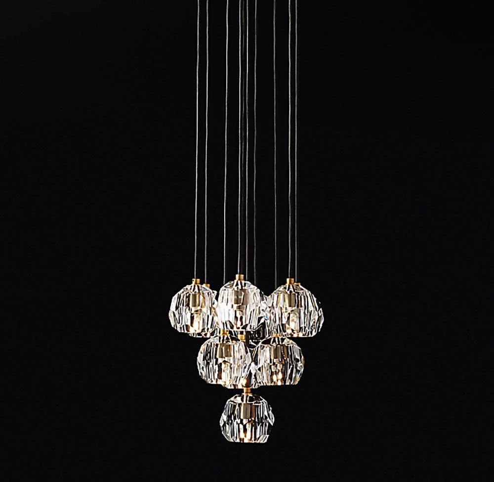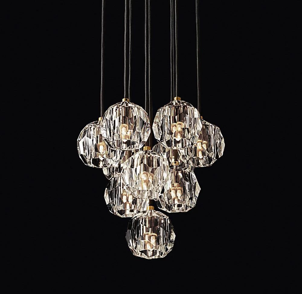 Crafted of solid brass and crystal glass, sculptural fixture is a testament to passion for luxe materials and superior craftsmanship. Evoking the minimalist spirit of the 1960s design, each finely faceted sphere is ground and polished by hand to reflect and refract the light.