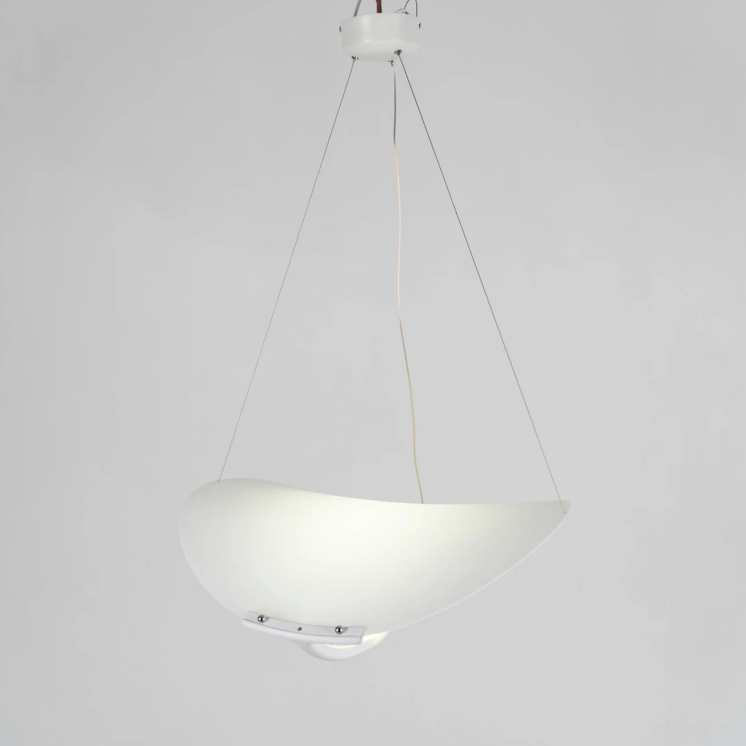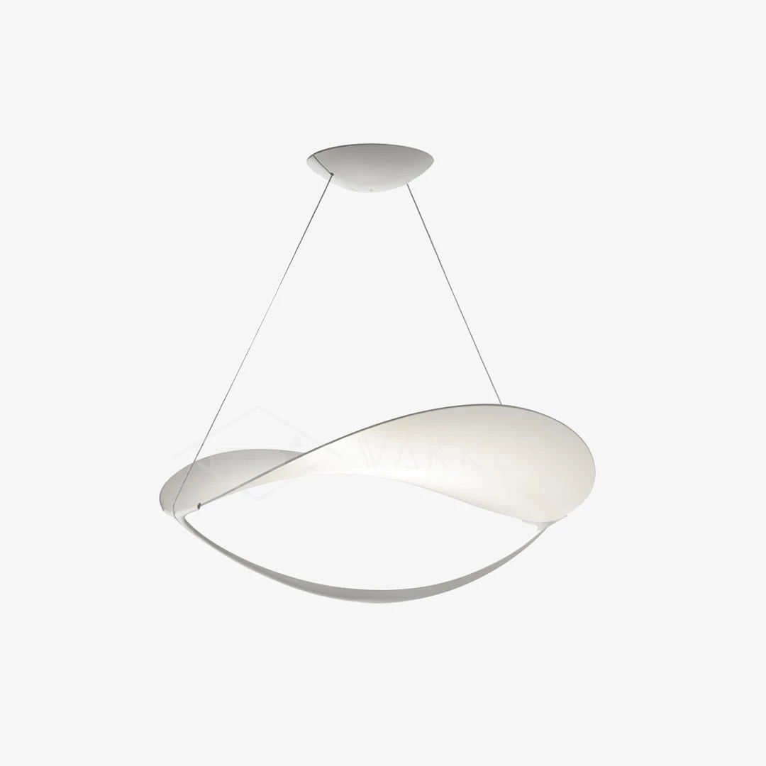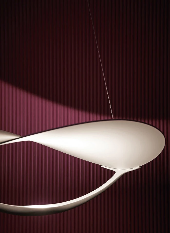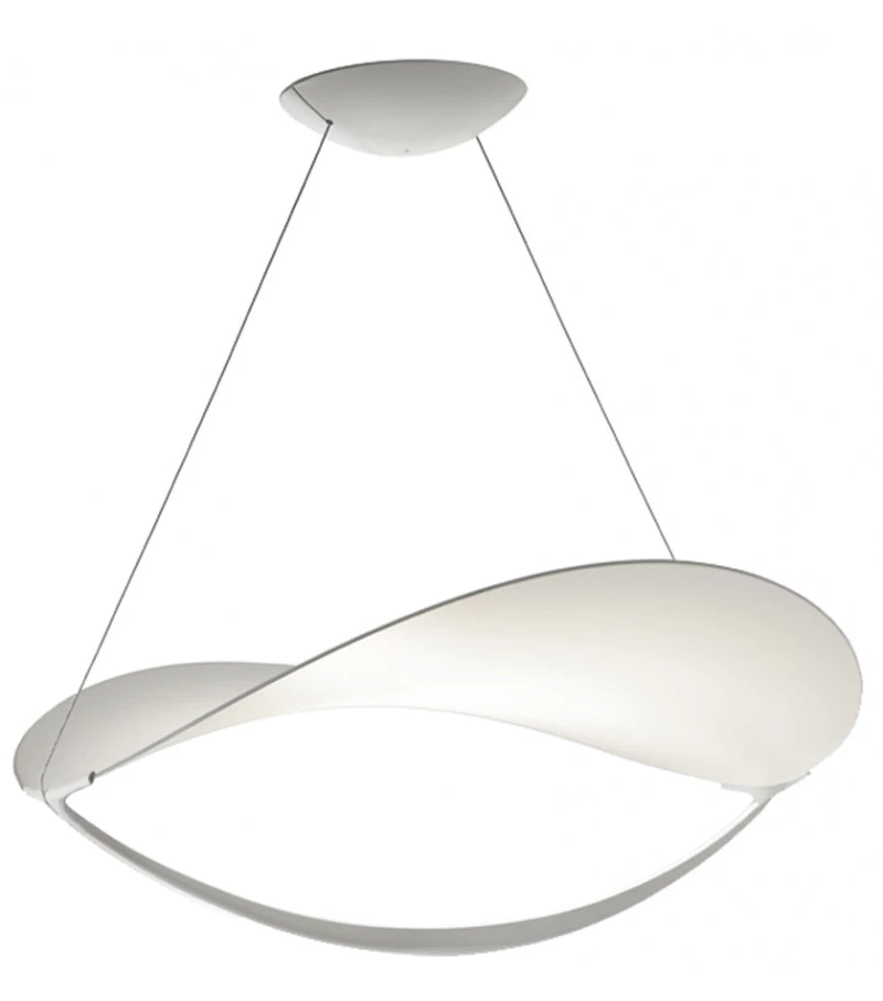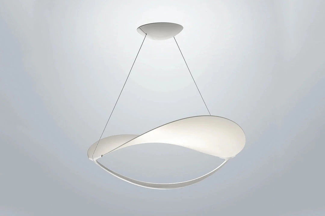 Plena, double lighting LED chandelier: diffused towards the ceiling and reflected on the level below. The dimensions of the PVC diffuser are generous, illuminating environments with a soft and enveloping light and, if placed above a table, never dazzles. The design is particular: the shape is that of a wavy disk with an arch below that acts as a heat sink, and it transmits a feeling of lightness and movement. Plena is suitable for lighting both domestic and commercial spaces. Available in white finish.
