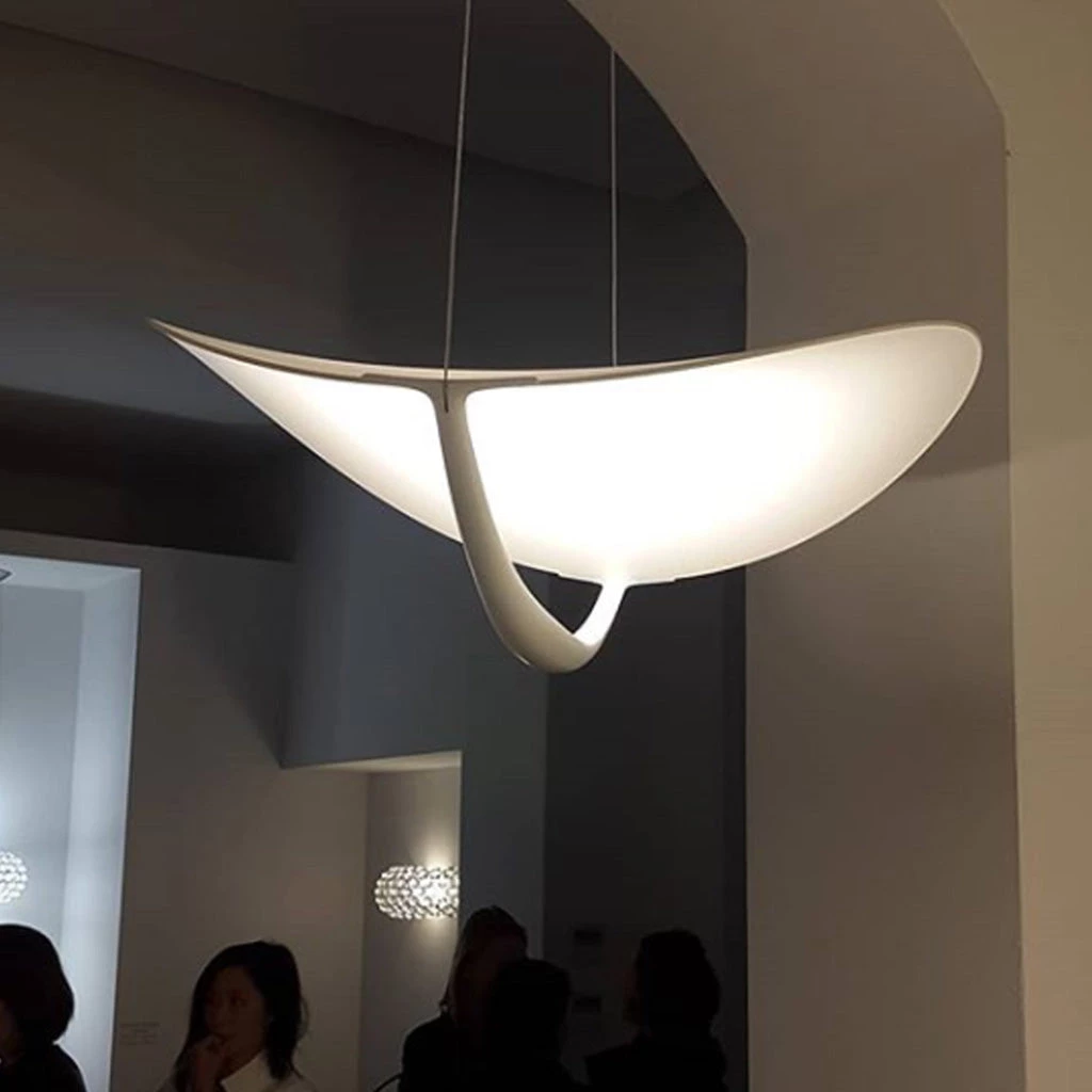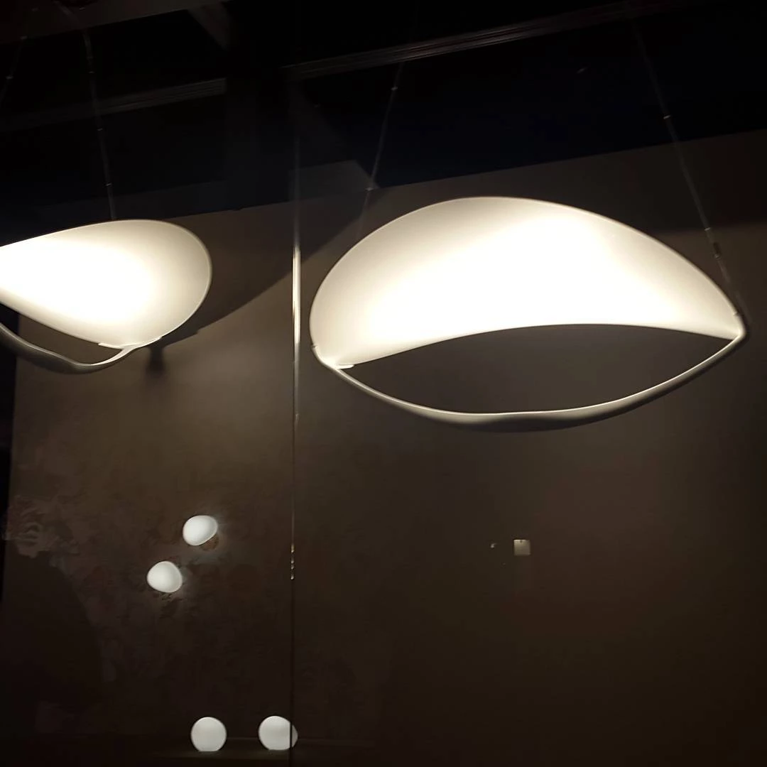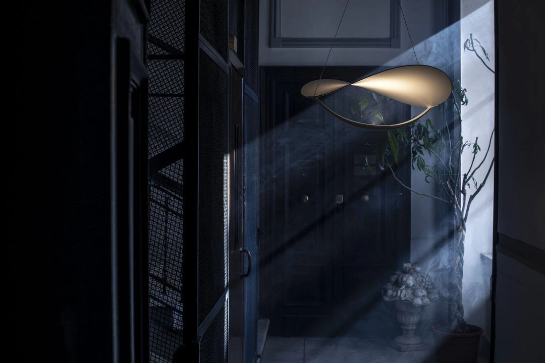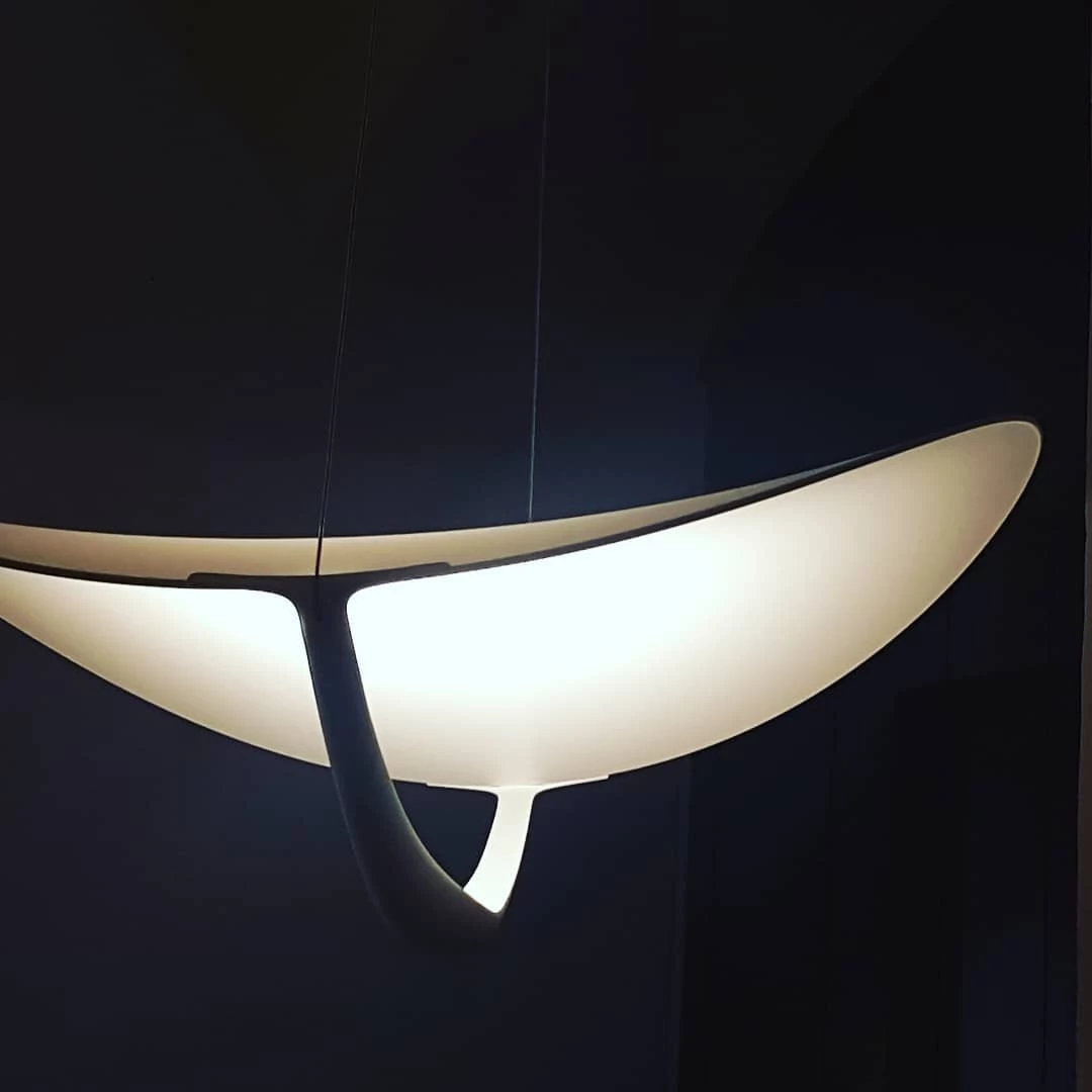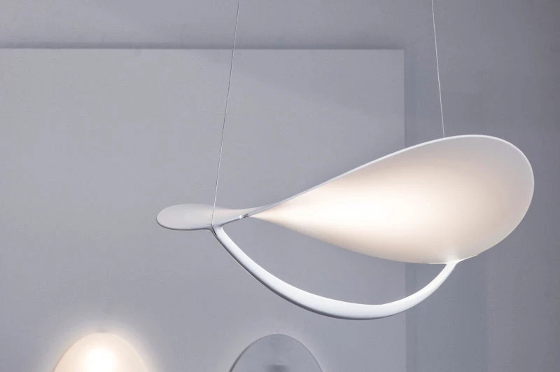 Plena, double lighting LED chandelier: diffused towards the ceiling and reflected on the level below. The dimensions of the PVC diffuser are generous, illuminating environments with a soft and enveloping light and, if placed above a table, never dazzles. The design is particular: the shape is that of a wavy disk with an arch below that acts as a heat sink, and it transmits a feeling of lightness and movement. Plena is suitable for lighting both domestic and commercial spaces. Available in white finish.