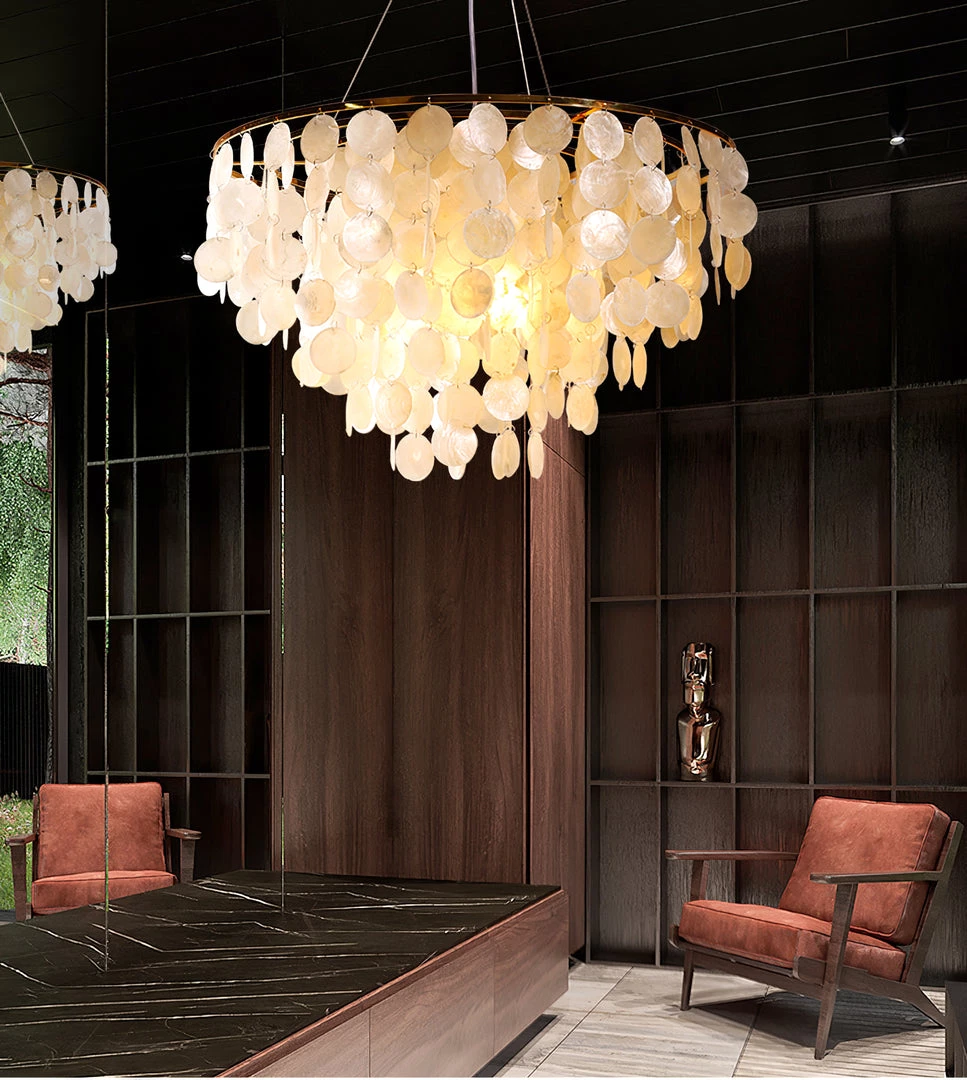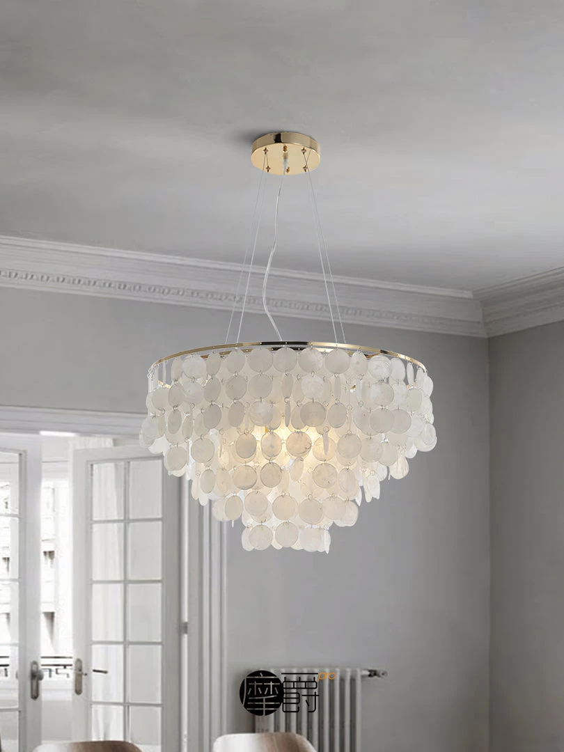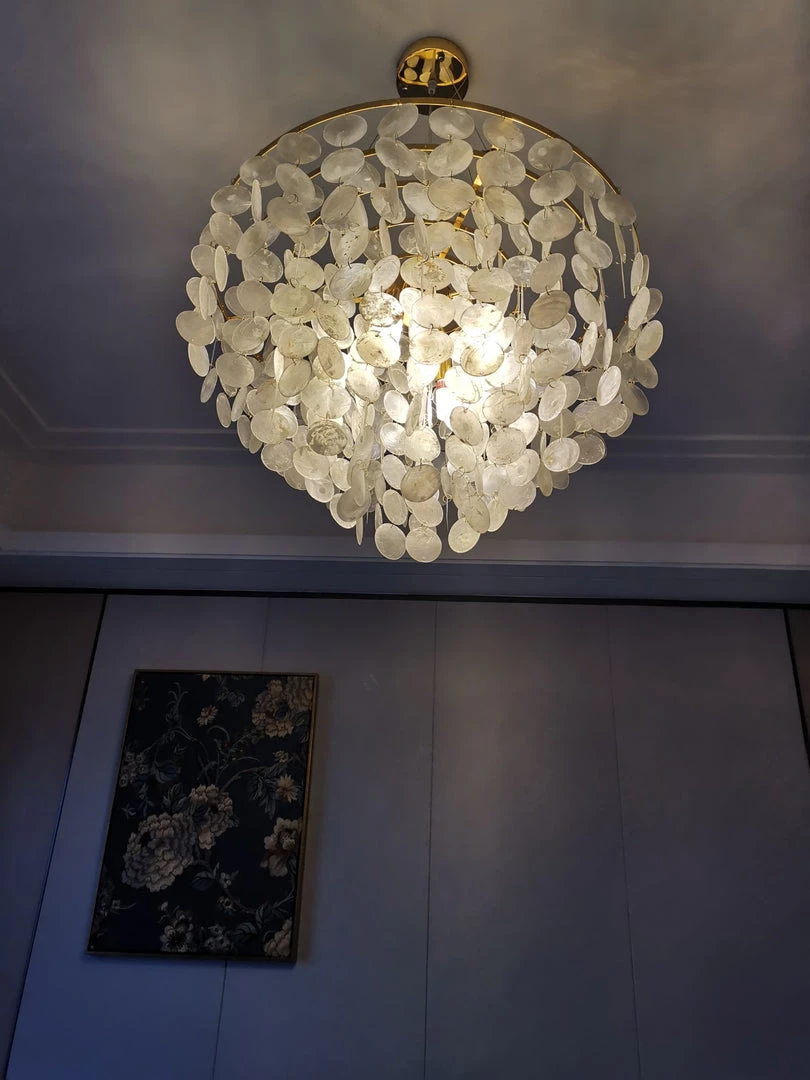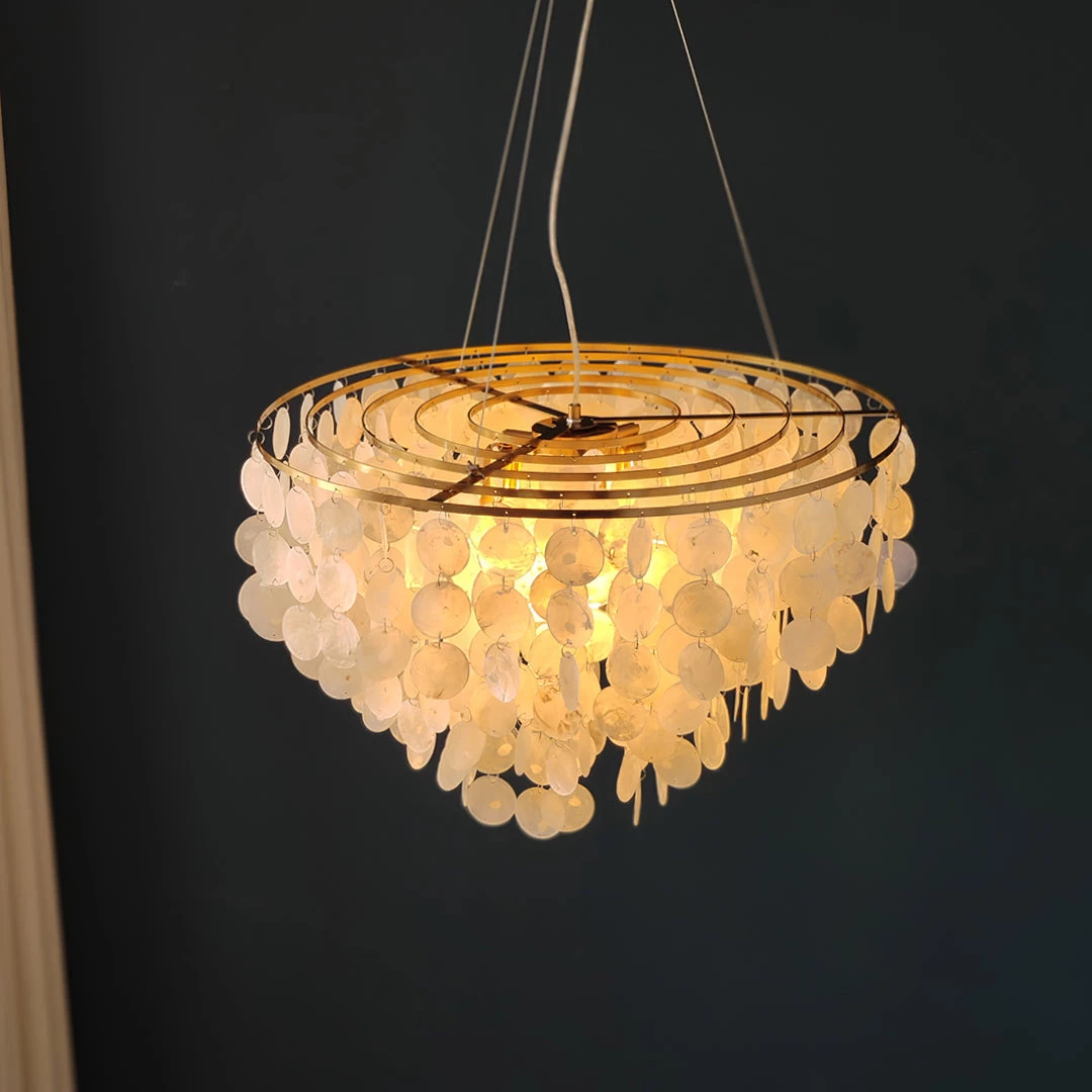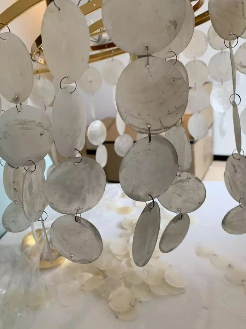 This can be made into a light chandelier Round 5 tier with Gold trim – WOW This beautiful wind chime Chandelier is made of hundreds of shells These Chandelier are a complement to any Room. patio or garden and gives a illusion of being by the sea.