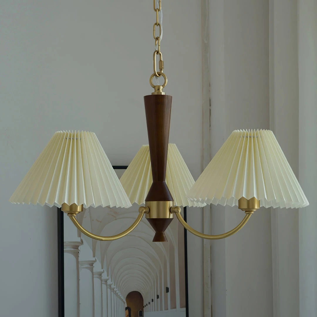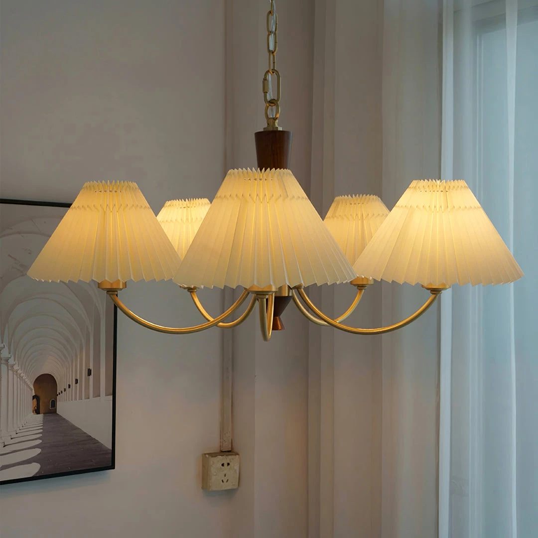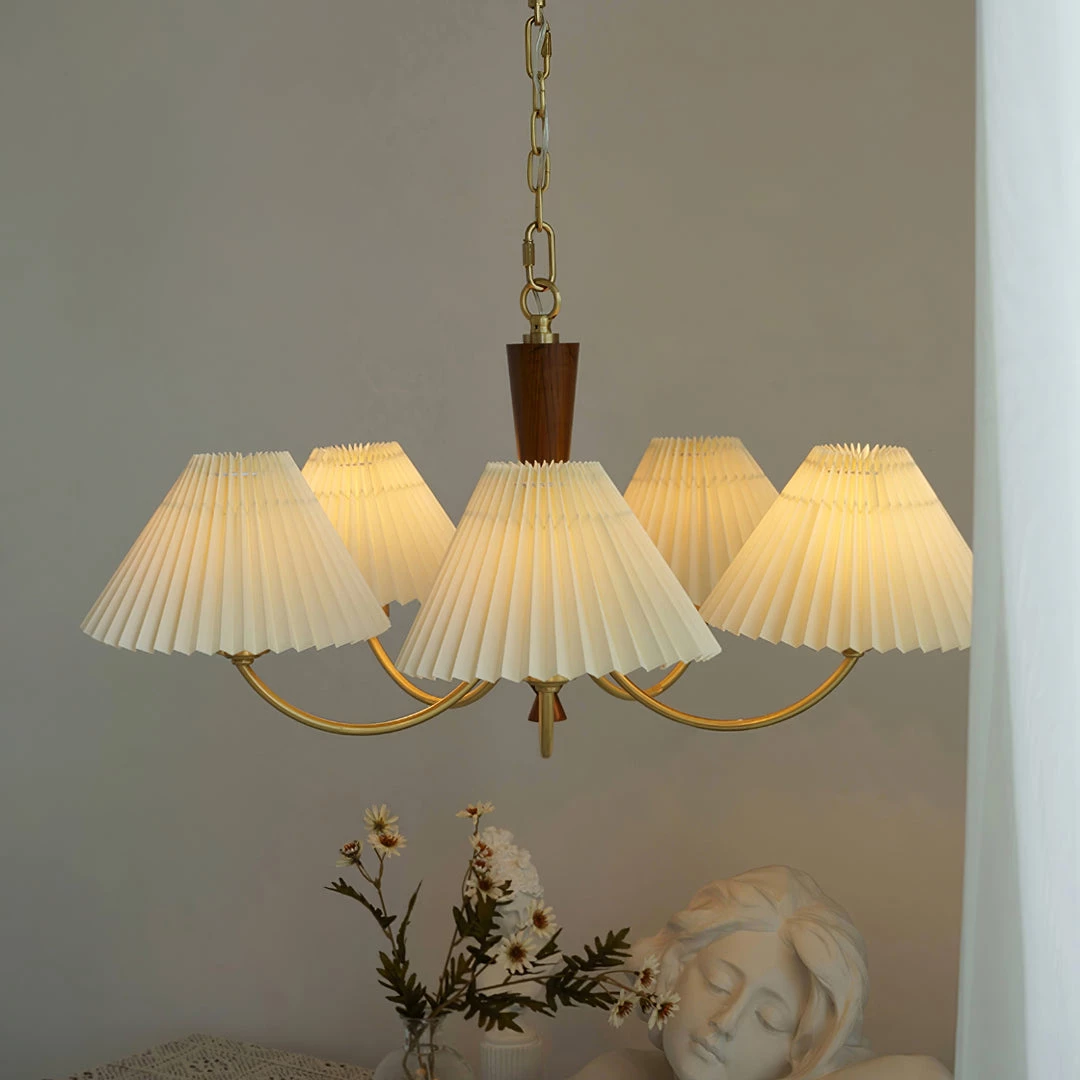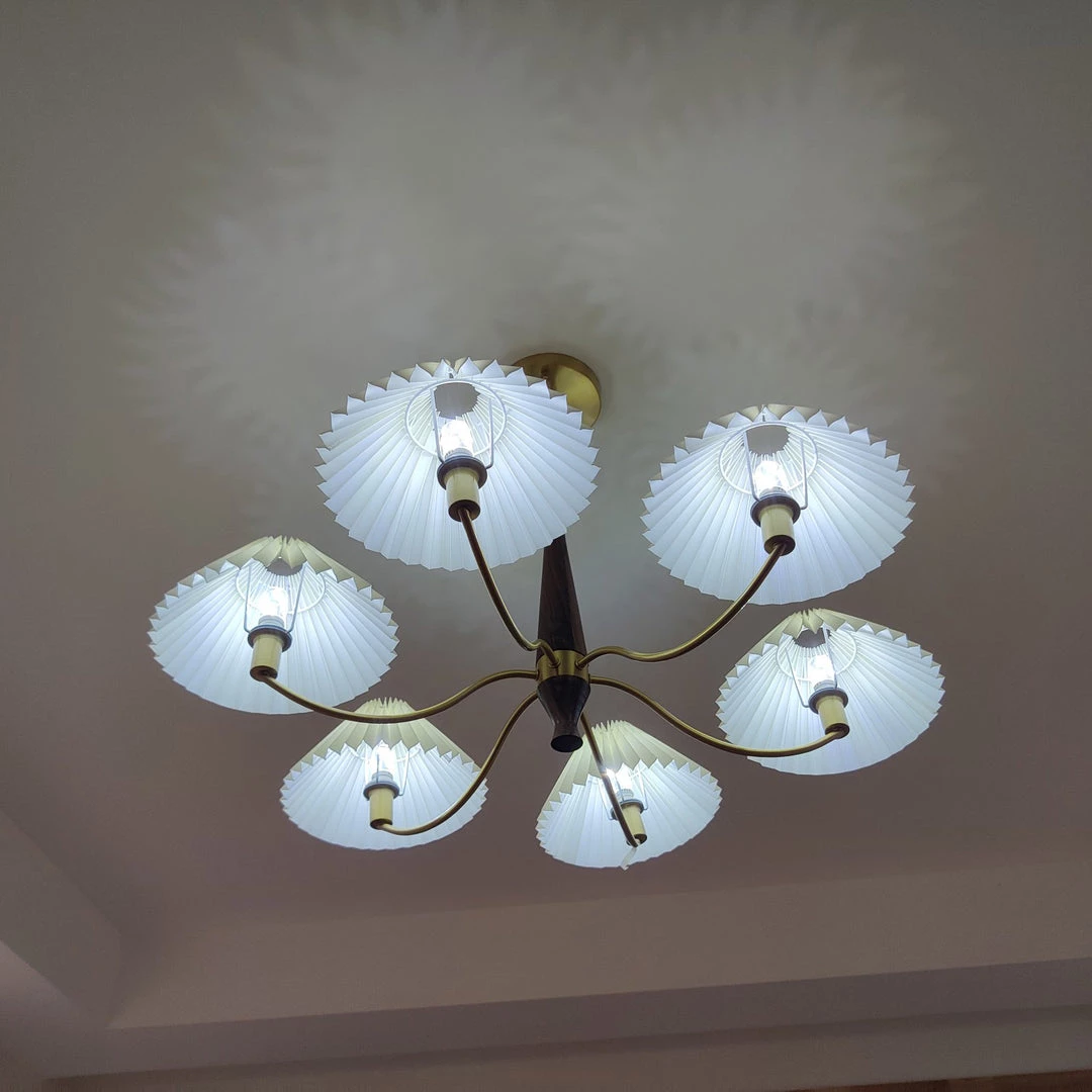 This chandelier impresses with its stylish design of curved arms and minimalist details. Its White pleated lampshade in an look skilfully round off the overall picture.
