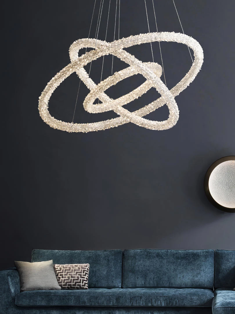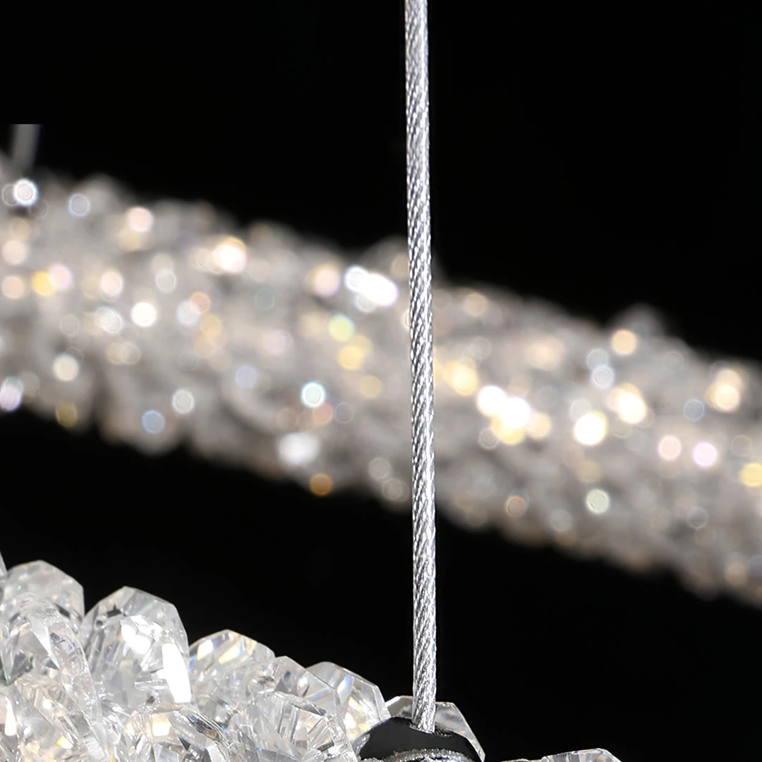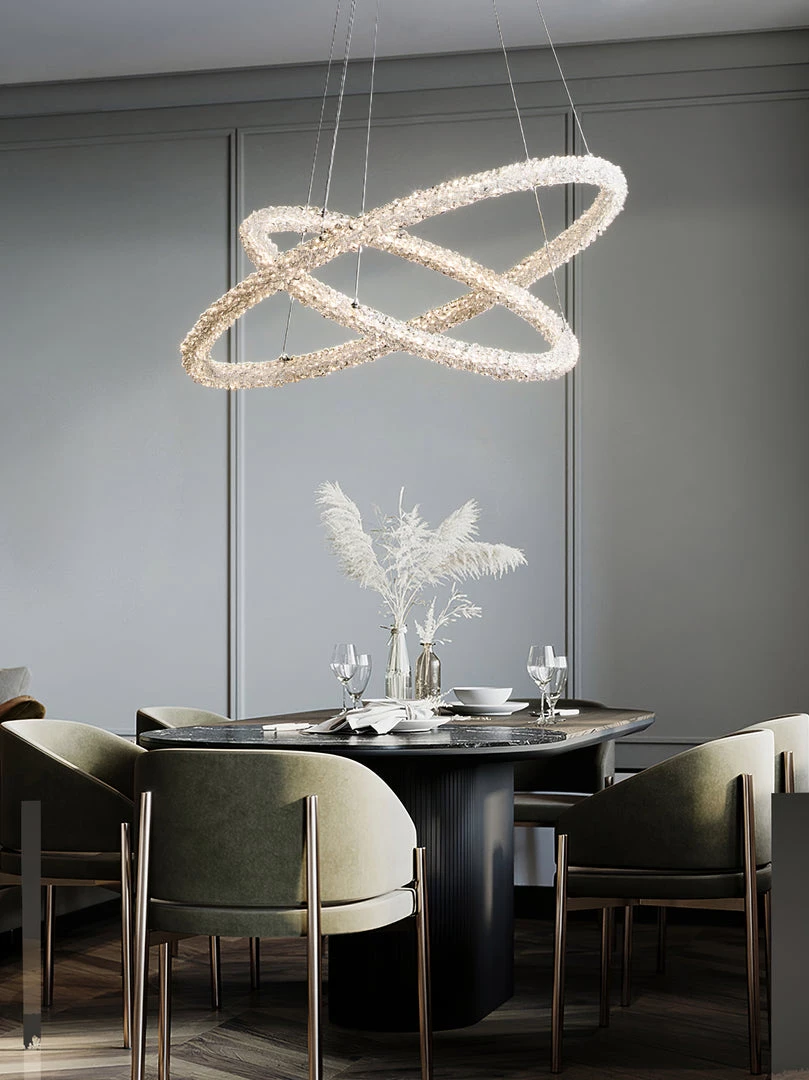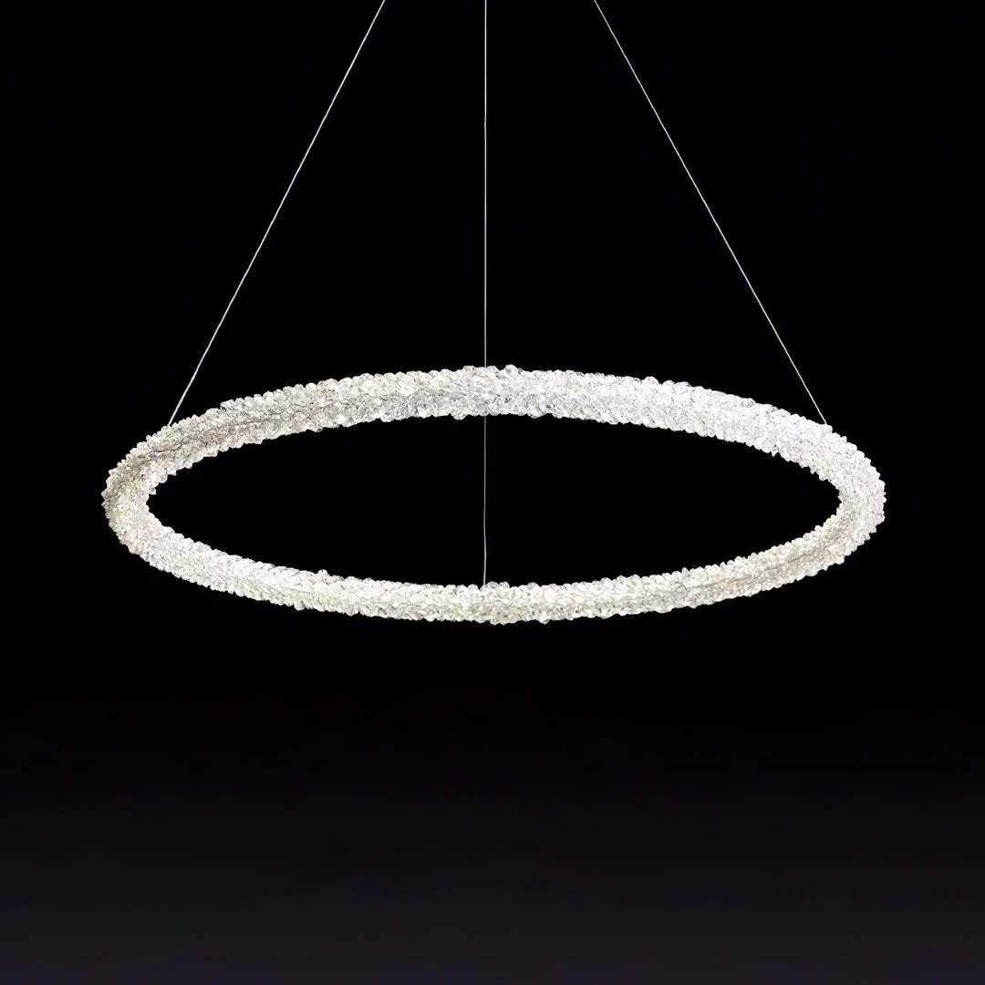 A charming silhouette with a hint of energy and whimsy delivers an uplifting, glamorous look with character. Stylize a modern space with this decadent island chandelier fashioned from Iron lamp body and a chic looped bar of crystal accents. An artful offering from Ring Crystal Chandeliers by designer, its impressive profile draws attention and starts conversations. This elegant fixture features energy-efficient LED technology.
