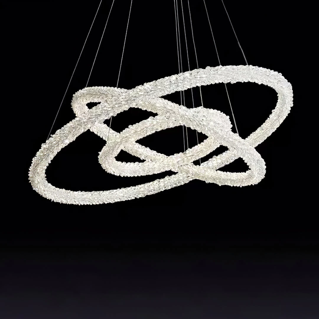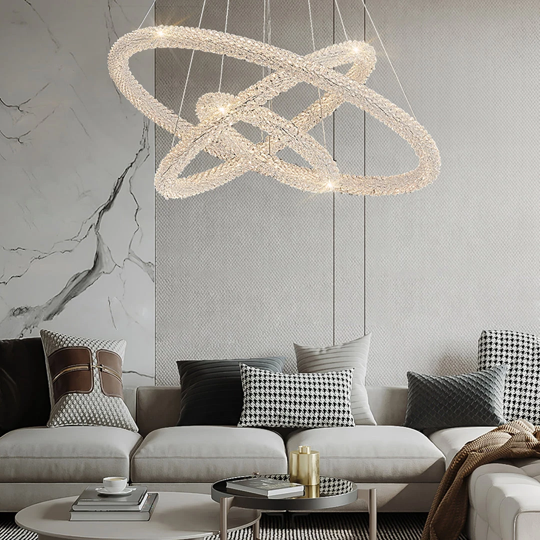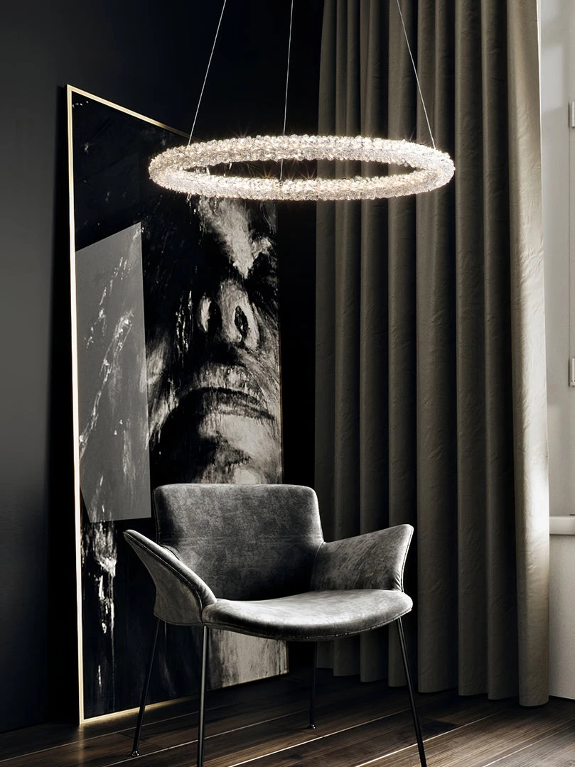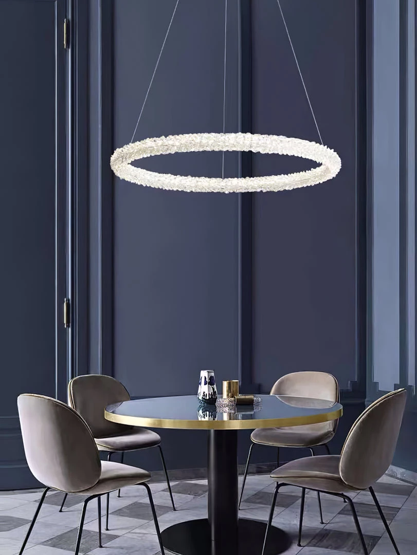 A charming silhouette with a hint of energy and whimsy delivers an uplifting, glamorous look with character. Stylize a modern space with this decadent island chandelier fashioned from Iron lamp body and a chic looped bar of crystal accents. An artful offering from Ring Crystal Chandeliers by designer, its impressive profile draws attention and starts conversations. This elegant fixture features energy-efficient LED technology.