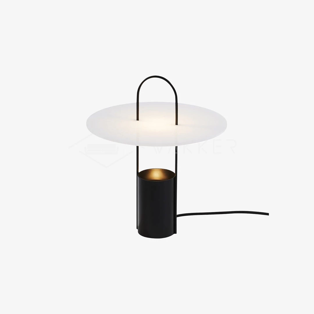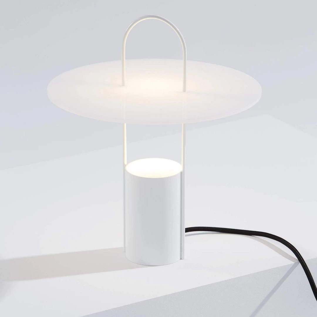 Composed of two distinct elements: a cylindrical lacquered metal base with carry handle, and a removable translucent plexiglass diffuser. The bulb is hidden in the base, while the translucent disc catches and diffuses the light to cast a warm, cosy glow.