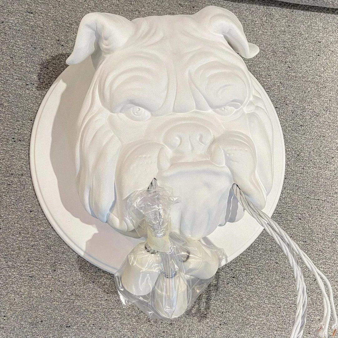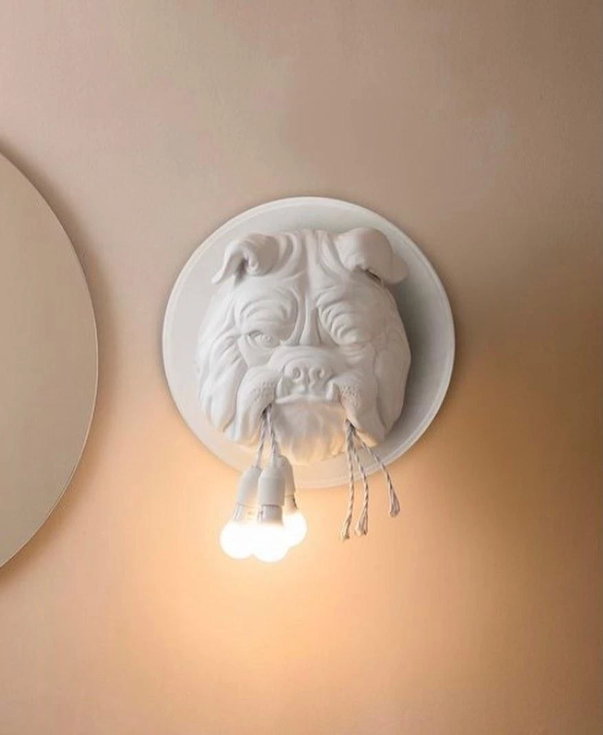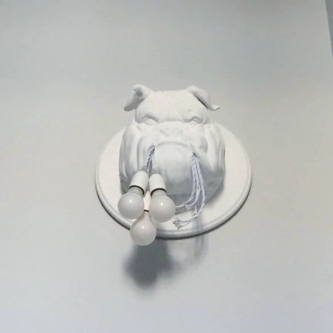 The Amsterdam Wall Sconce is part of a series of pieces that examine nature’s relationship to man. this fixture showcases the bust of an expressive bulldog rising from the wall to hold a ripped cluster of light bulbs in his mouth. Its resin composition adds to its structural detailing while the smooth matte finish lends a classic element. The light bulbs emit a warm glow that highlights the fine details within the bulldog’s angered expression.