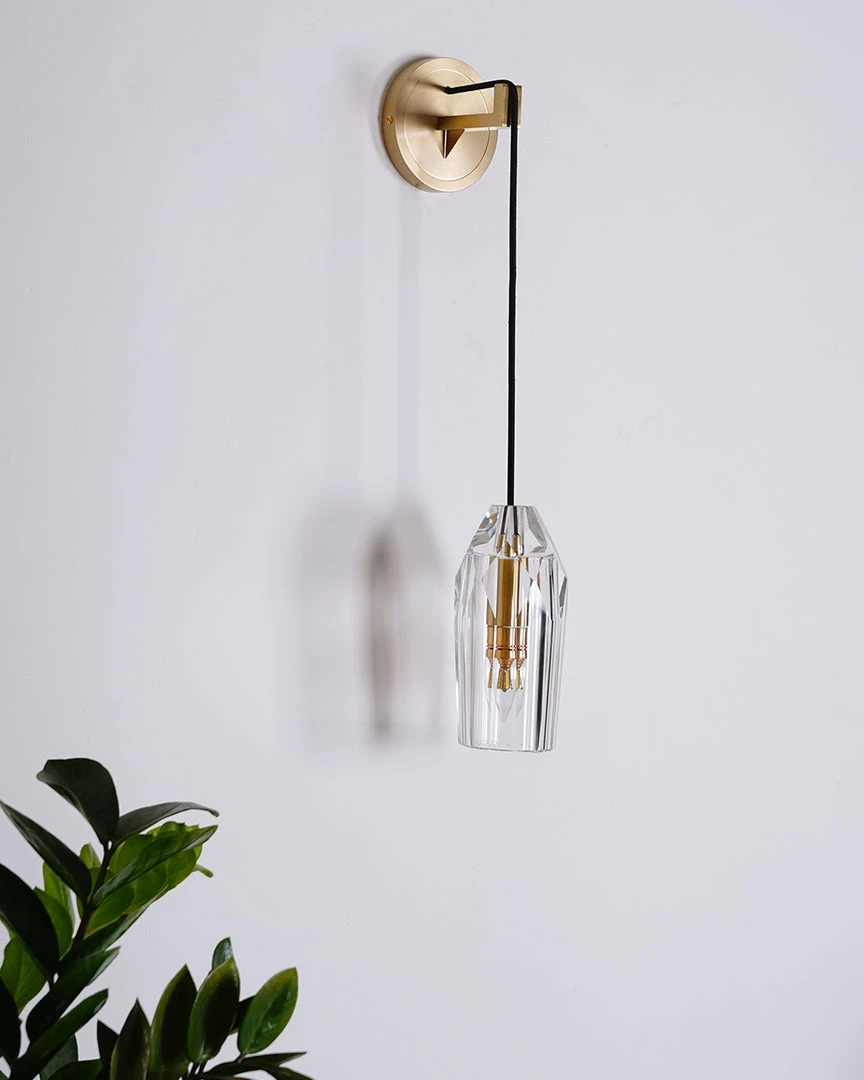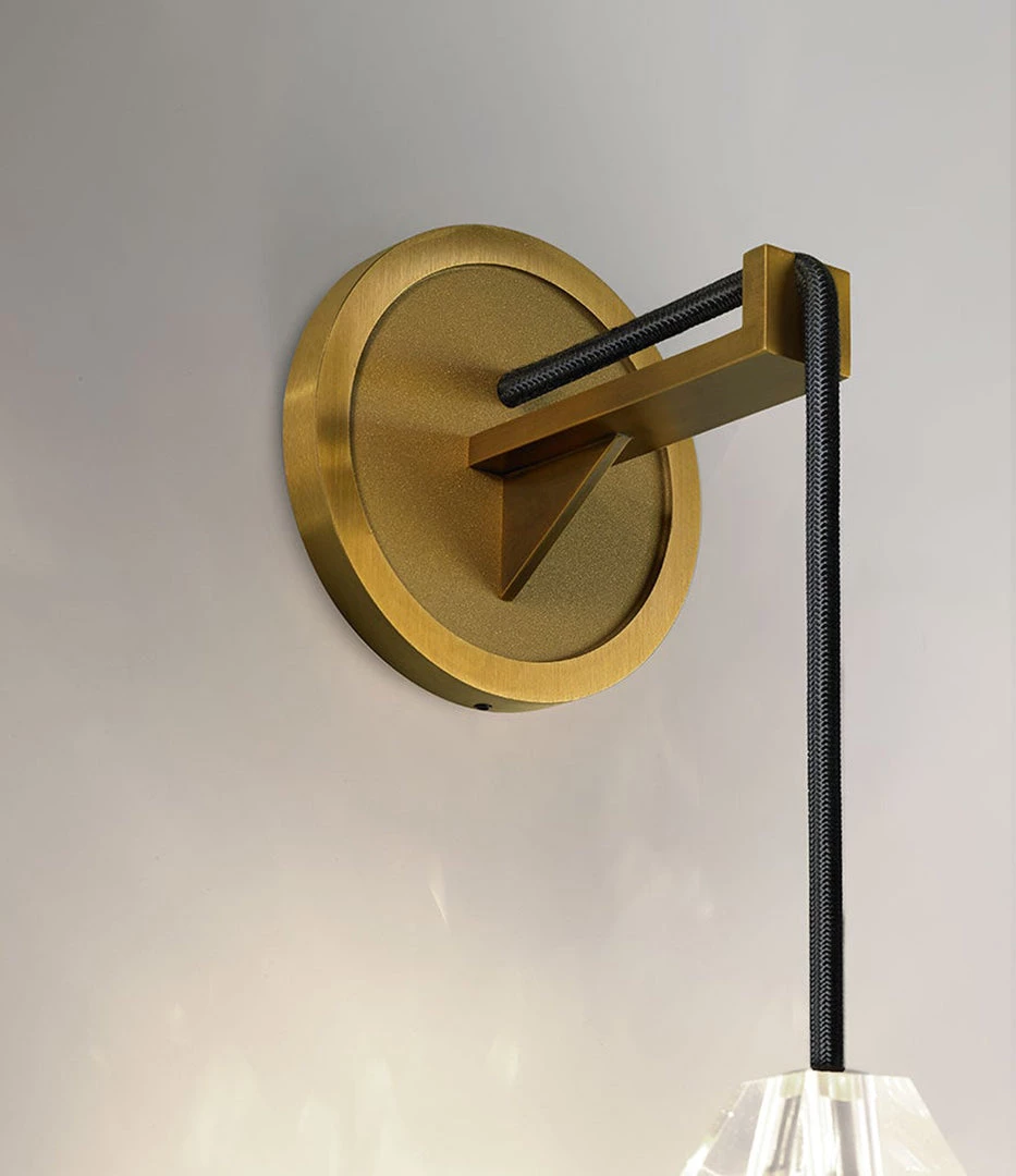 The Chatelet Sconce is machined from solid brass. All parts are hand polished and patina’d. The lead crystal shade is hand carved and polished.