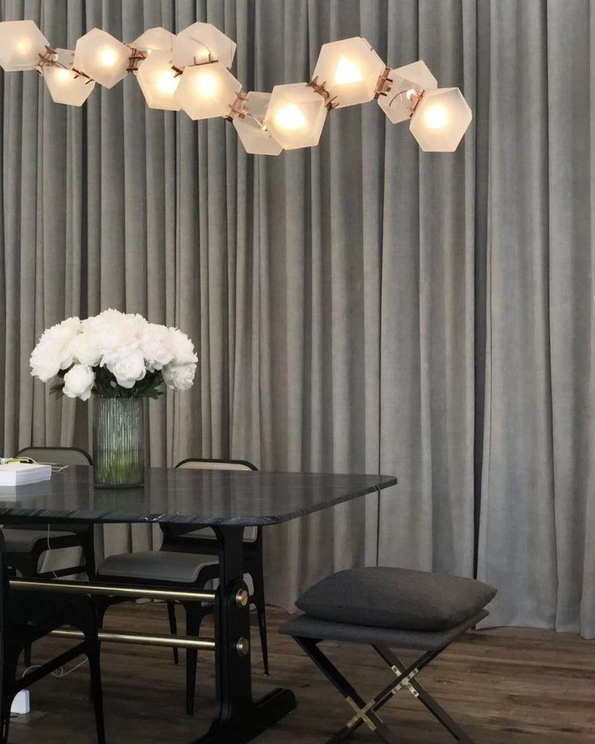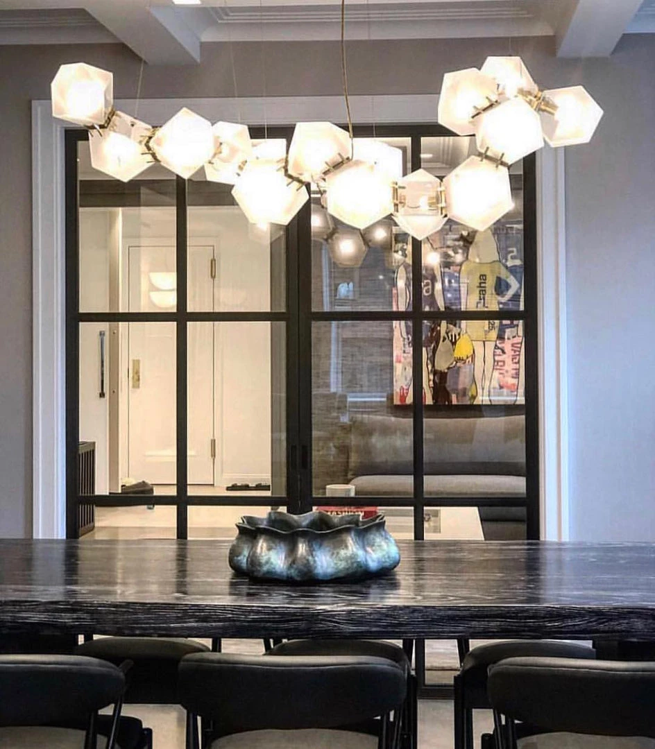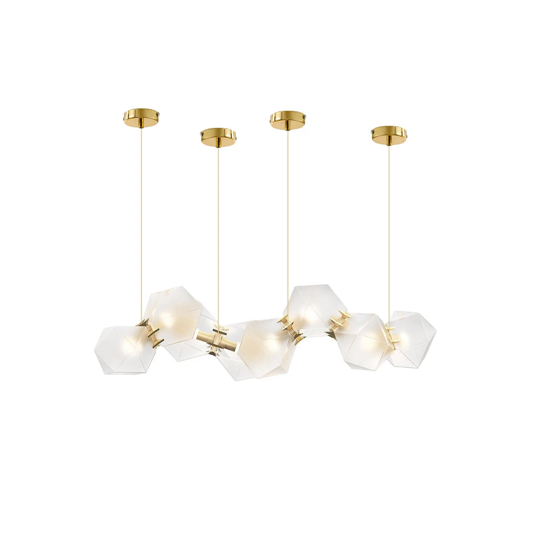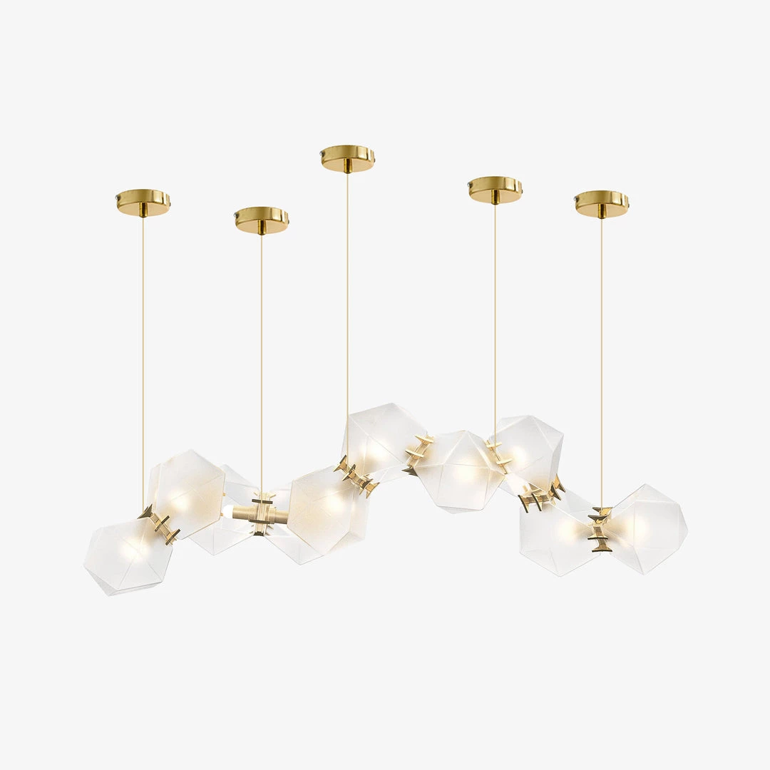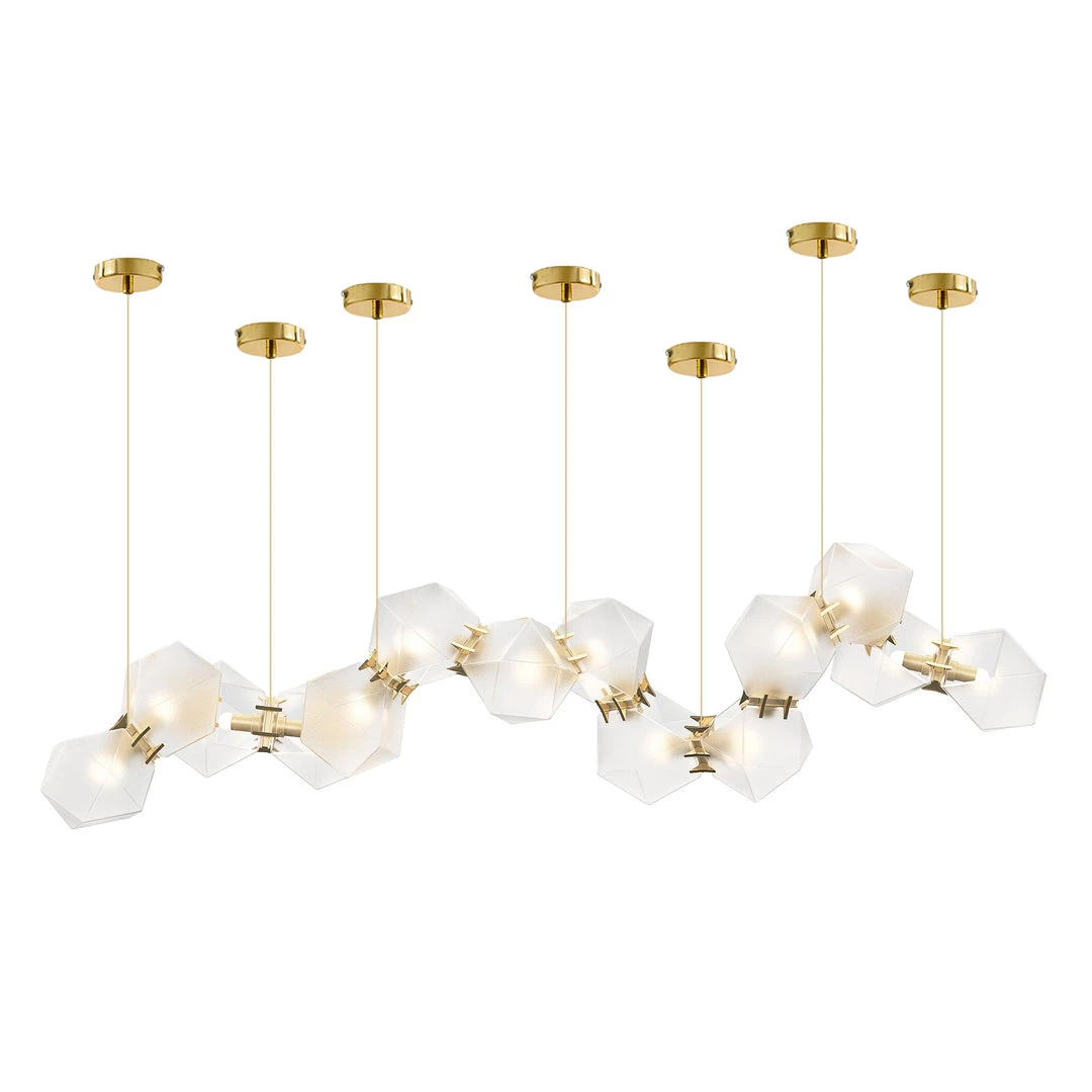 A modern piece that showcases expert craftsmanship, a series of hollowed polygons branch out into a modular system of interconnected configurations. The new textured glass finish distorts light and creates magical optical illusions when looking through the glass.