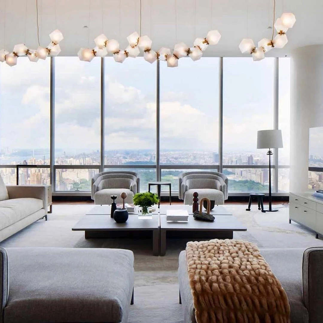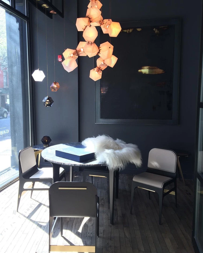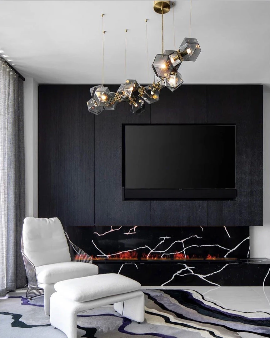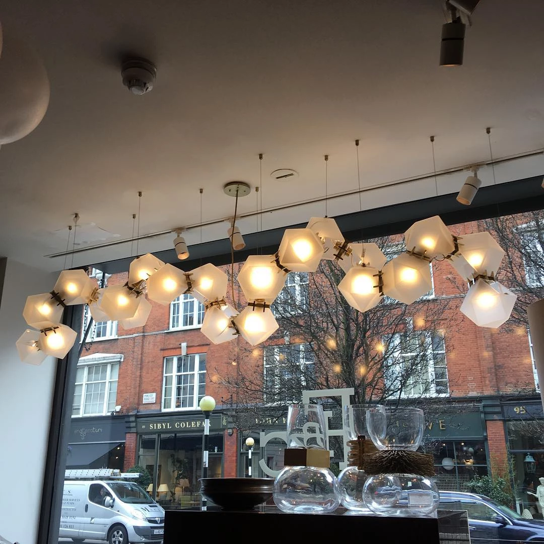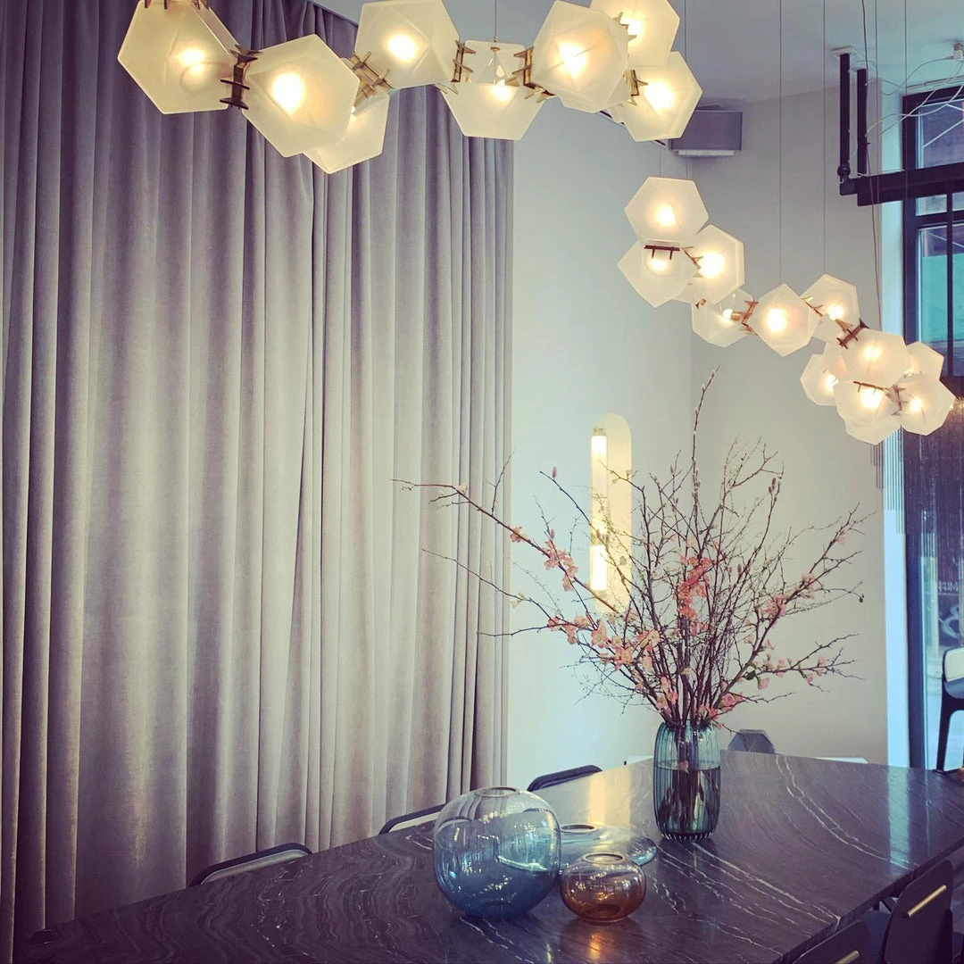 A modern piece that showcases expert craftsmanship, a series of hollowed polygons branch out into a modular system of interconnected configurations. The new textured glass finish distorts light and creates magical optical illusions when looking through the glass.